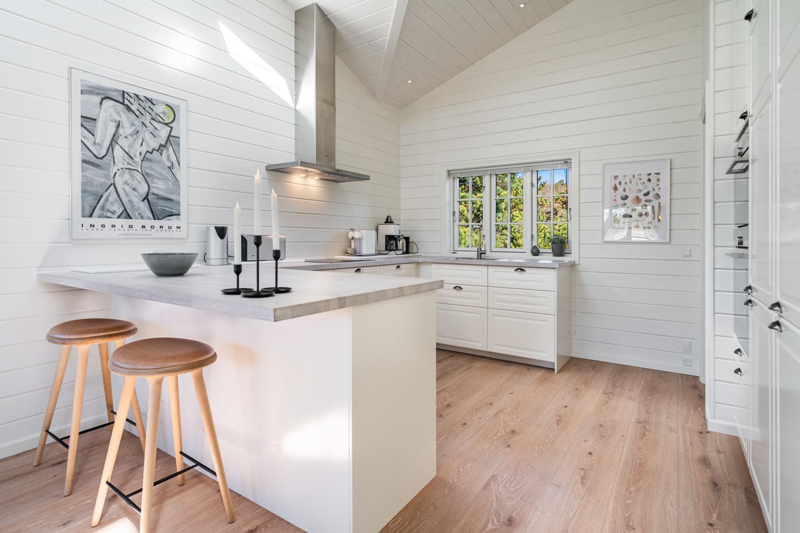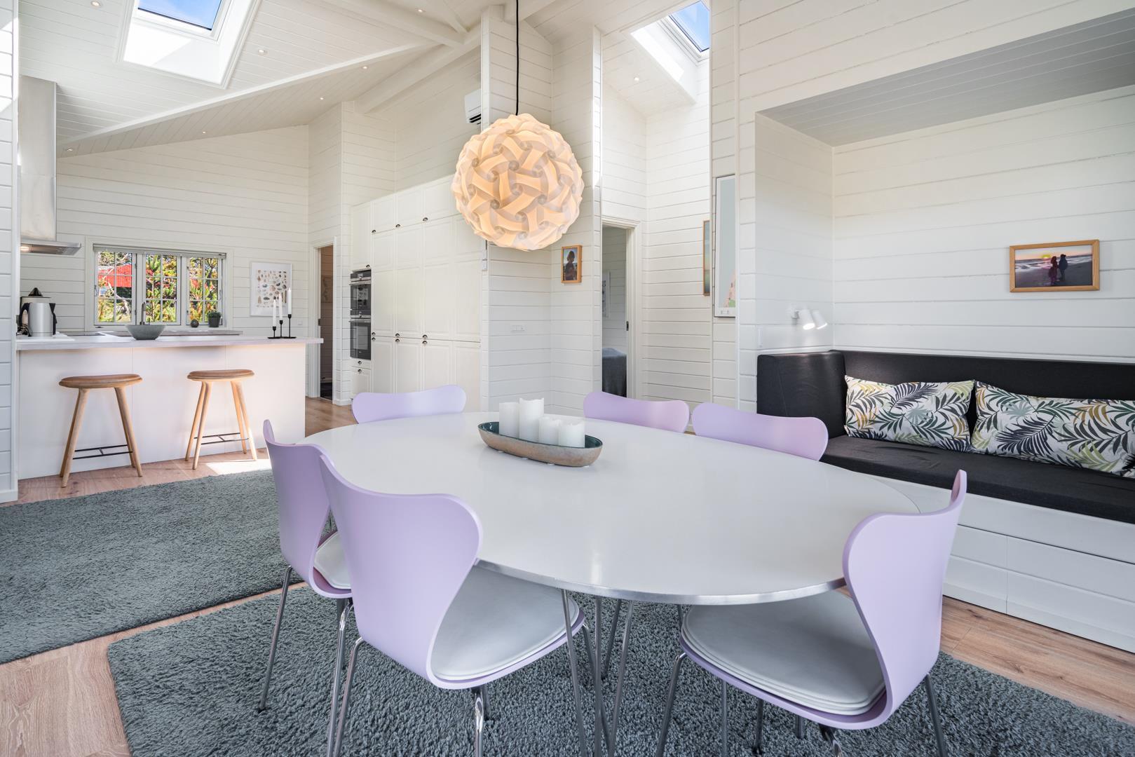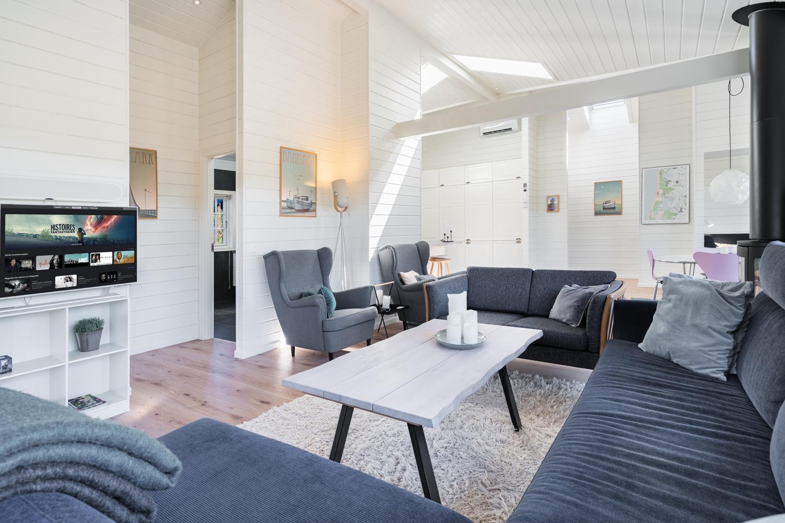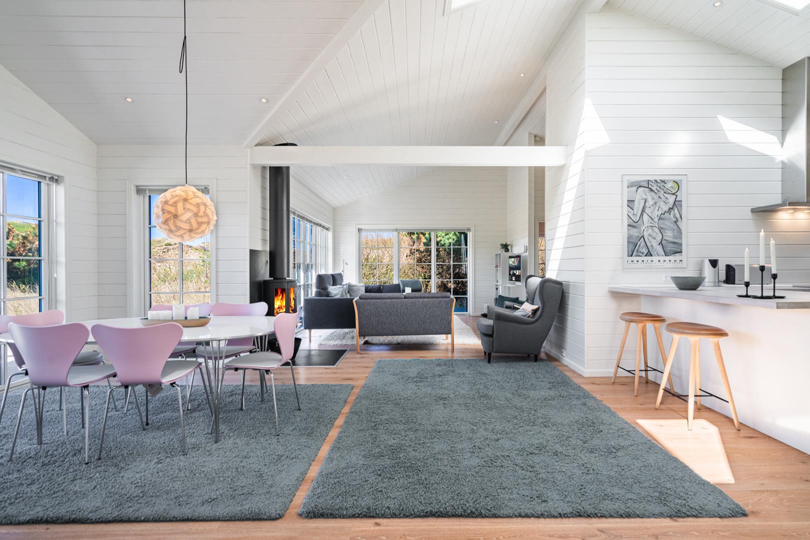 Husets hjerte er det store opholdsrum, som består af stue og køkken i åben forbindelse. Her er flere hyggekroge og god plads til at udfolde sig gastronomisk i fællesskab.