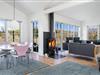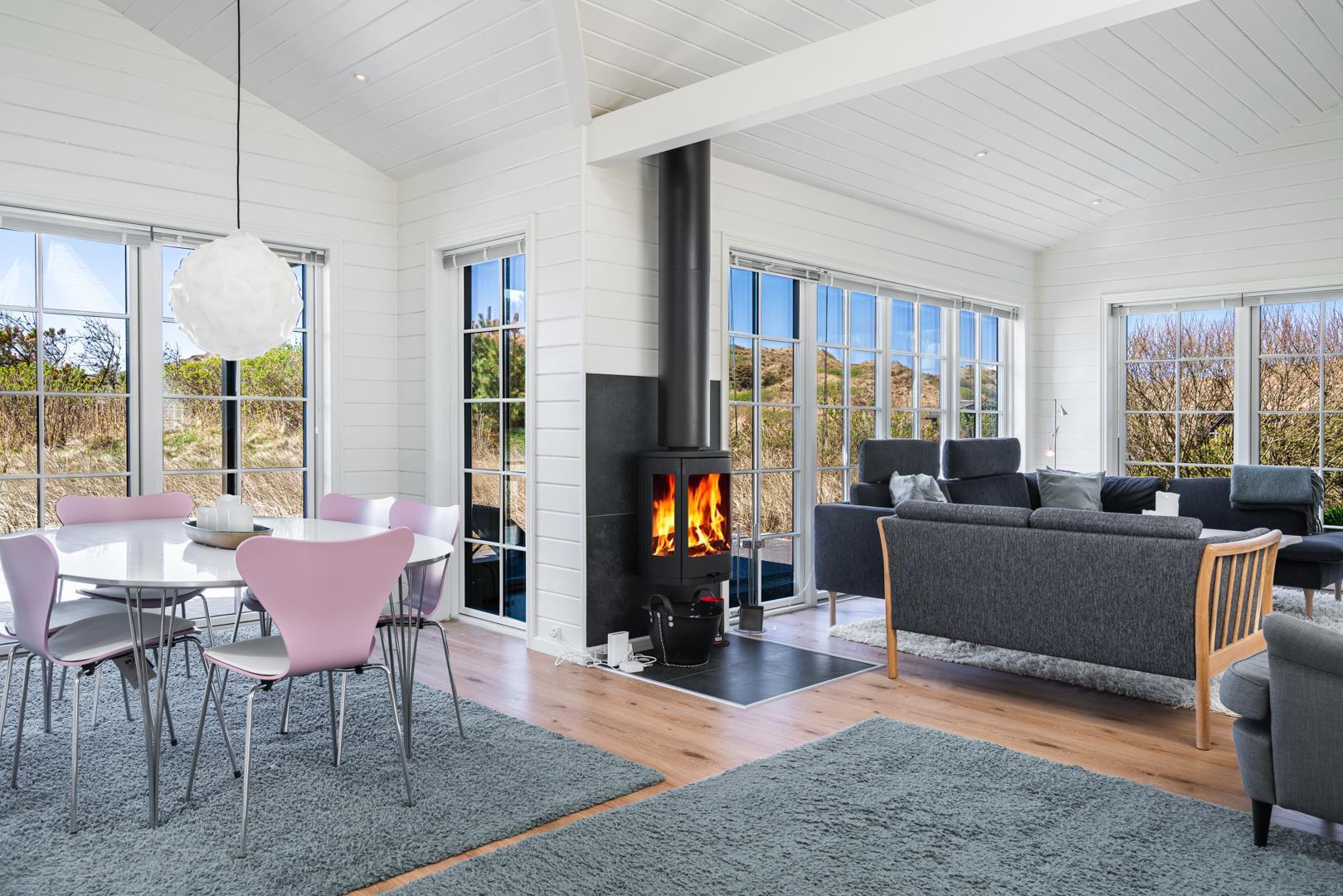 Sommerhuset passer perfekt ind i de idylliske omgivelser med sin sortmalede træbeklædning og sprossevinduer. Kæmpestore vinduespartier og flere ovenlysvinduer sørger for et helt unikt lysindfald, der kan opleves i alle rum. Trævægge og lofter bidrager til den særlige sommerhusatmosfære, og en brændeovn i stuen spreder varme og hyggelig stemning.