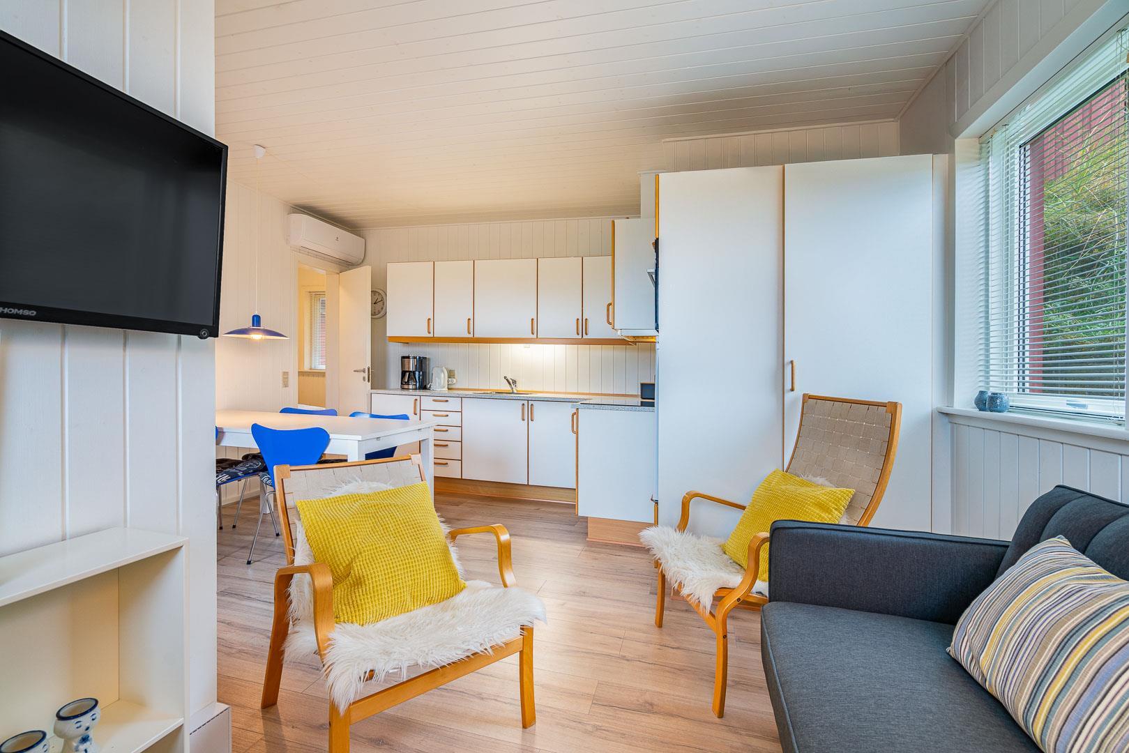 Hyggelig, vedligeholdt og smagfuldt indrettet ferielejlighed med god køkken/alrum, badeværelse samt to soverum. Fra stuen er der direkte udgang til ugeneret sydvestvendt terrasse, hvor solen kan nydes til langt ud på aftenen. Fællesvaskeri kan benyttes uden ekstra betaling. Ferielejligheden er Ikke egnet for gangbesværede.