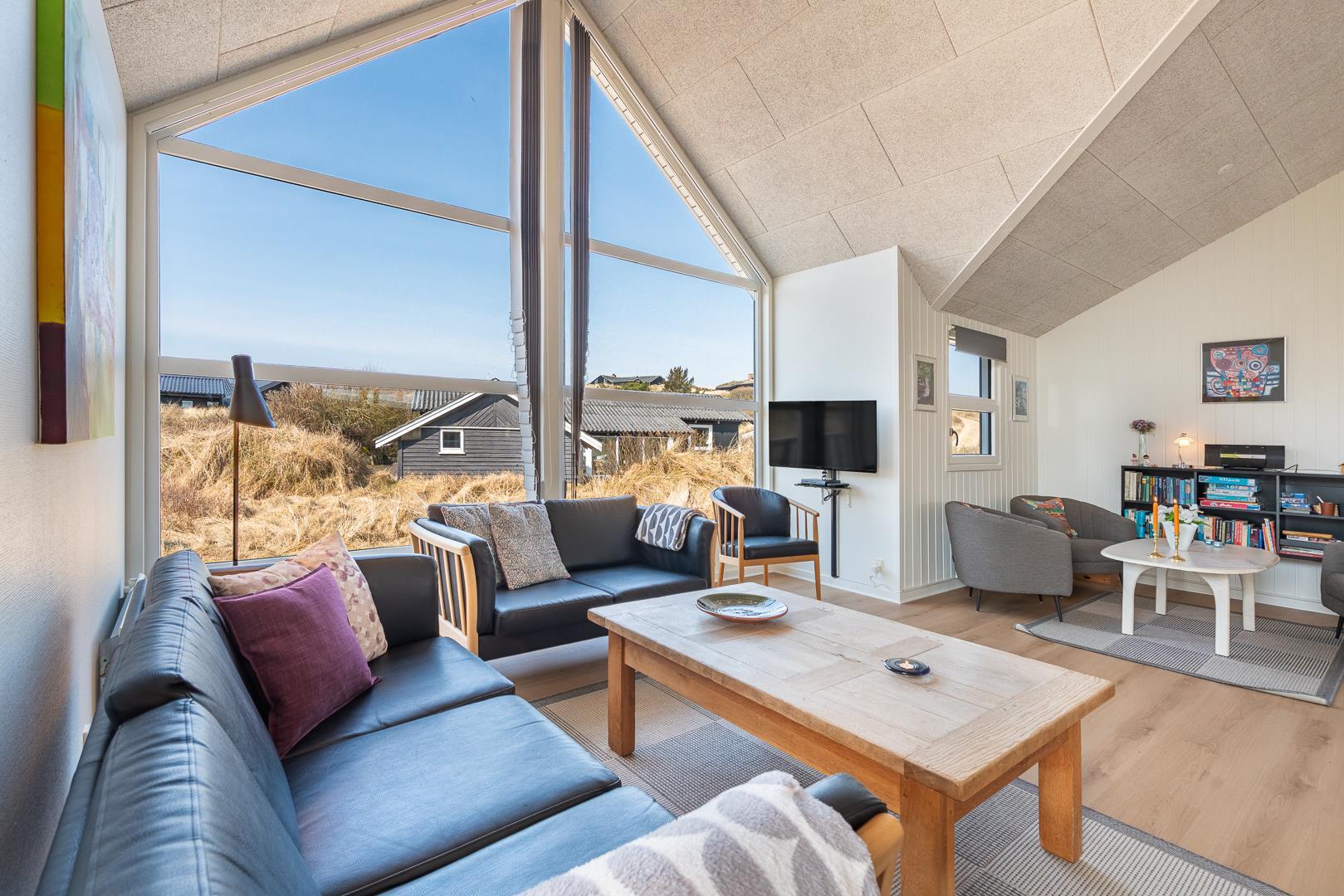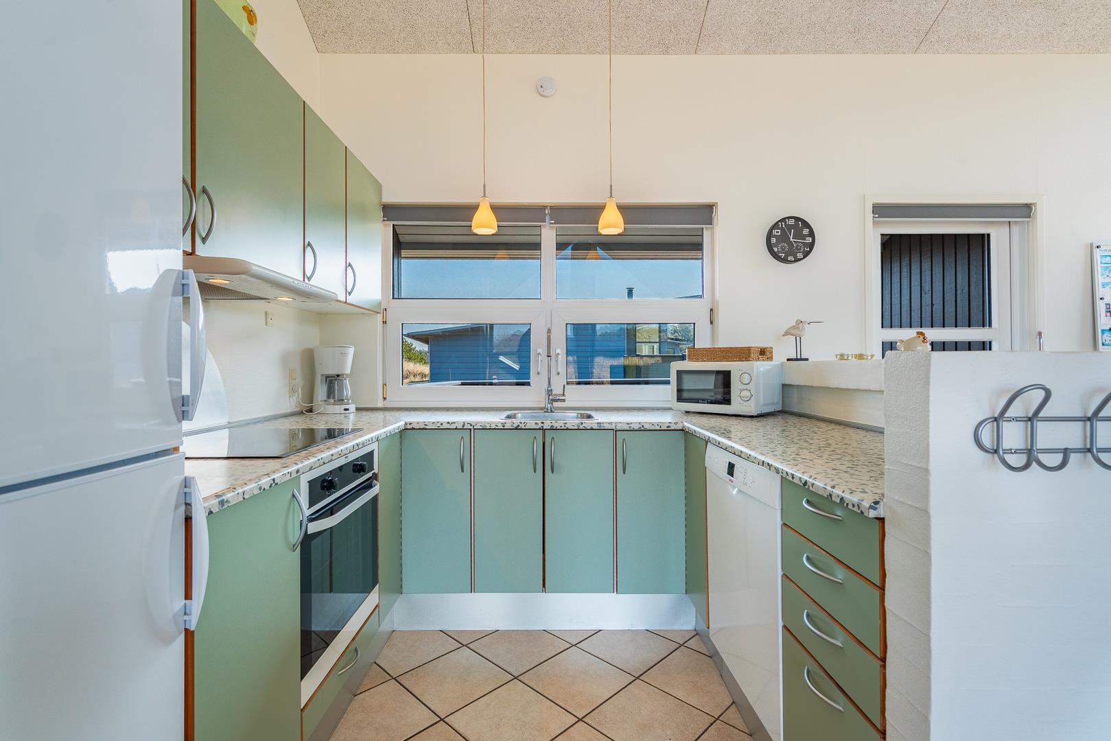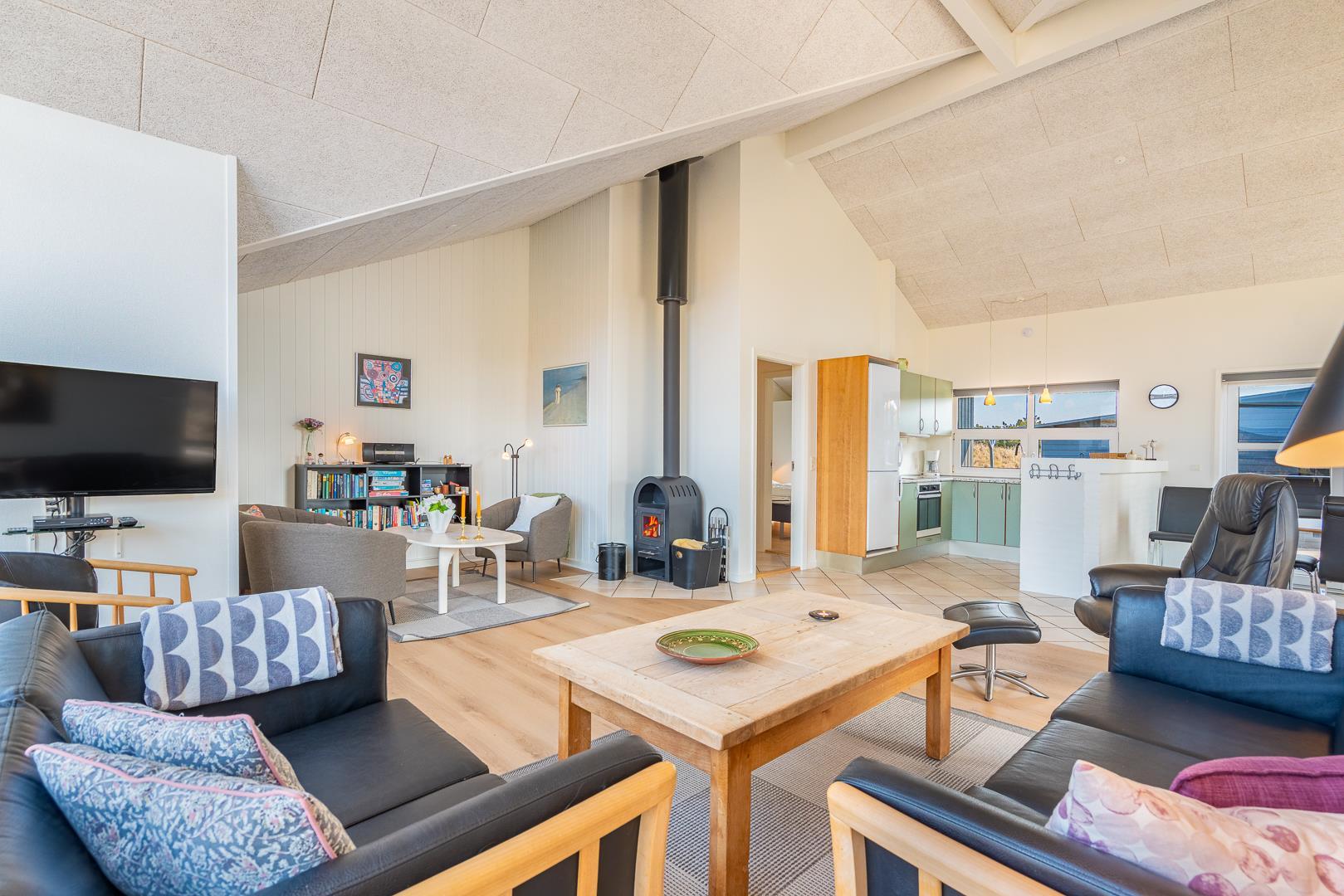 Køkkenet er veludstyret og i åben forbindelse med den rummelige stue, der er smagfuldt indrettet med pæne og komfortable møbler. Her kan du slappe af og tilbringe tid med dine nærmeste i hyggelige omgivelser.