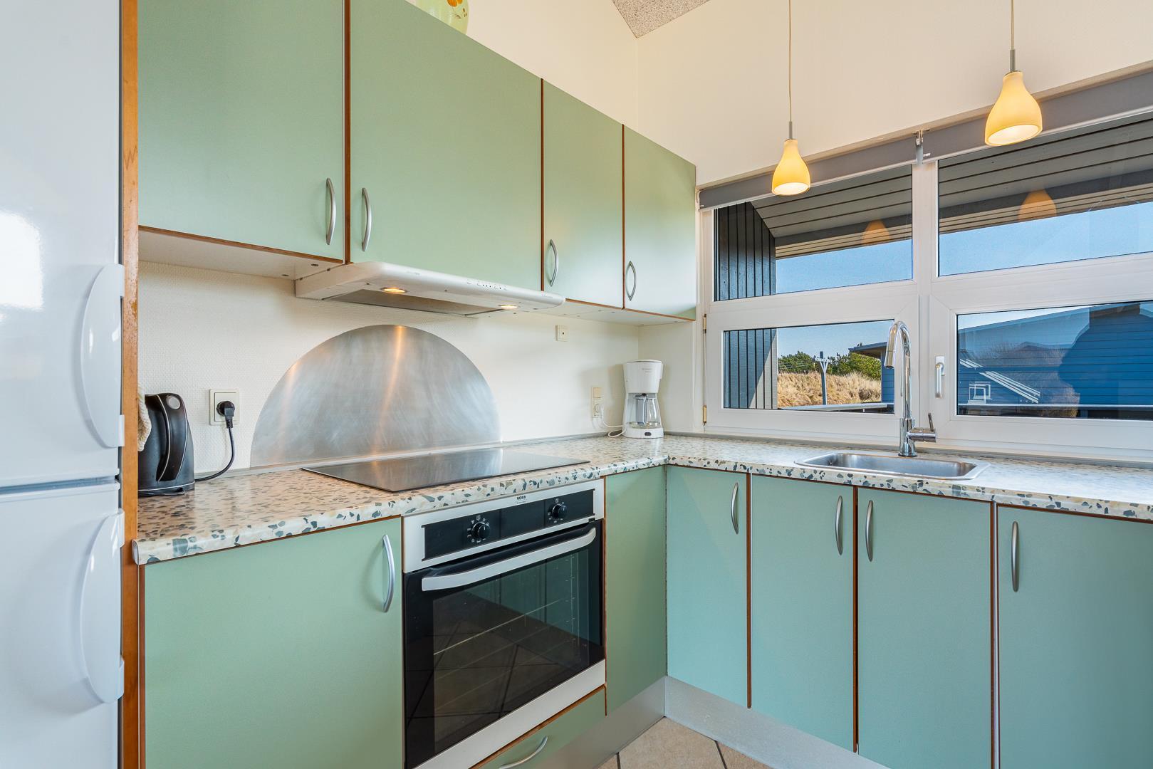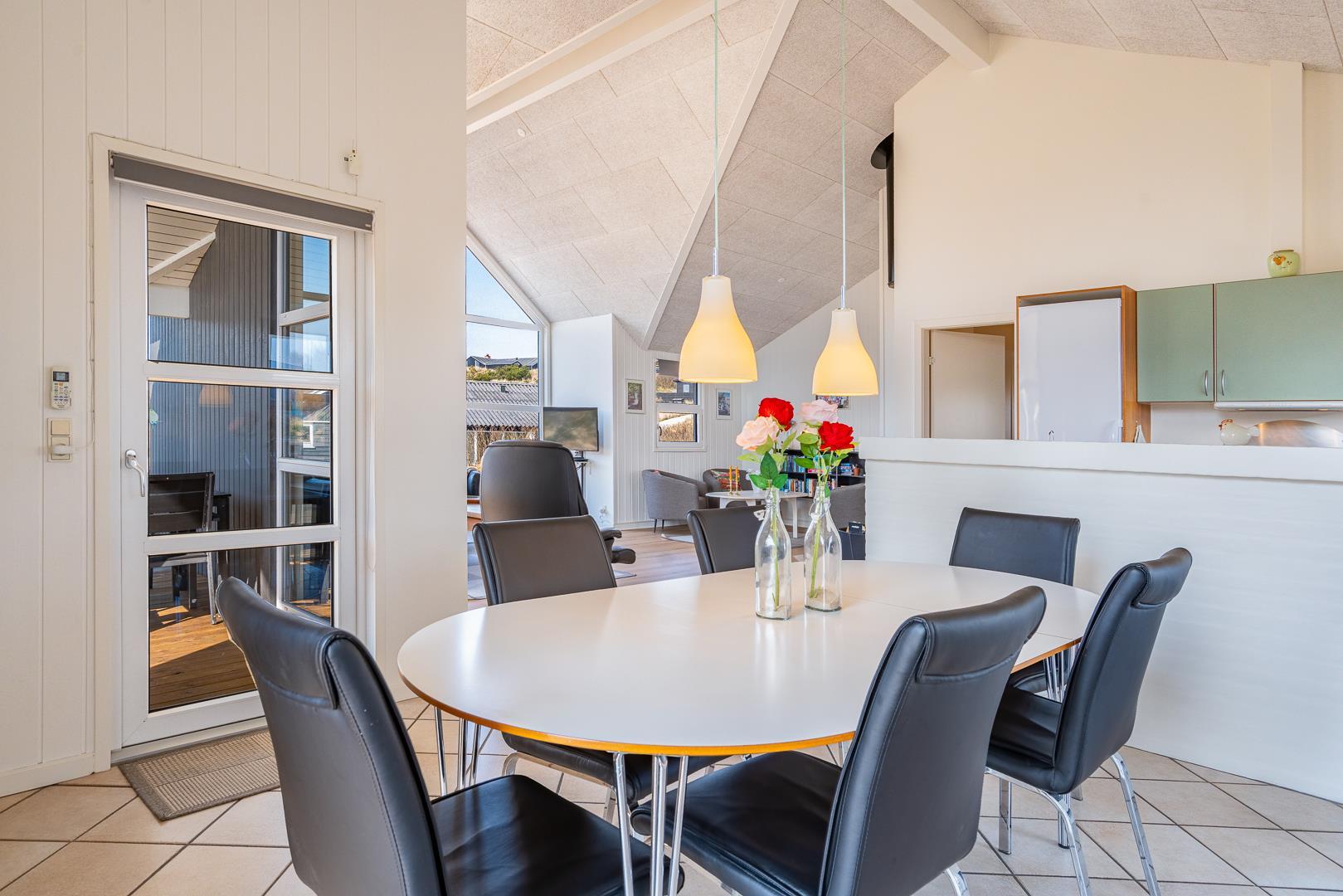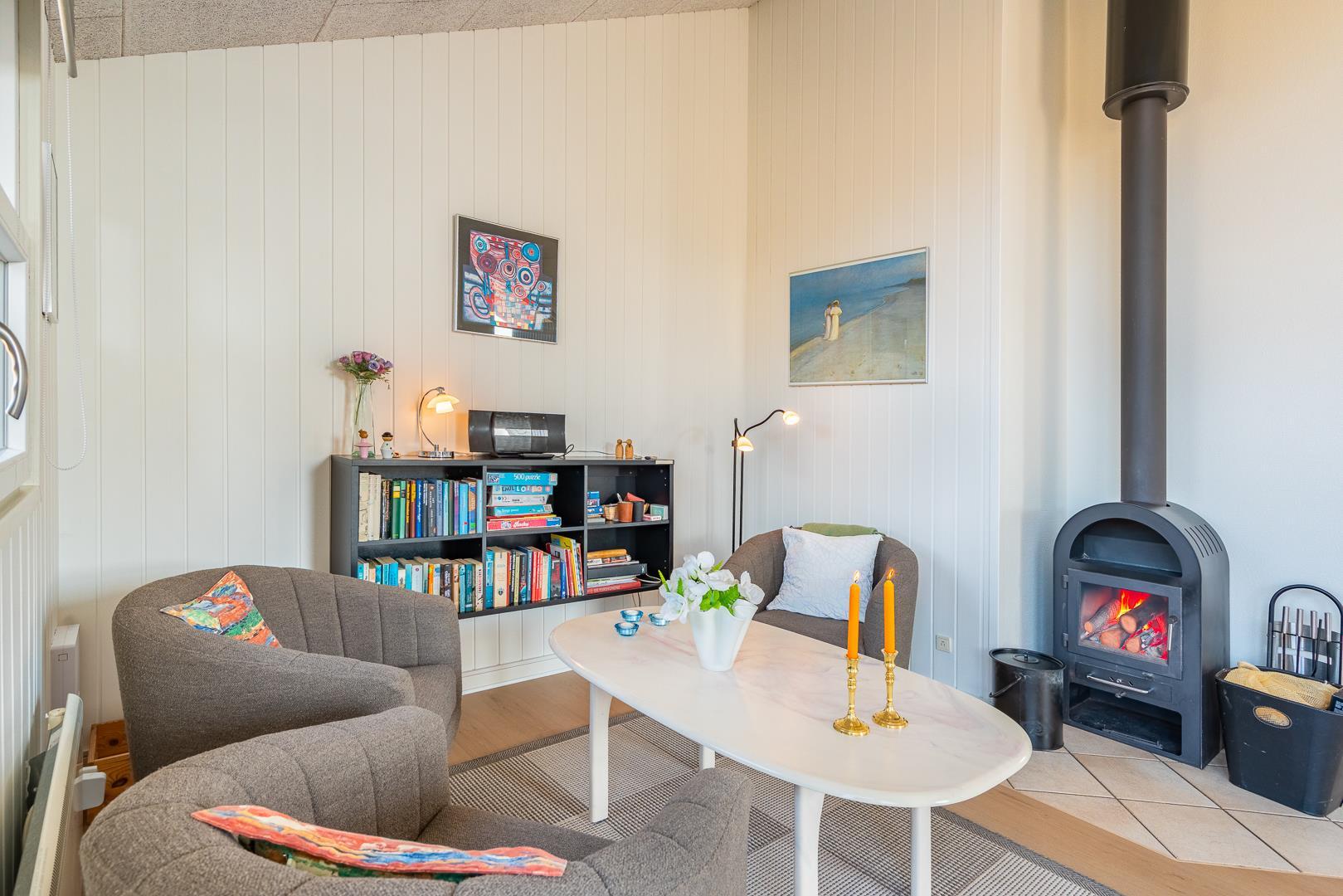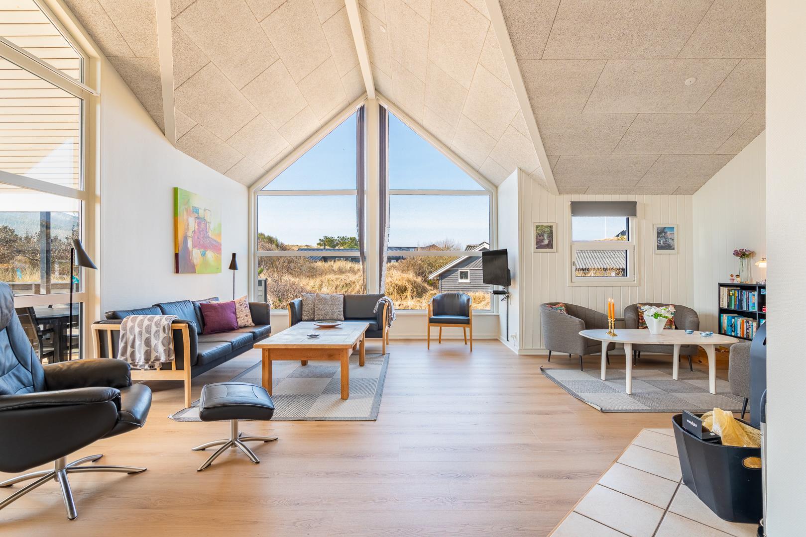 Køkkenet er veludstyret og i åben forbindelse med den rummelige stue, der er smagfuldt indrettet med pæne og komfortable møbler. Her kan du slappe af og tilbringe tid med dine nærmeste i hyggelige omgivelser.