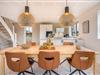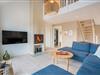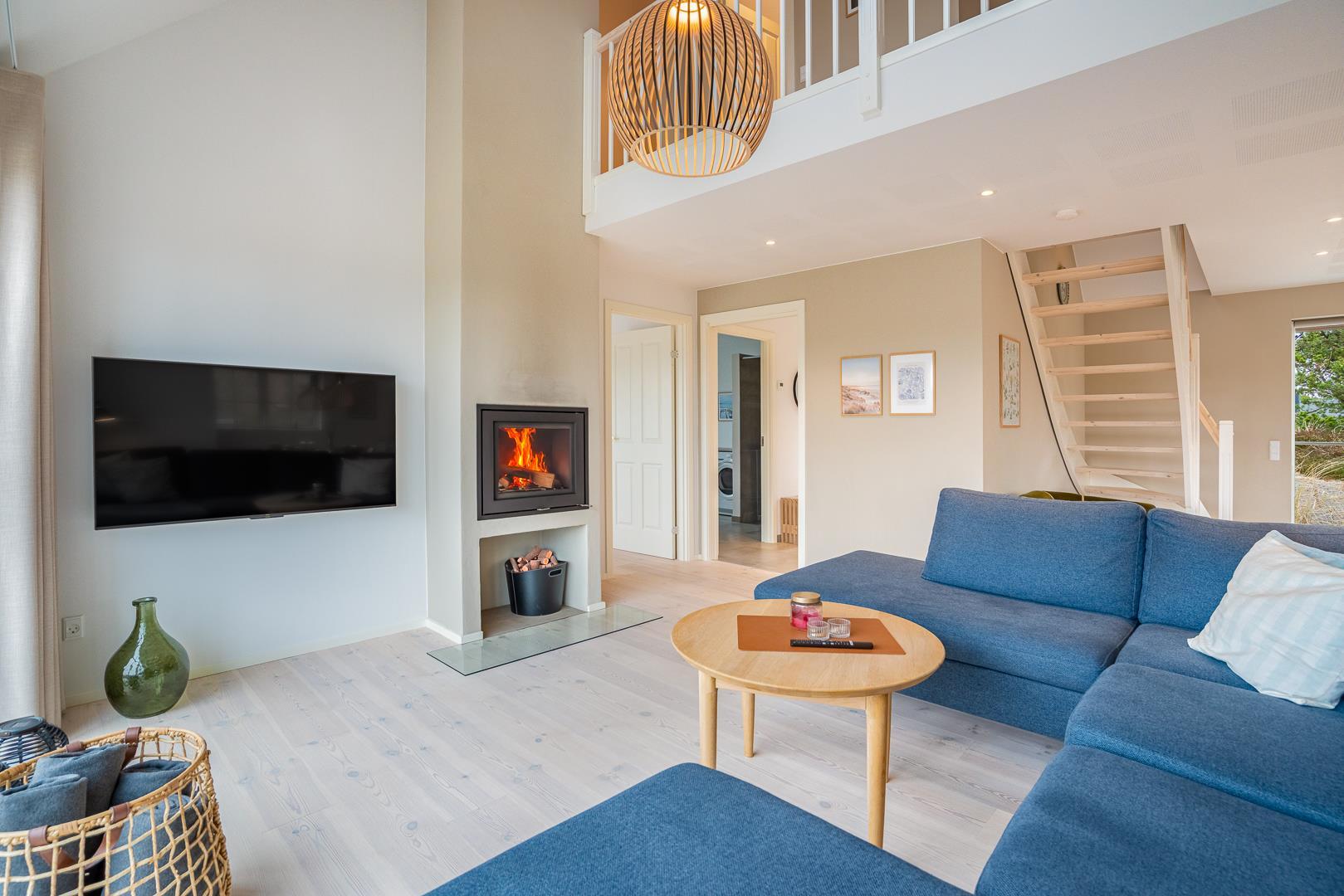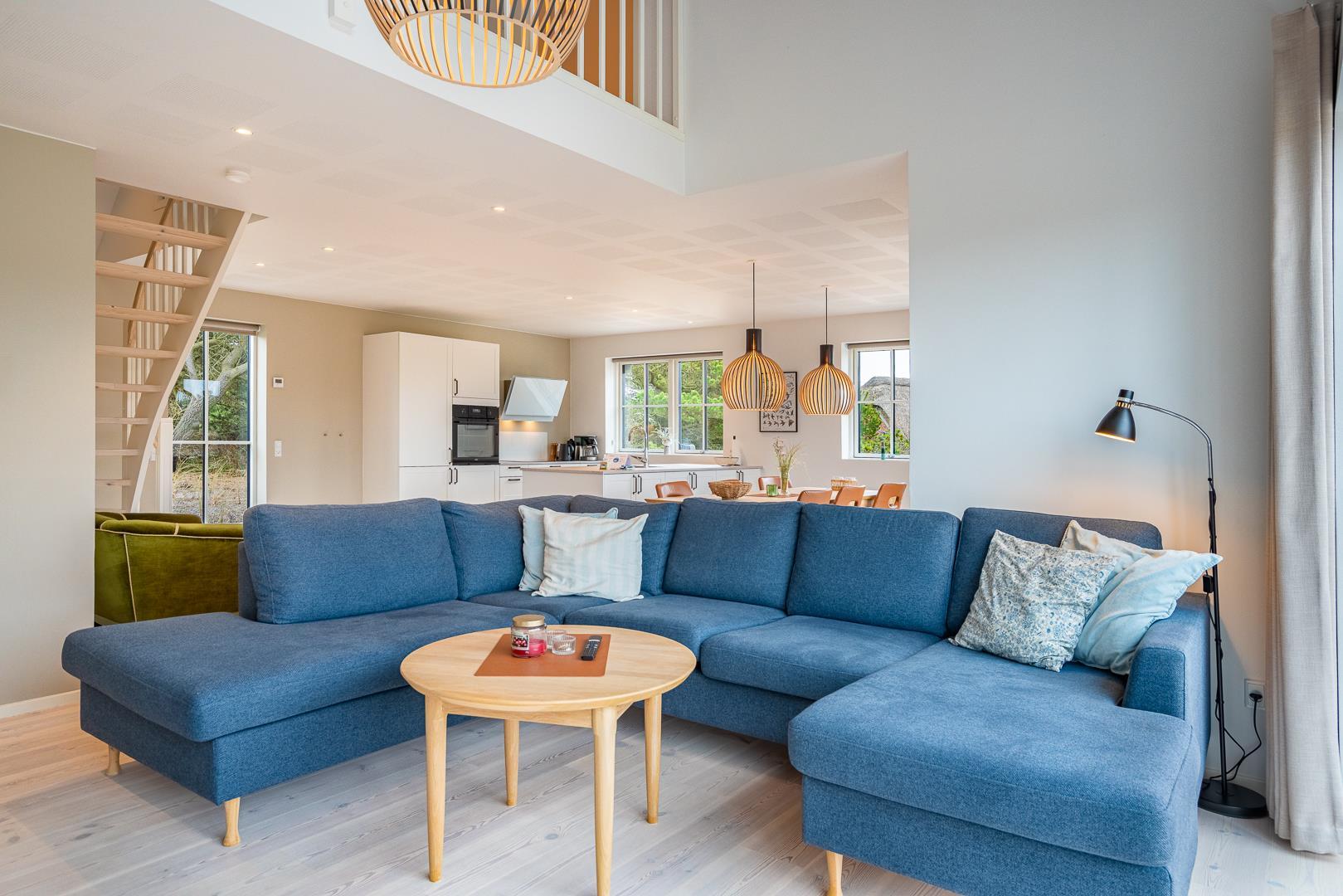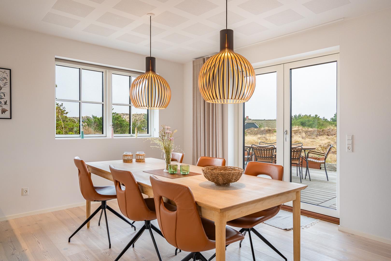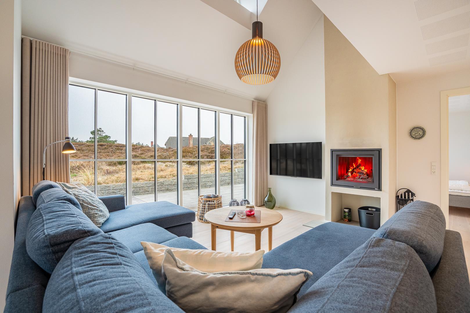 De store vinduespartier giver stuen et lyst og indbydende udtryk. Her kan du slappe af med familien – og når vejret er køligt, spreder brændeovnen en dejlig varme og hyggelig stemning.