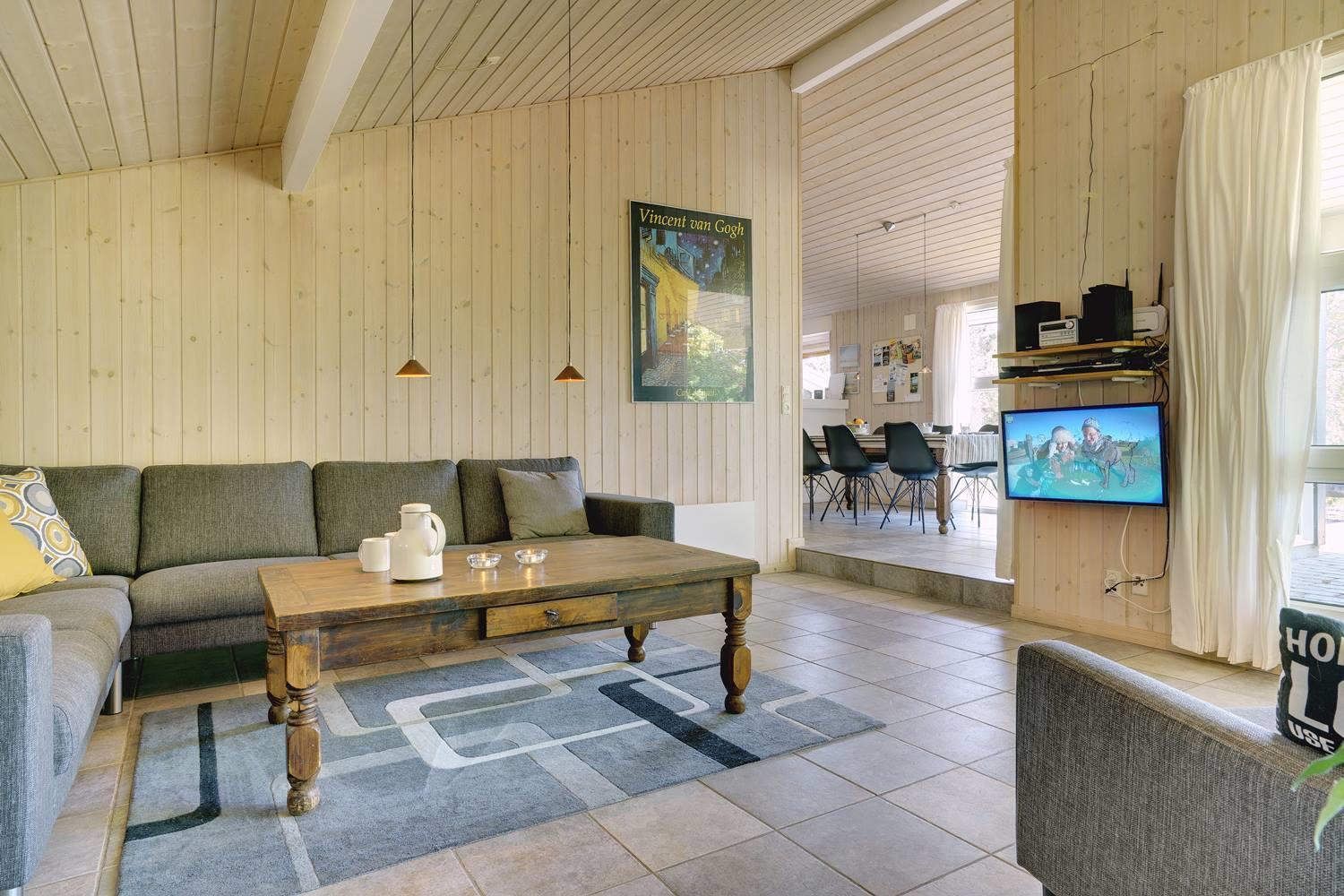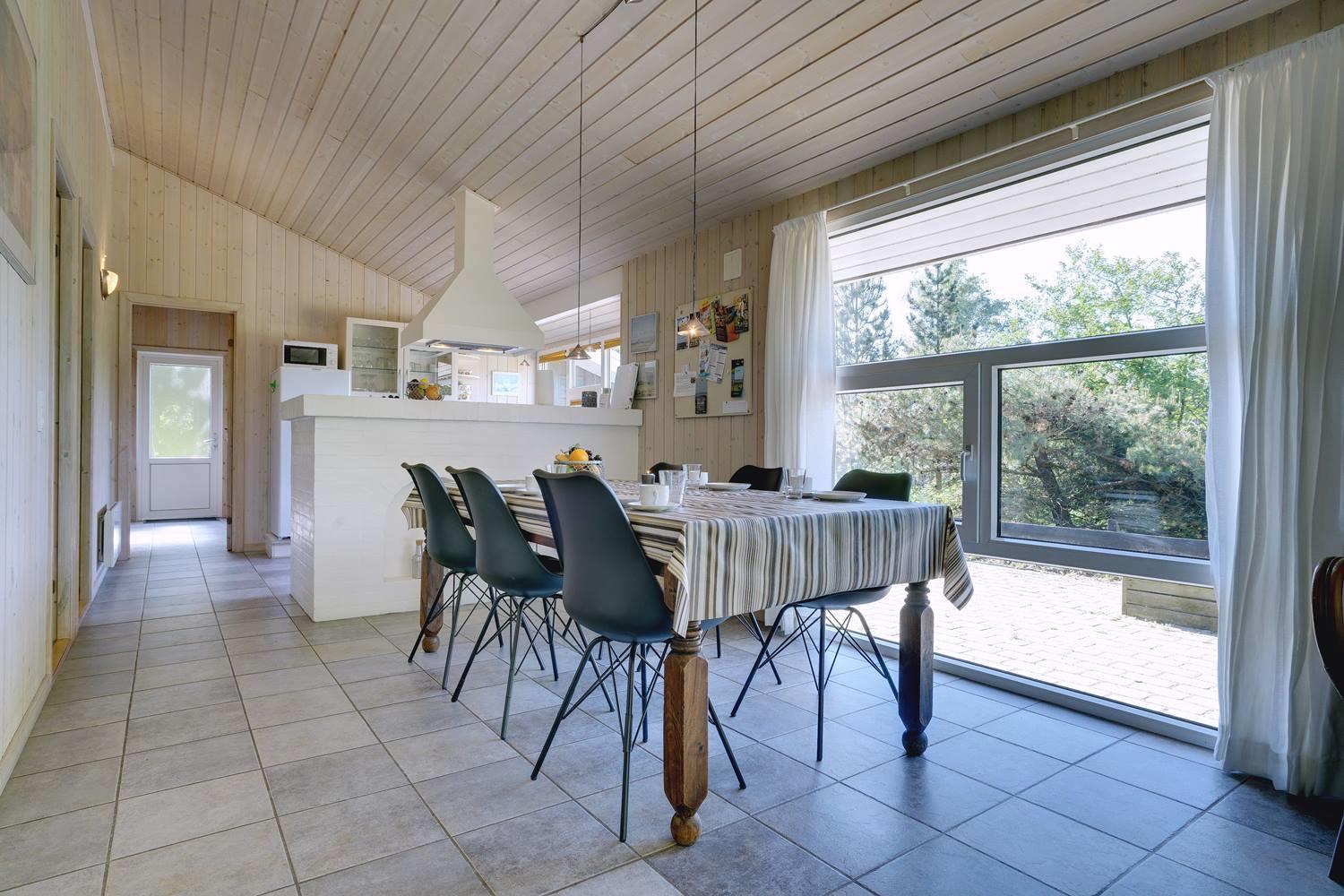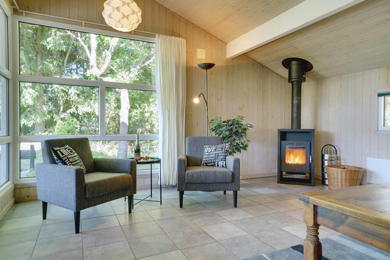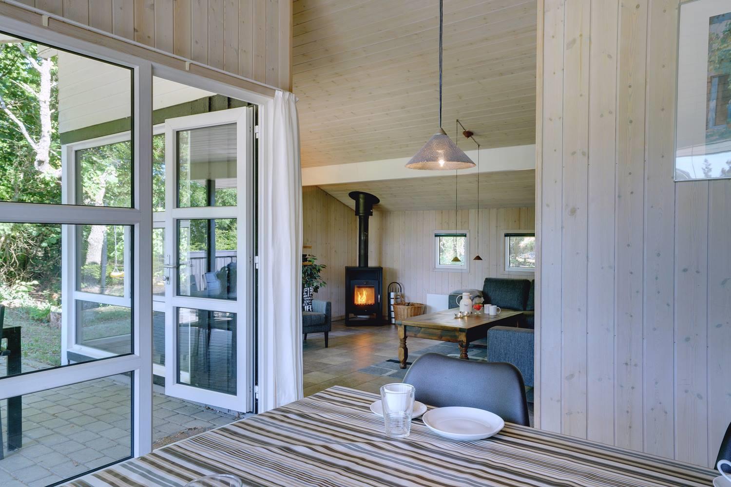 Opholdsrummet er åbent indrettet og indbyder til samvær. På køligere dage sørger brændeovn for varme og en ekstra hyggelig atmosfære, mens store vinduer fylder rummet med dagslys. Uanset om det er en rolig aften med en bog, brætspil eller afslapning efter en dag på stranden, finder alle deres favoritplads her.
