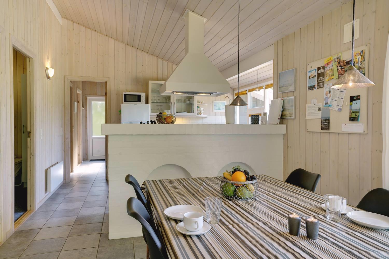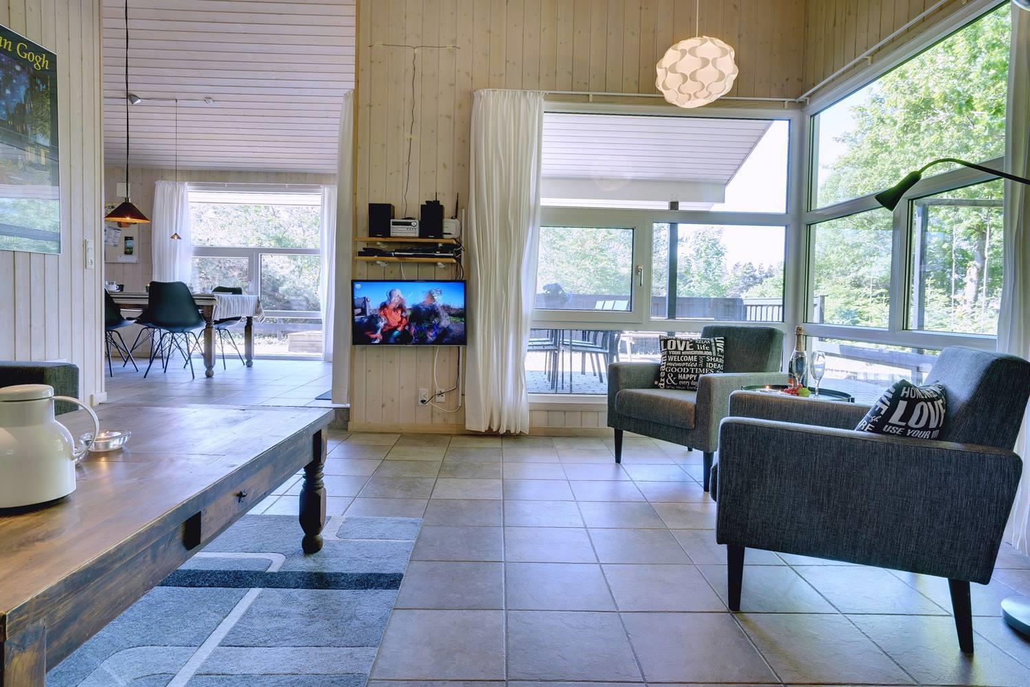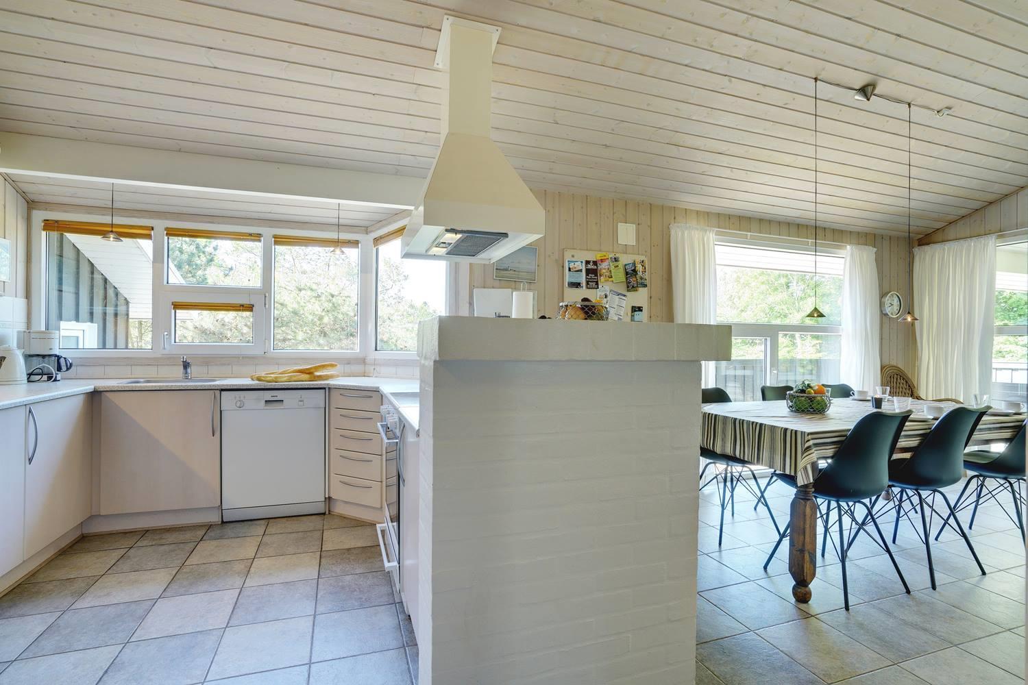 Opholdsrummet er åbent indrettet og indbyder til samvær. På køligere dage sørger brændeovn for varme og en ekstra hyggelig atmosfære, mens store vinduer fylder rummet med dagslys. Uanset om det er en rolig aften med en bog, brætspil eller afslapning efter en dag på stranden, finder alle deres favoritplads her.