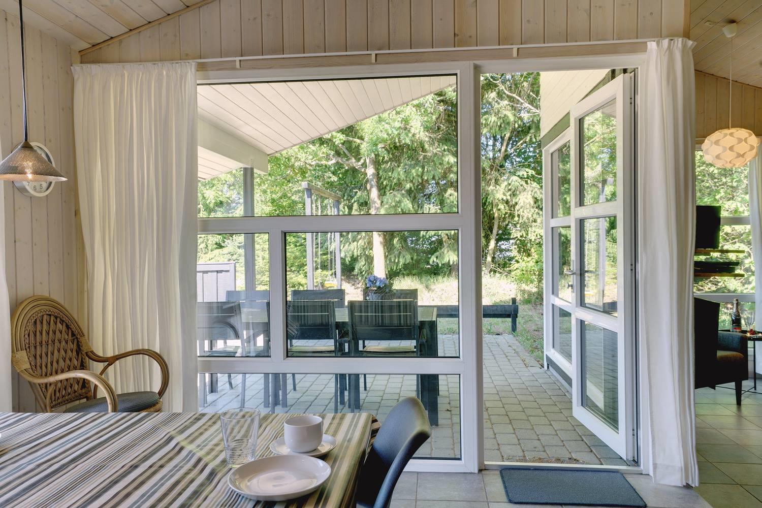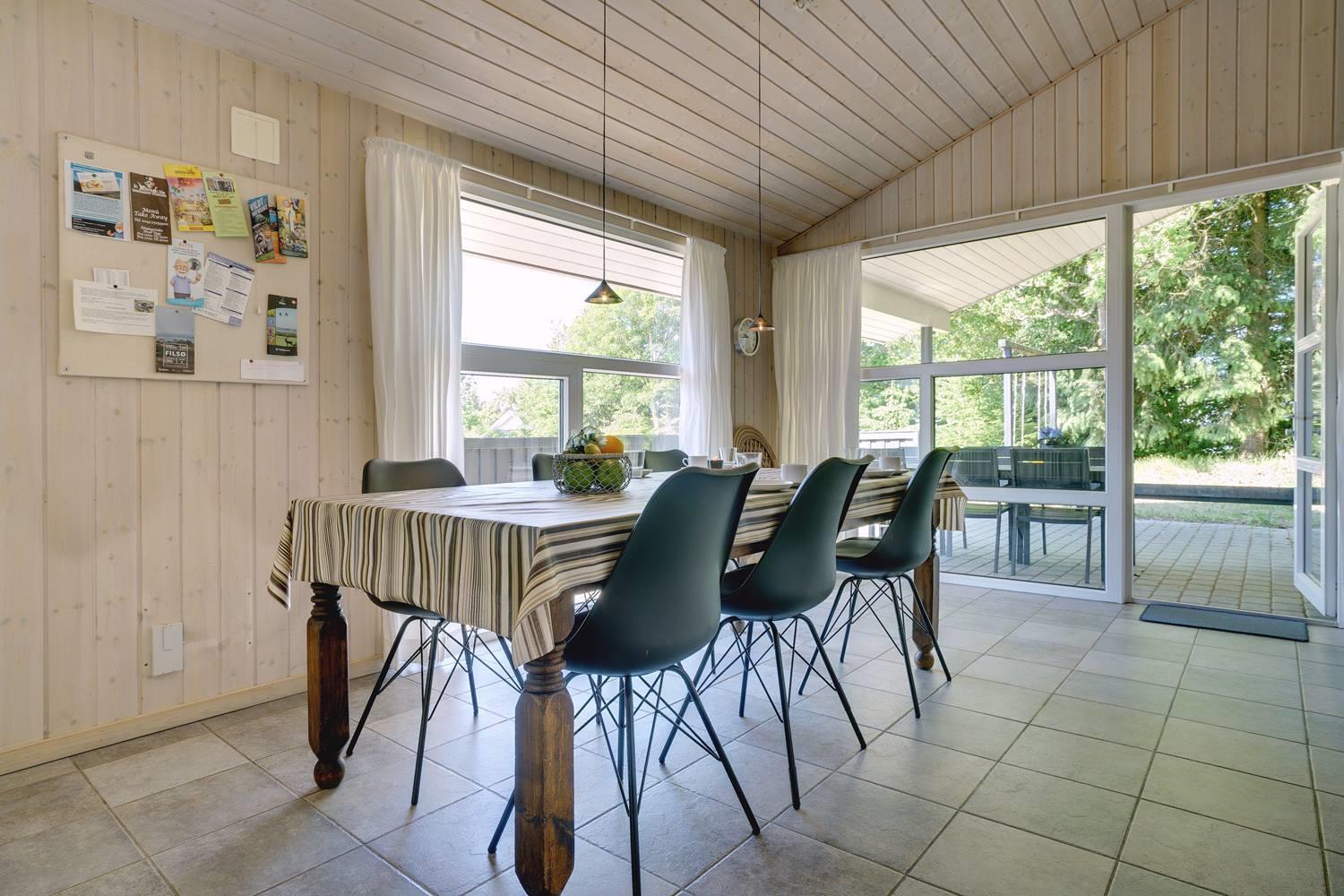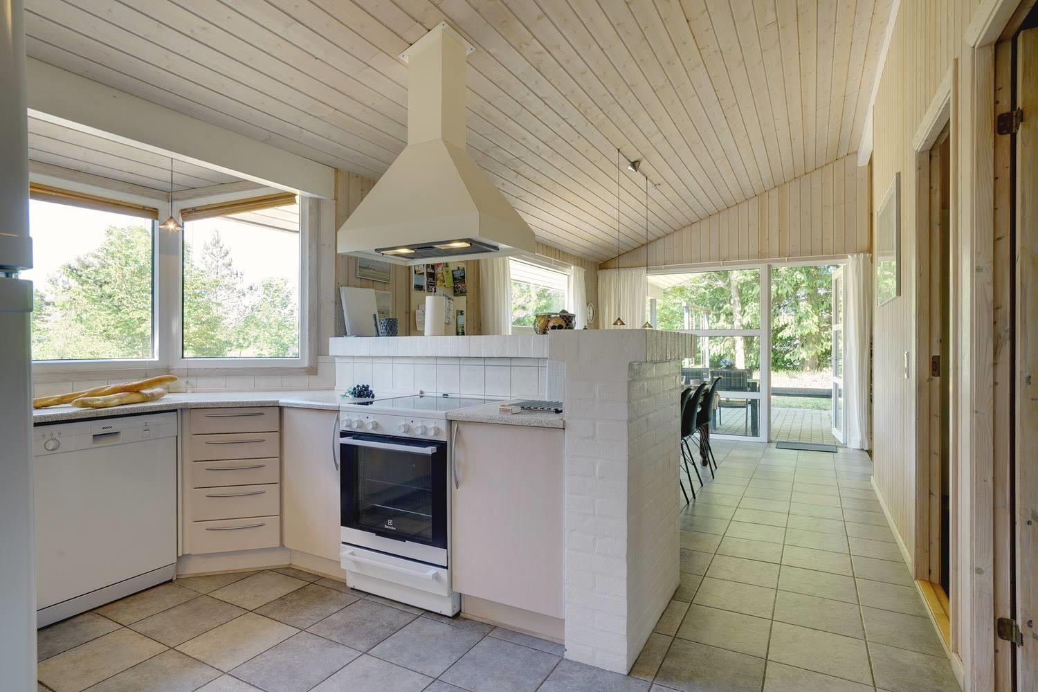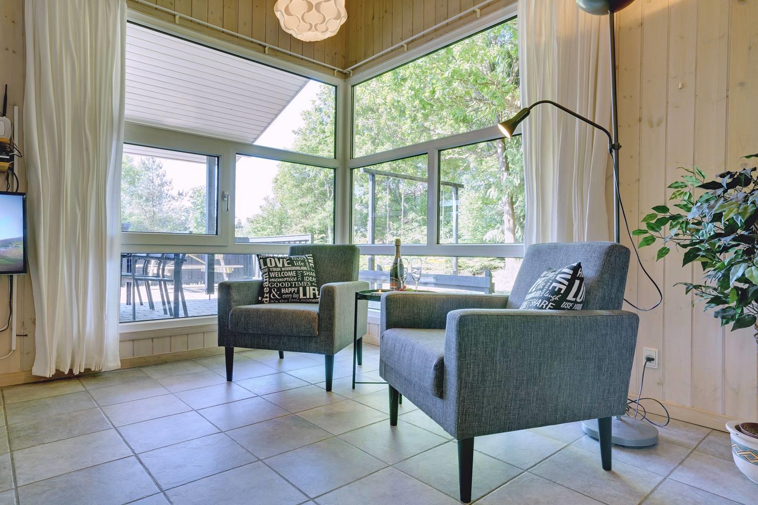 Opholdsrummet er åbent indrettet og indbyder til samvær. På køligere dage sørger brændeovn for varme og en ekstra hyggelig atmosfære, mens store vinduer fylder rummet med dagslys. Uanset om det er en rolig aften med en bog, brætspil eller afslapning efter en dag på stranden, finder alle deres favoritplads her.