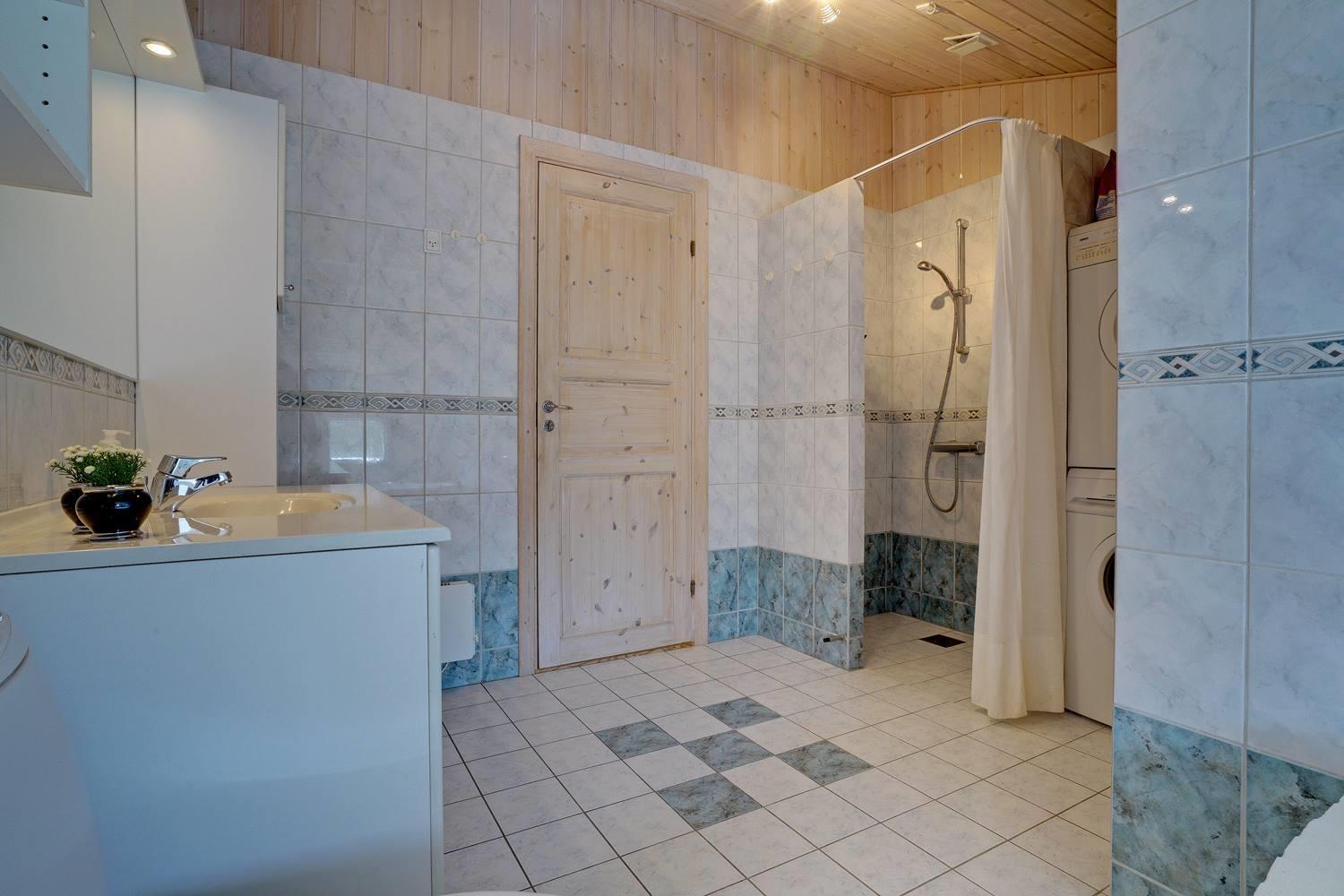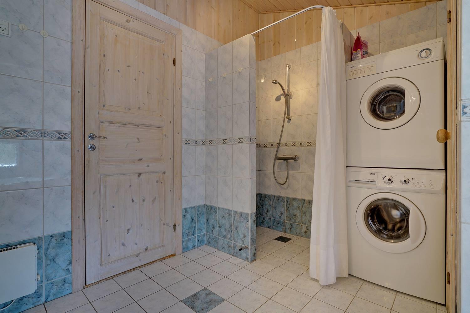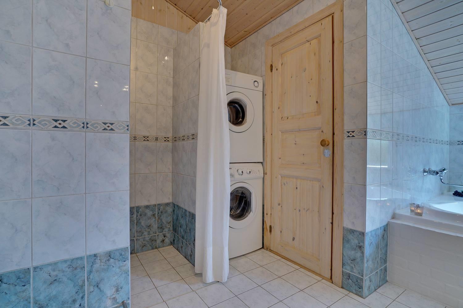 Køkkenet er praktisk og moderne indrettet og har opvaskemaskine samt god bordplads til fælles madlavning. Spiseområdet ligger lige ved siden af og gør det muligt både at nyde hurtige morgenmåltider og lange, hyggelige middage. Vaskemaskine og tørretumbler er også til rådighed og gør hverdagen på ferien lettere.