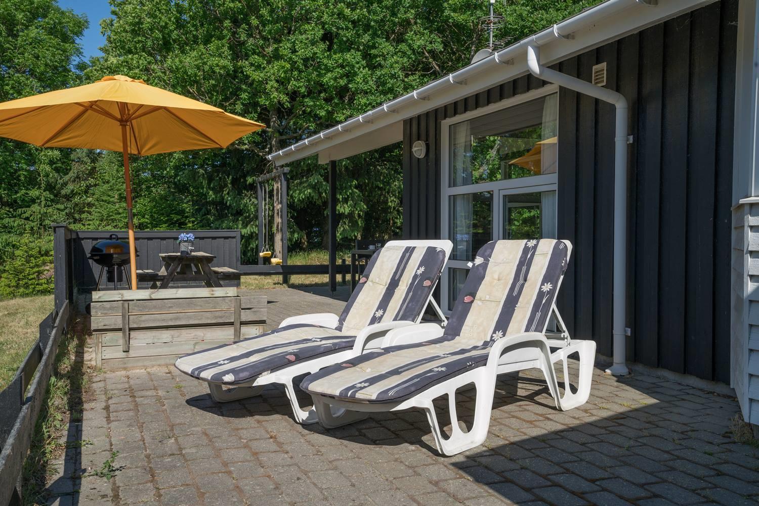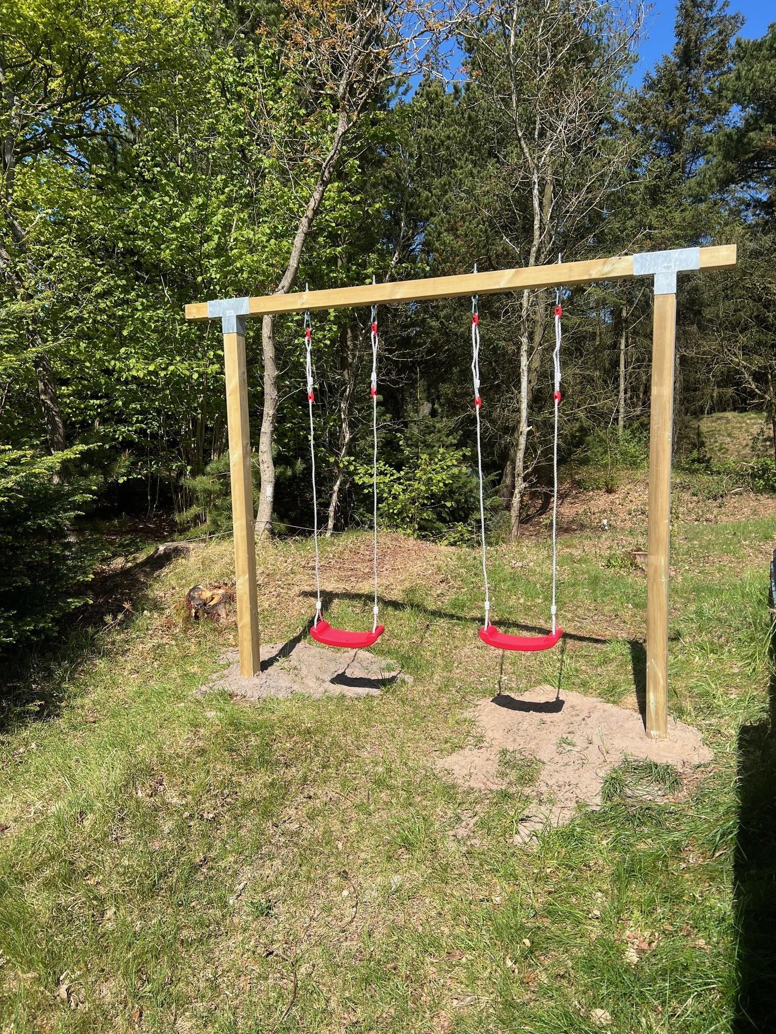 Udendørs venter en overdækket terrasse, og børnene kan glæde sig over gyngen og sandkassen, mens skuret giver plads til cykler, grill eller strandudstyr.