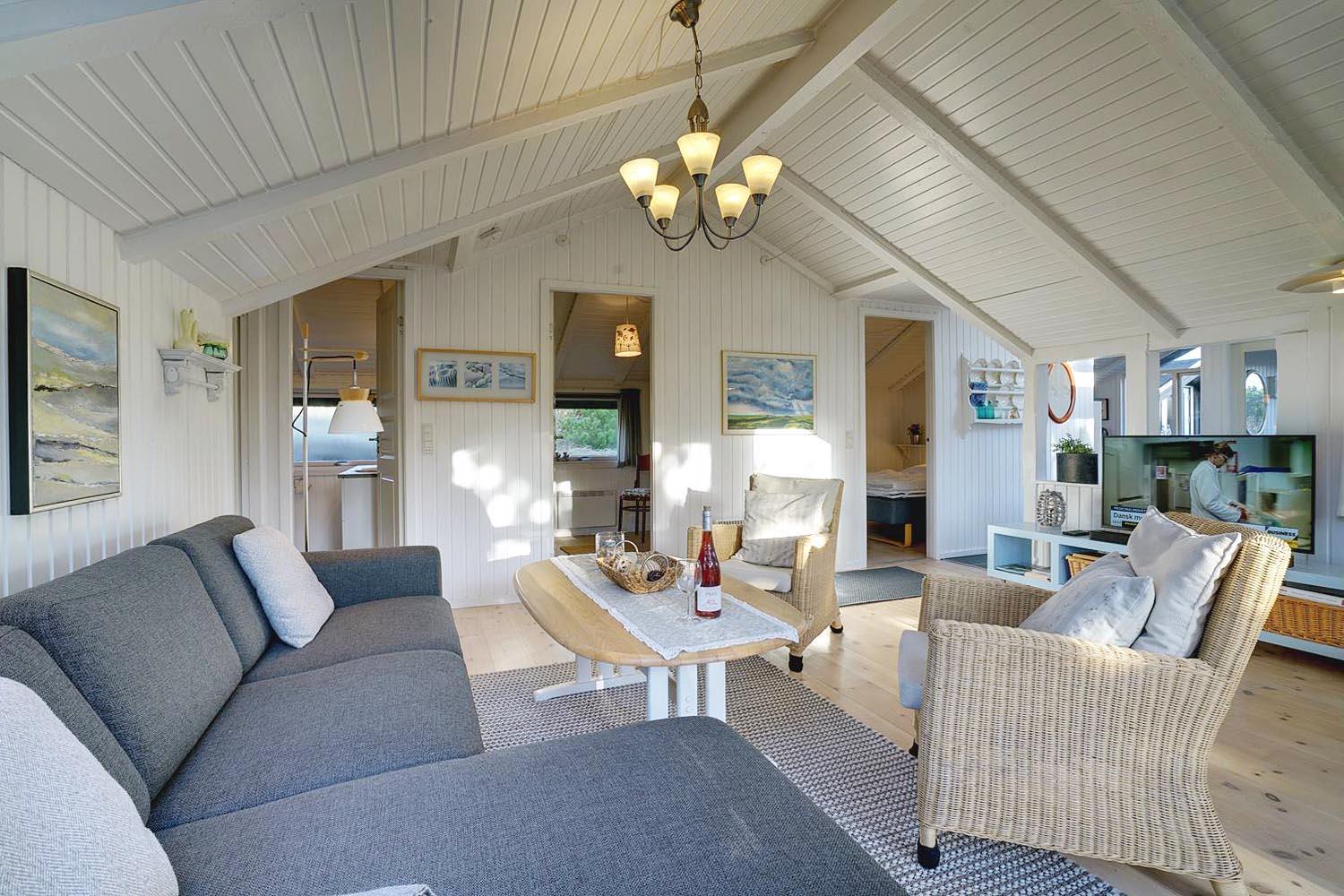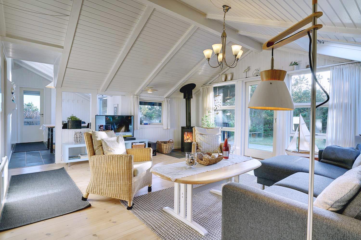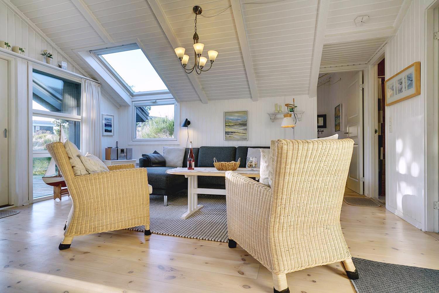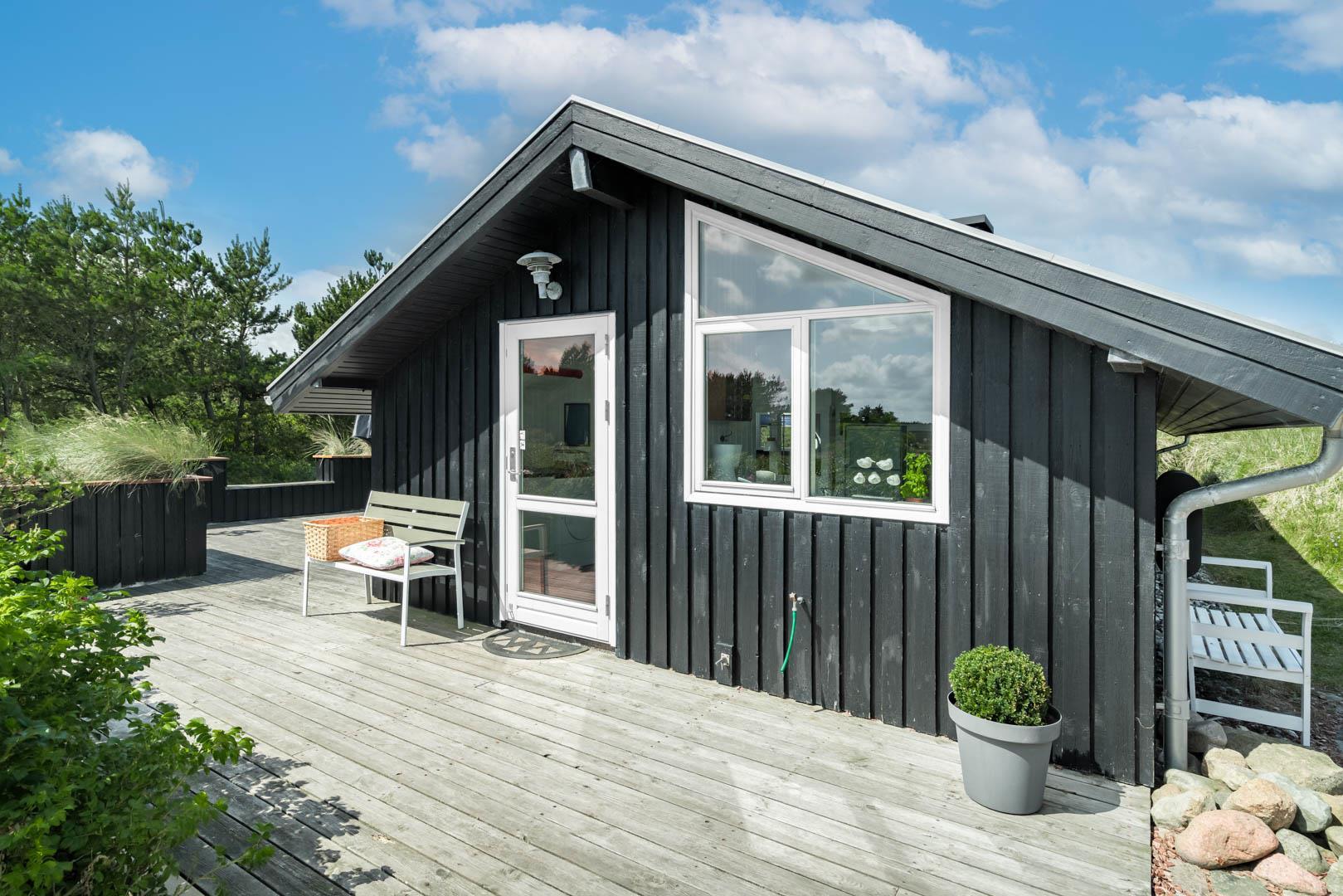 Hyggeligt og lyst feriehus på rolig klitgrund tæt ved Henne Mølle Å og stranden, med stor træterrasse og sauna.