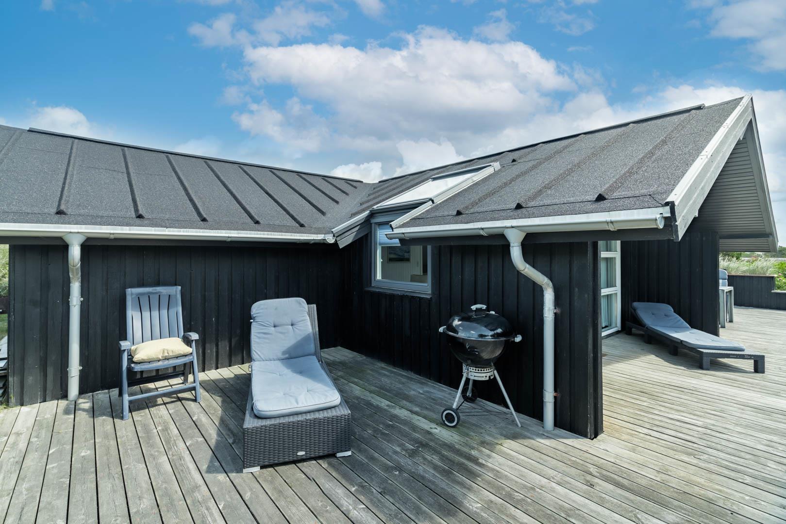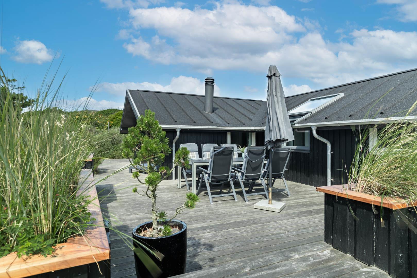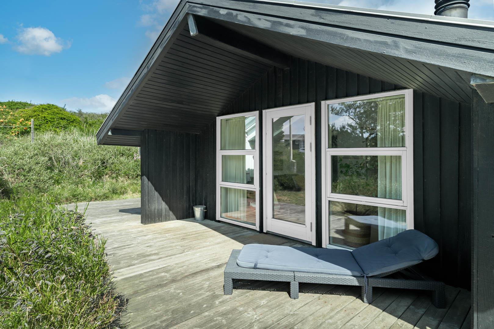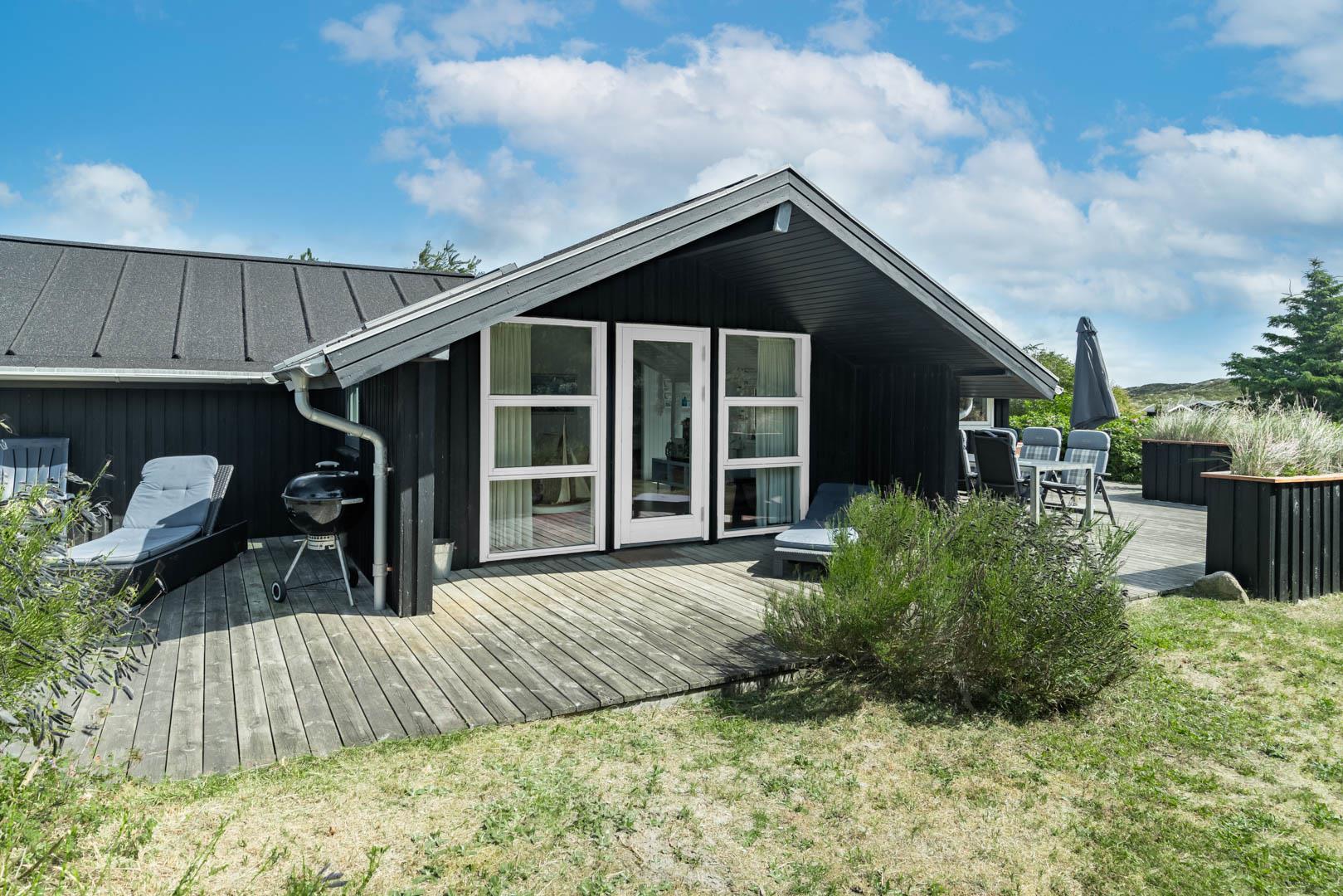 Fra stuen er der udgang til er en stor dejlig træterrasse, som ligger perfekt for solen. Et hus som bidrager til en positiv ferie.