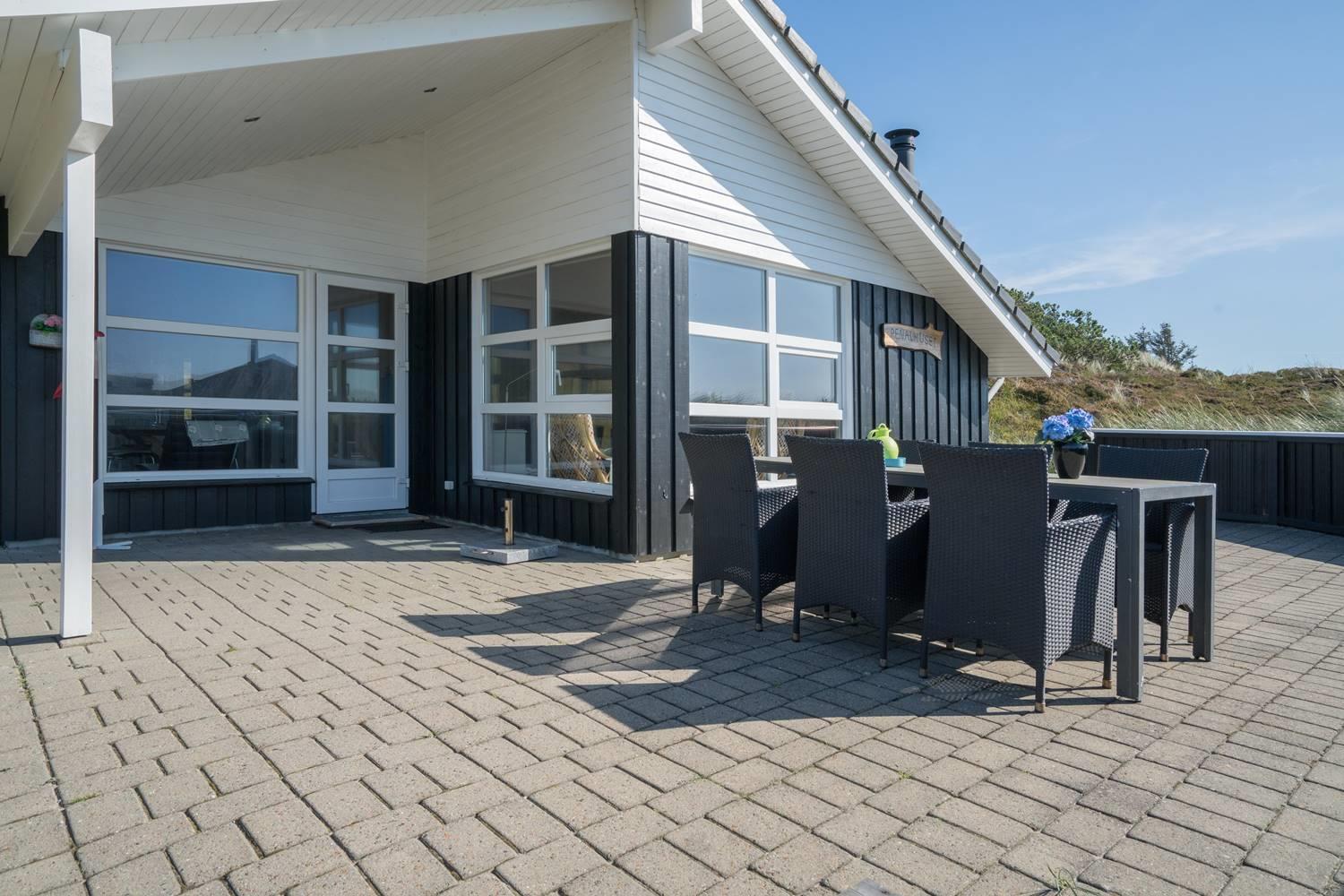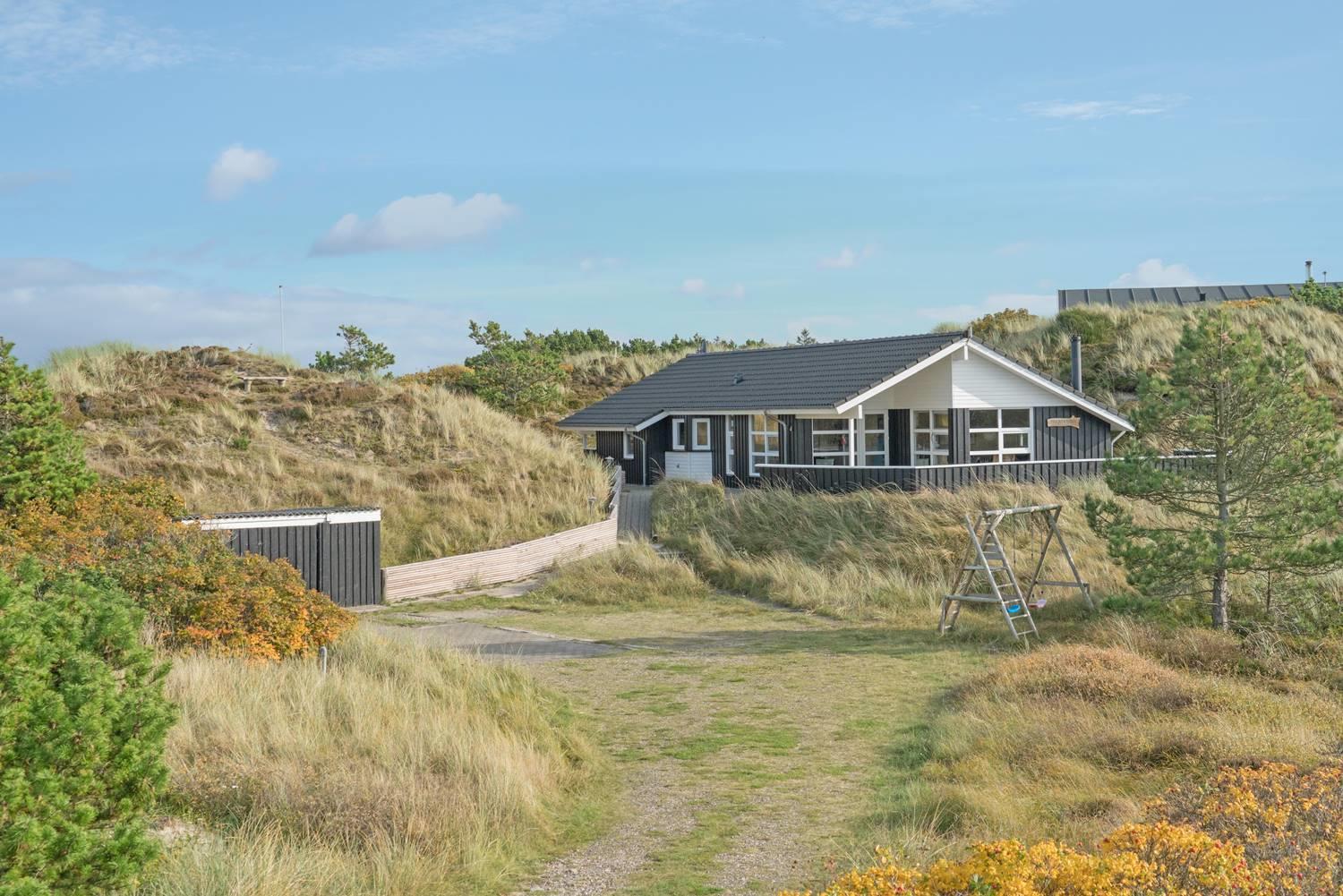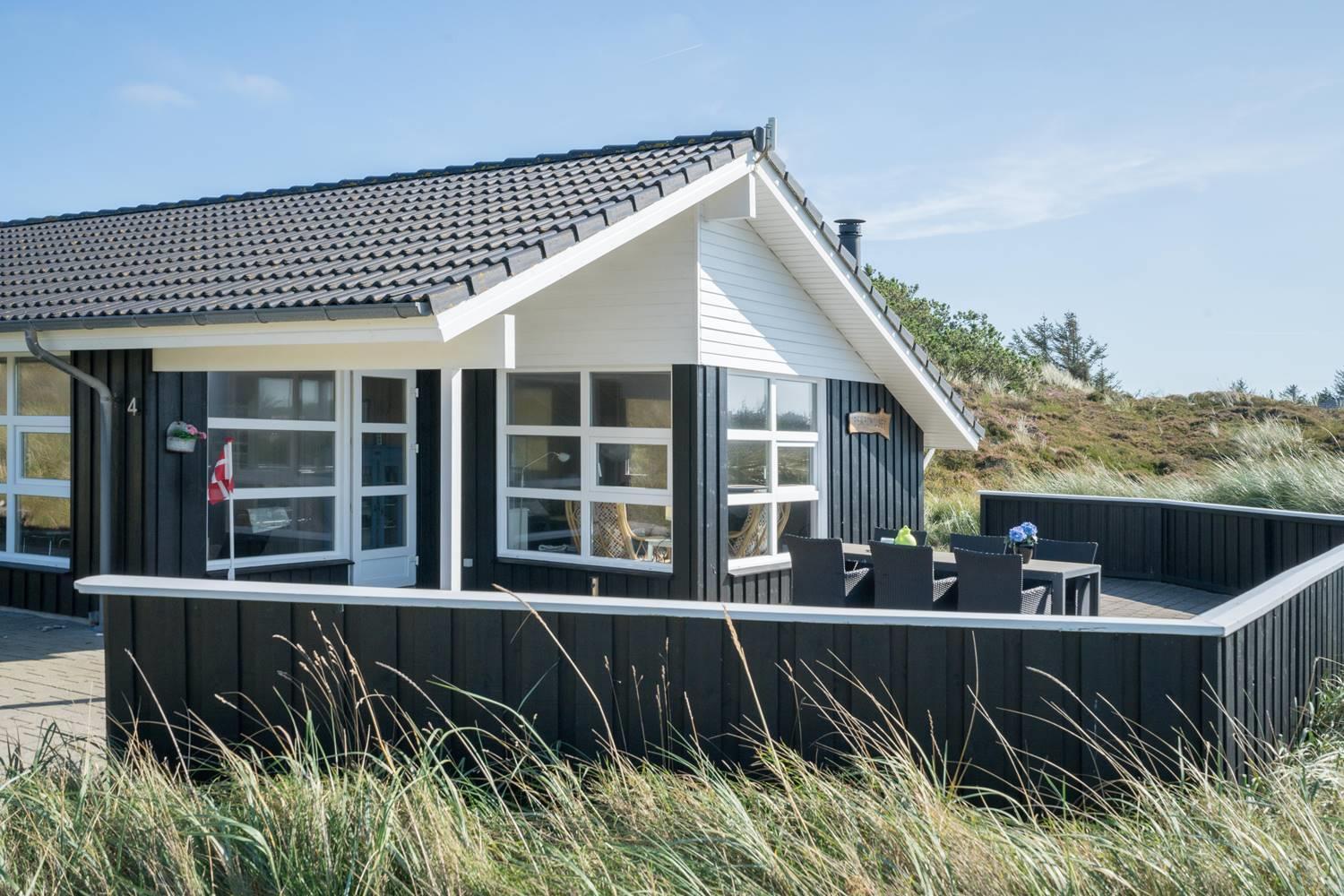 Flot kvalitetsferiehus på klitgrund nær Henne Strand med sauna, spa og stor terrasse til afslapning.
