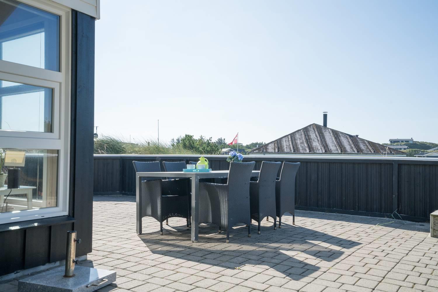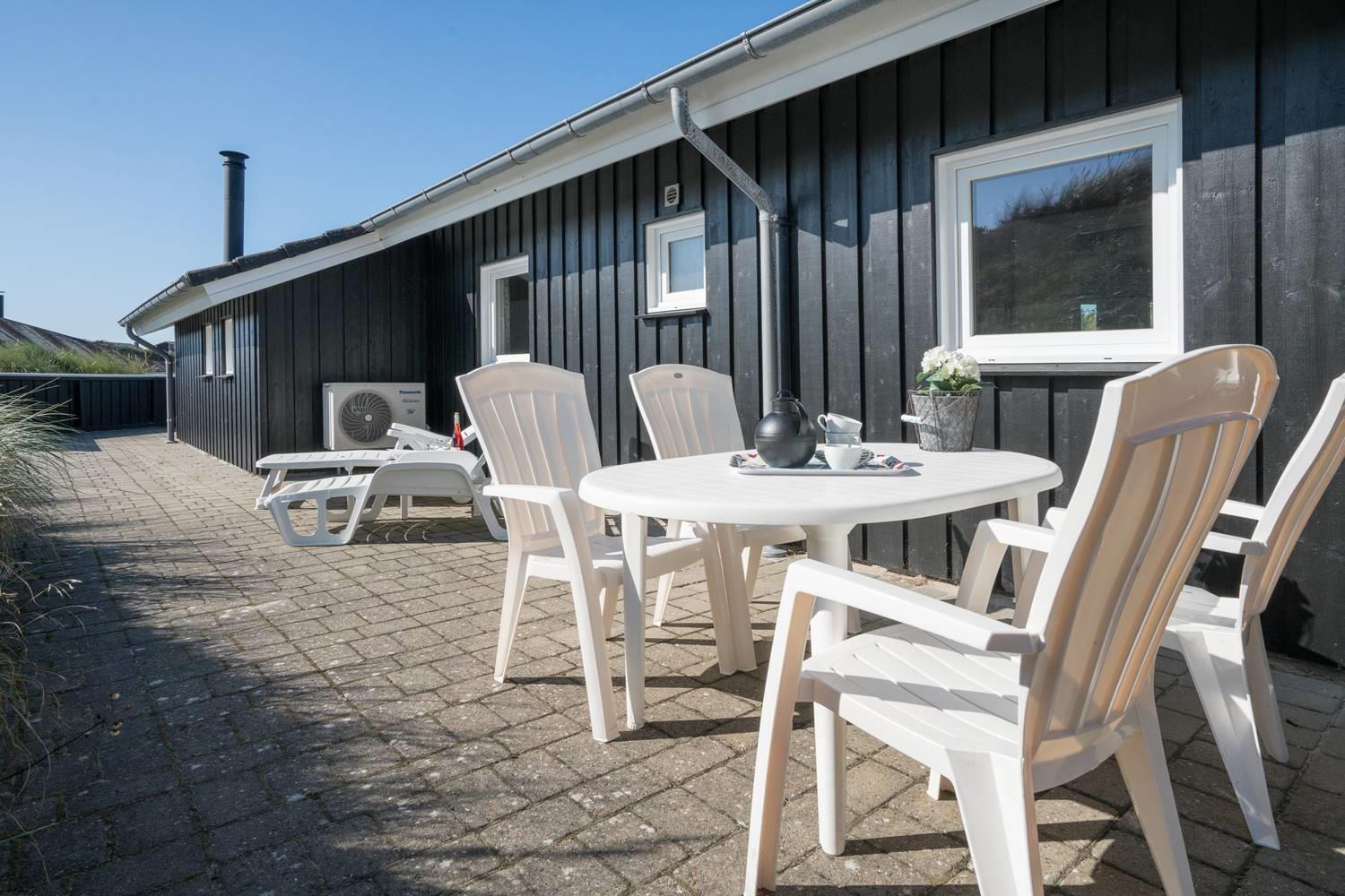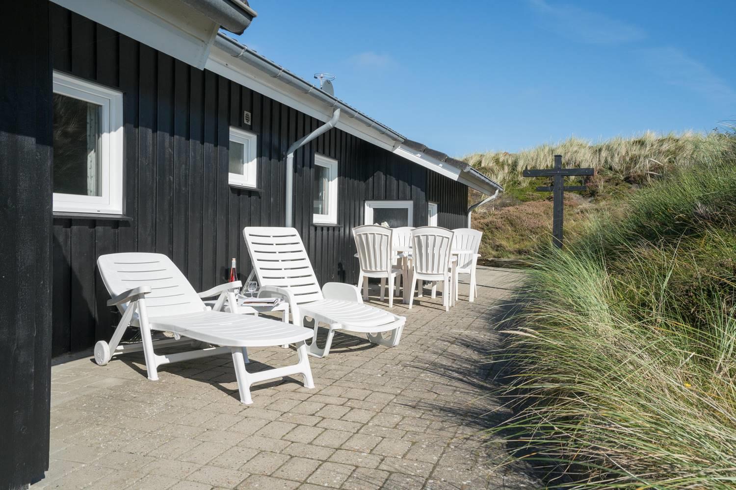 Flot kvalitetsferiehus på klitgrund nær Henne Strand med sauna, spa og stor terrasse til afslapning.