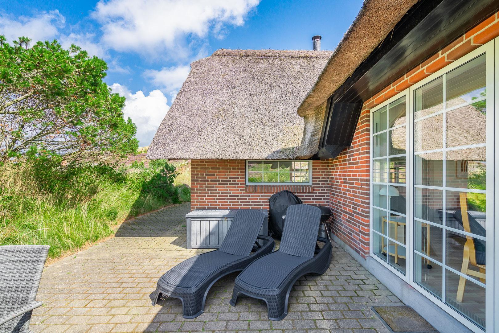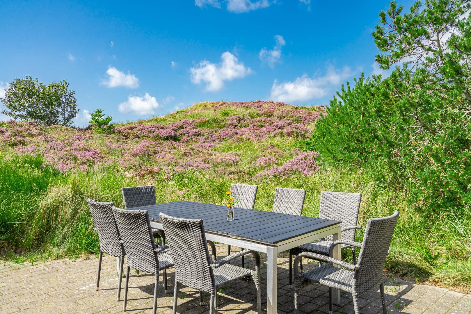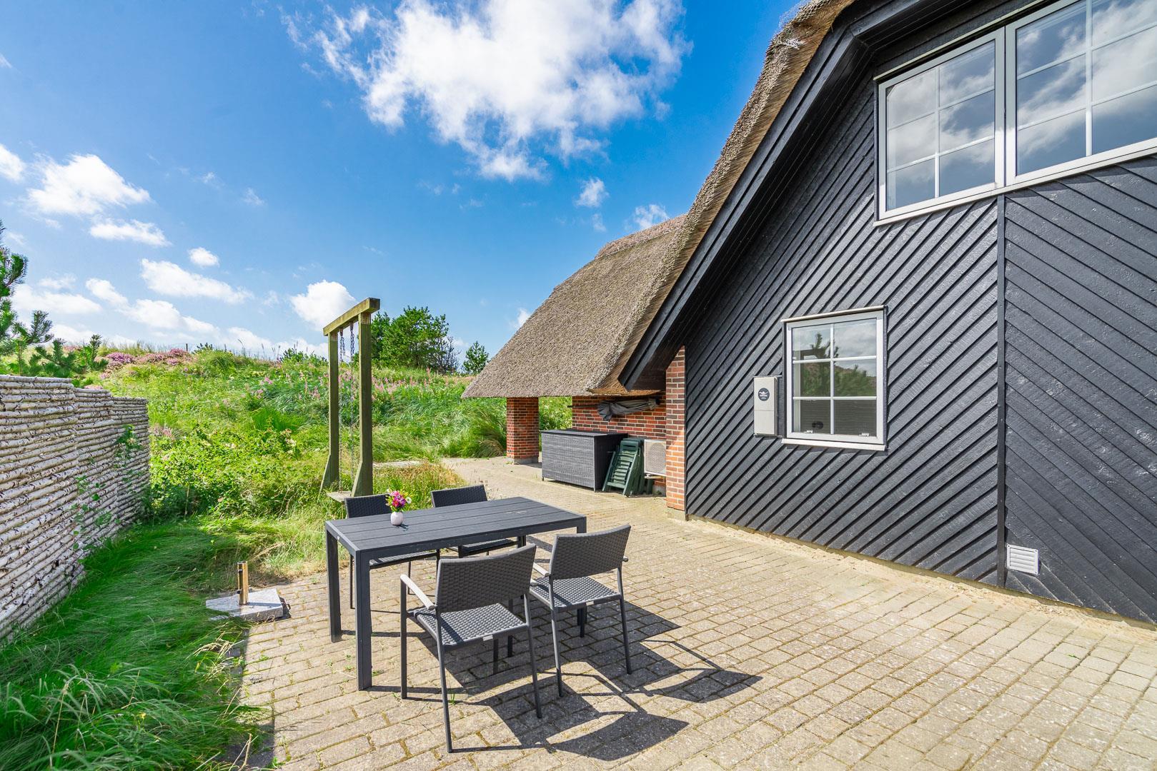 Huset er omkranset af flisebelagte terrasser som egner sig perfekt til at nye solen samt hygge omkring grillen. De små gæster føler sig også velkomne i dette feriehus, da her er både gynge og sandkasse. I kan også roligt tage cyklen med, for området indbyder til mange spændende ture ud i naturen f.eks. ligger Filsø og Blåbjerg Plantage ikke langt fra Hyldebærvej 12. Er I mere til golf, så er der kun 5 minutter i bil til Henne Golfklub.
