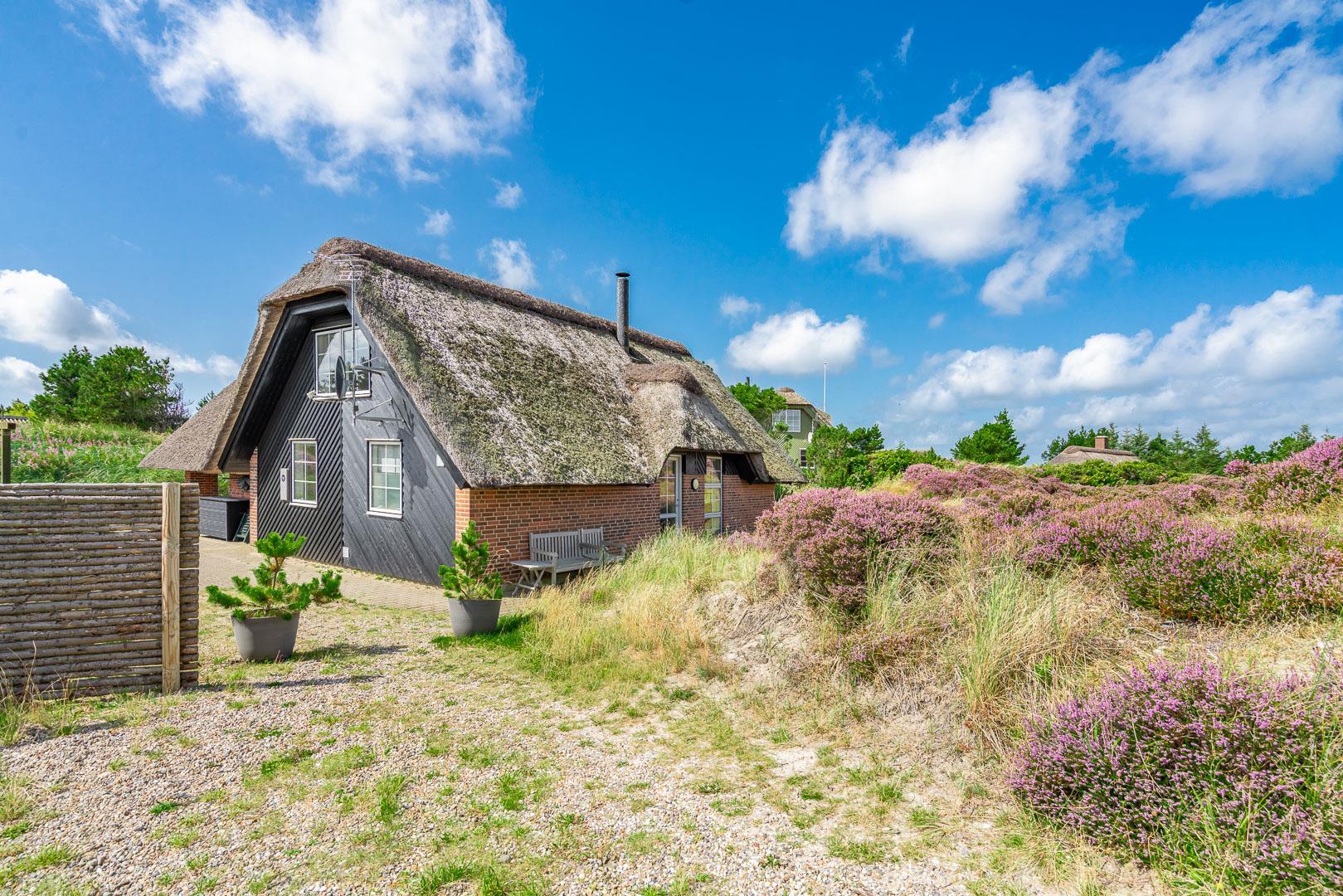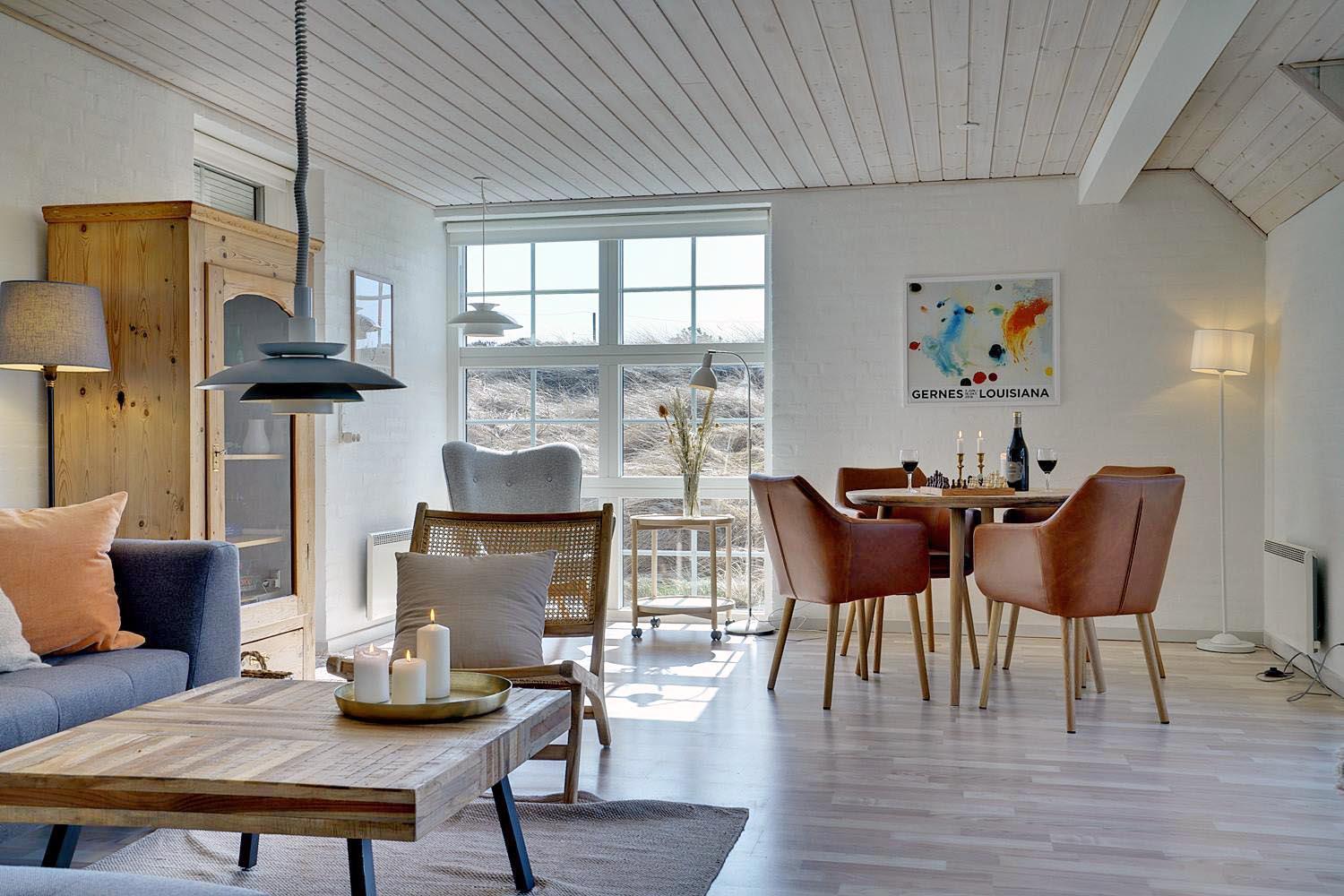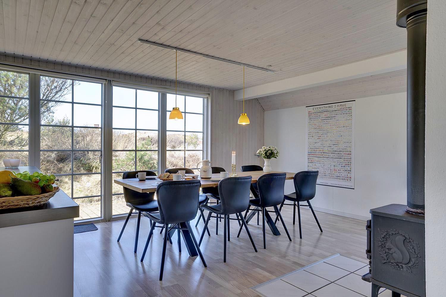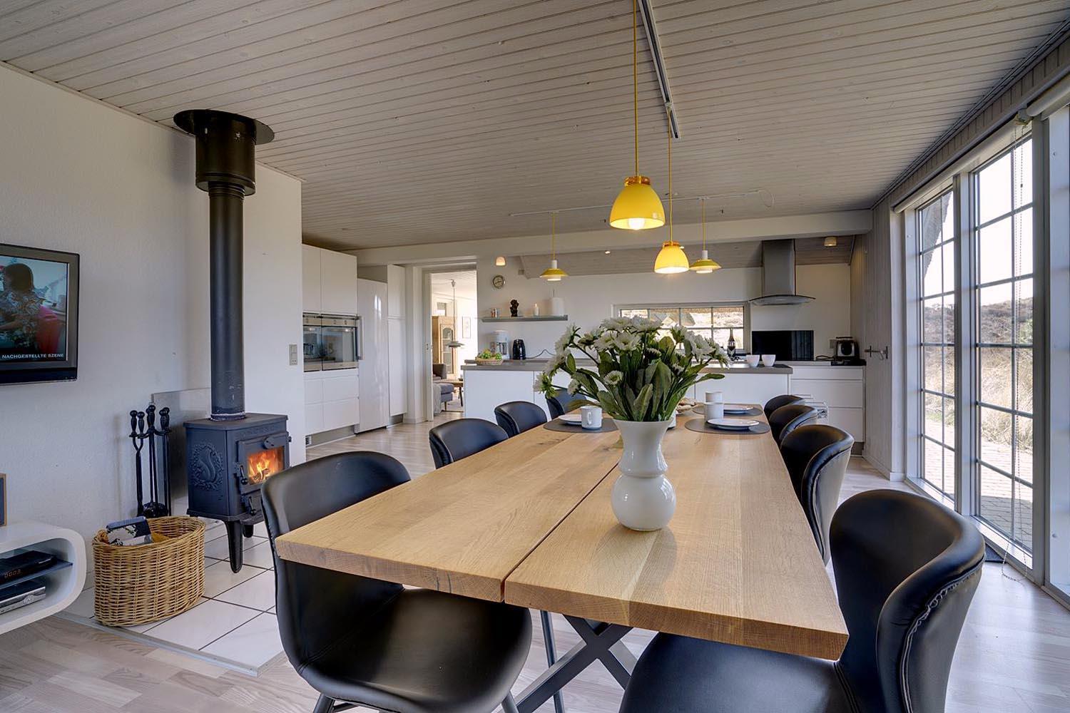 Det dejlige feriehus på 176 m2 er beliggende på en stor ugeneret og kuperet klitgrund i gåafstand til stranden. Huset fremstår overalt lyst om venligt og den store stue er smagfuld indrettet med gode og komfortable møbler. Stort veludstyret køkken/alrum hvor hele familien kan samle sig omkring middagen eller hygge sig med spil foran husets brændeovn.