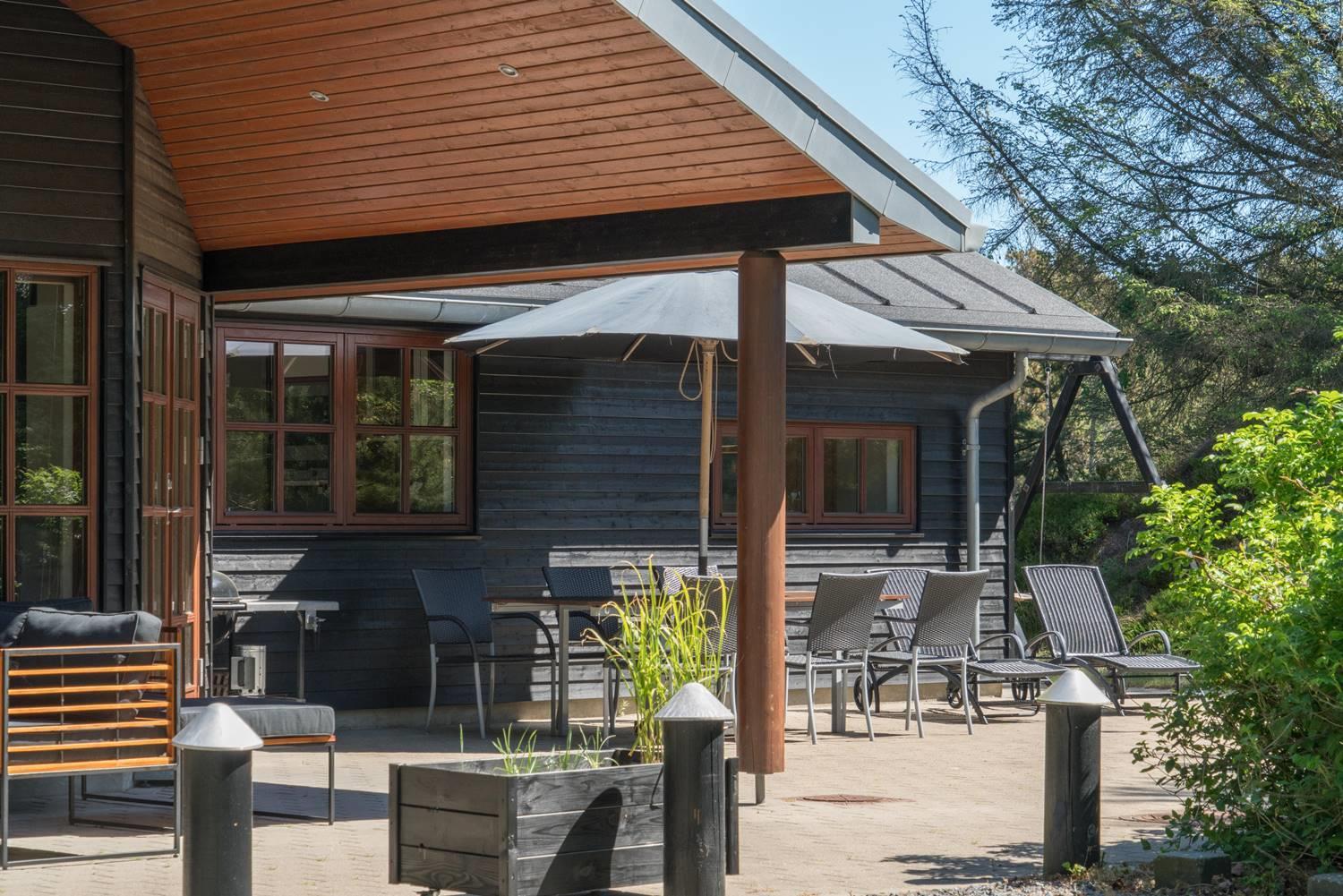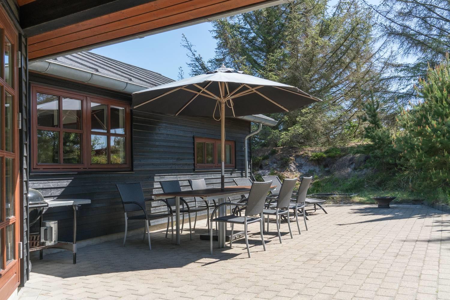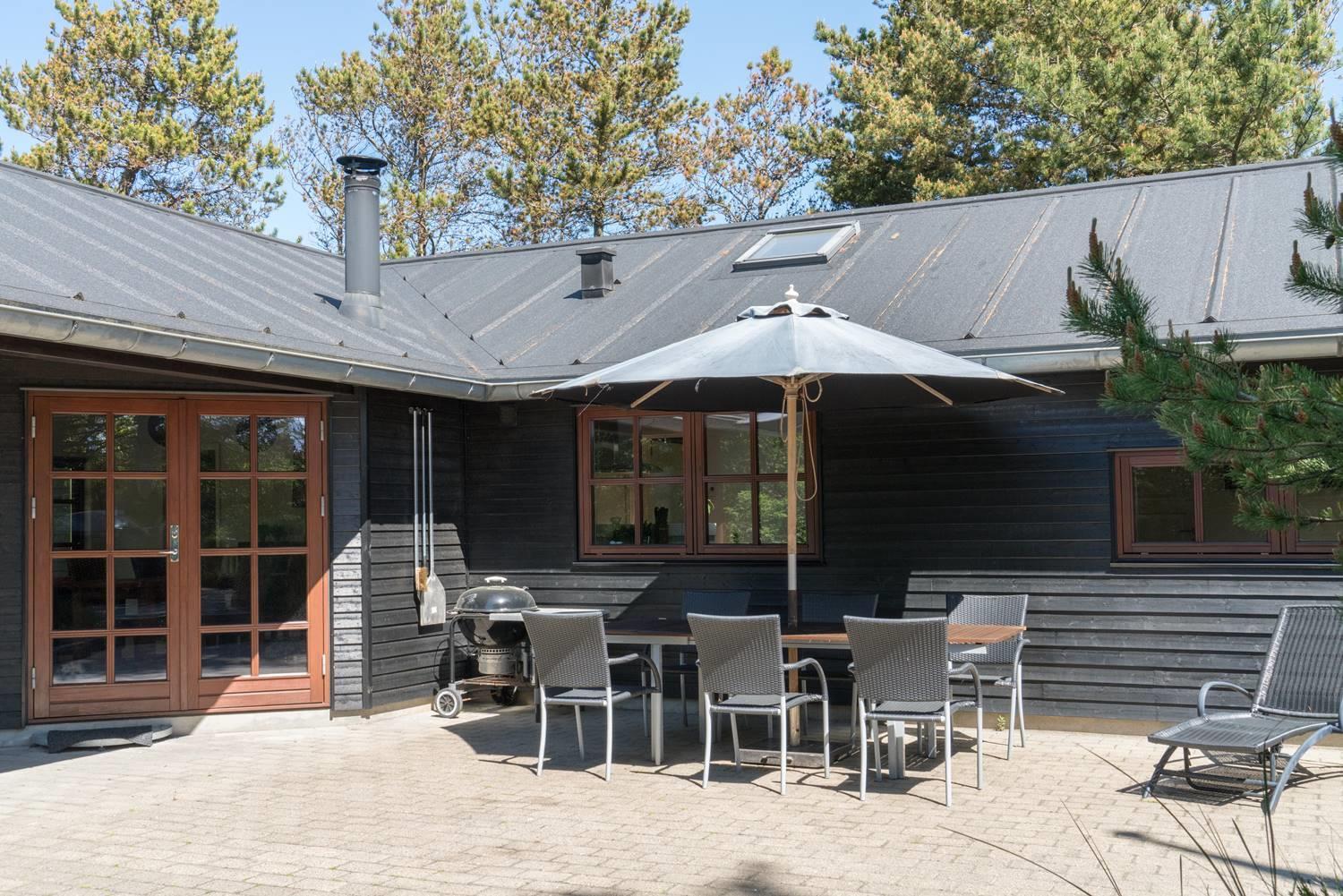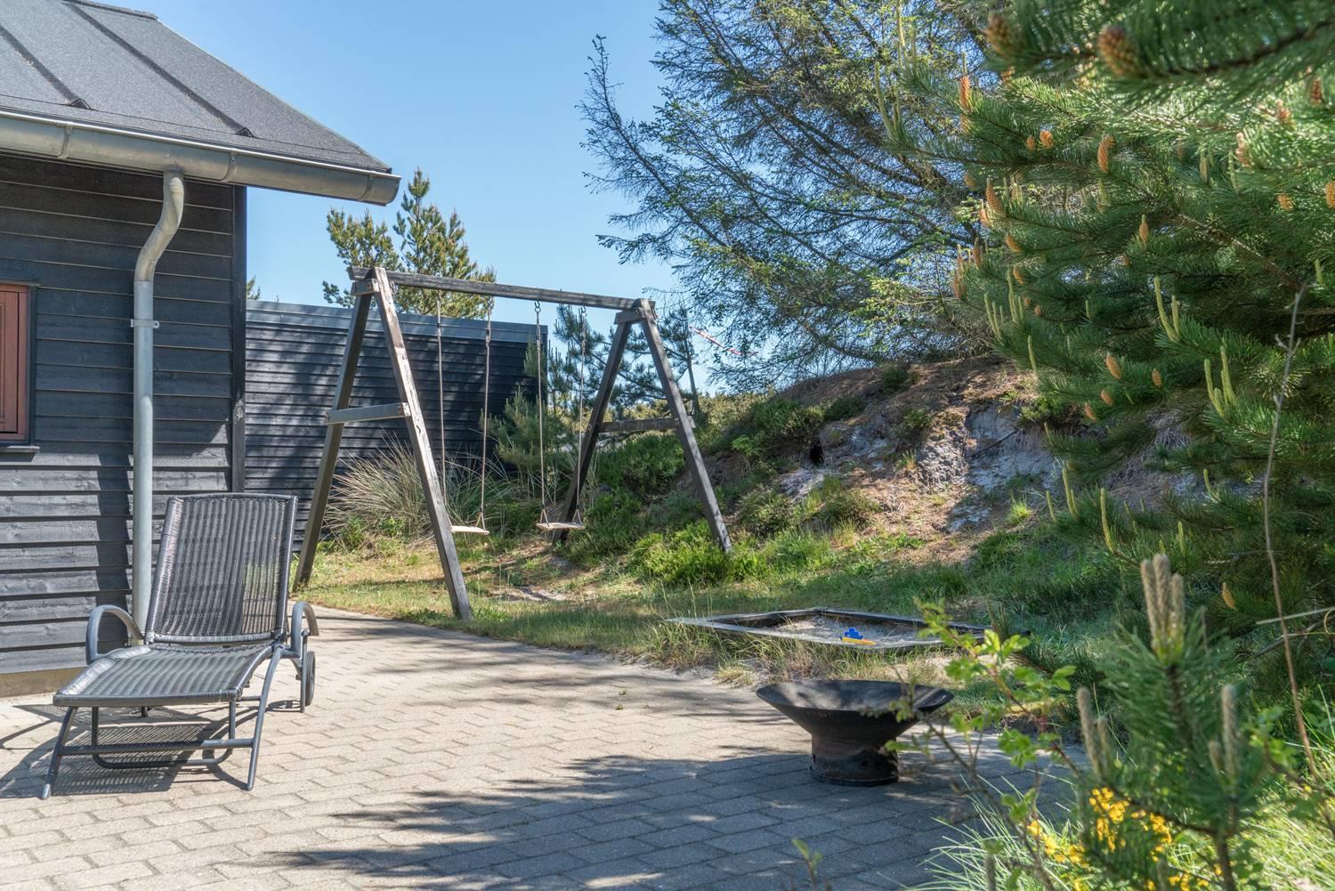 Lækkert feriehus beliggende på ugeneret, flot klitgrund omkranset af træer, buske og for enden af en blind vej. Huset fremtræder lyst og venligt med træloft som går op i kip. Opholdsstue, spiseafdeling og det veludstyrede køkken er i åben forbindelse. Omkring huset er der anlagt stor terrasse, hvorfra solen og freden kan nydes i fulde drag. Alle værelser er med boks- madrasser og det store badeværelse er udstyret med spabad og sauna. Udover badeværelset er der ekstra toilet, bruser. I dette pragtfulde feriehus er de perfekte rammer tilstede for en god ferie.