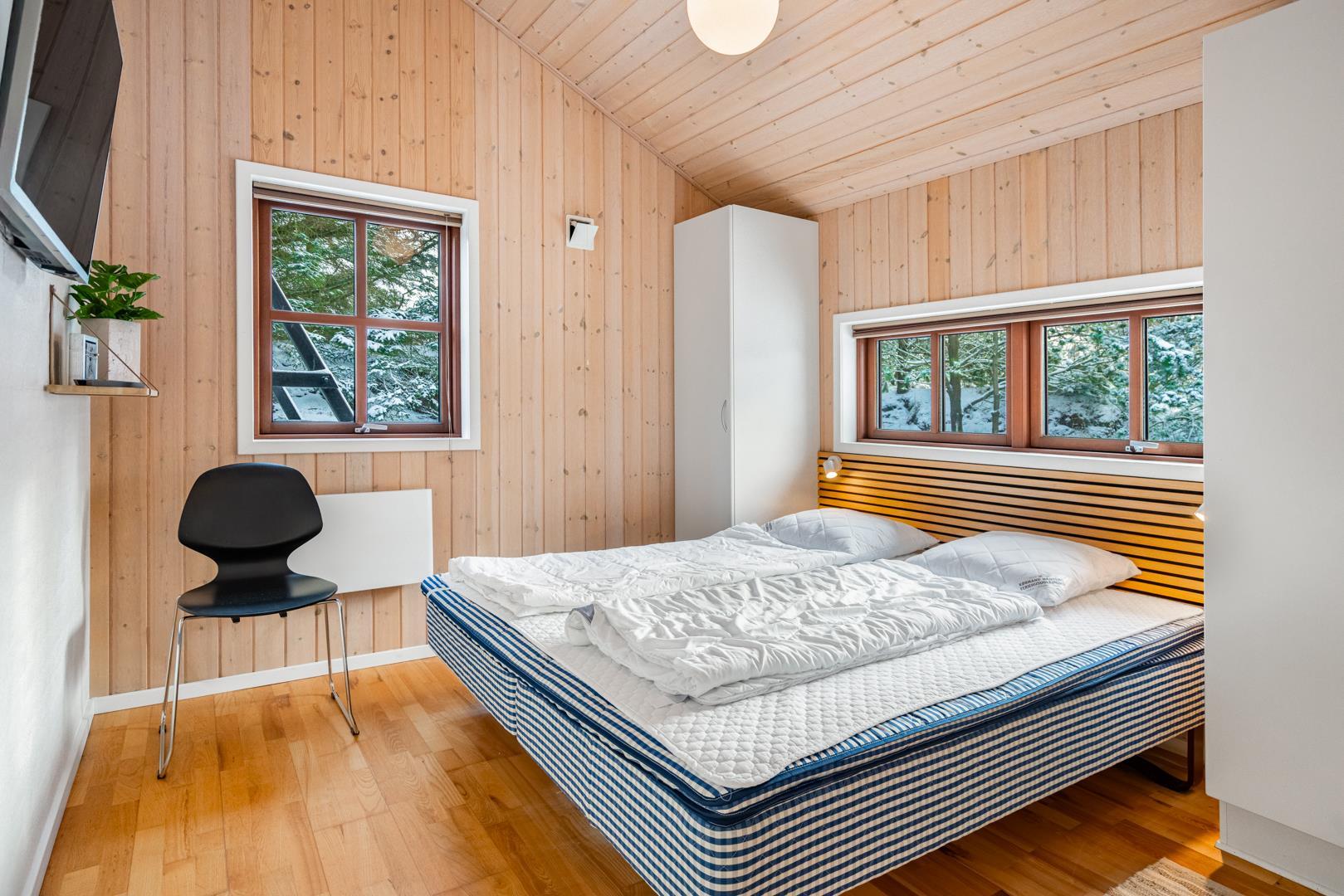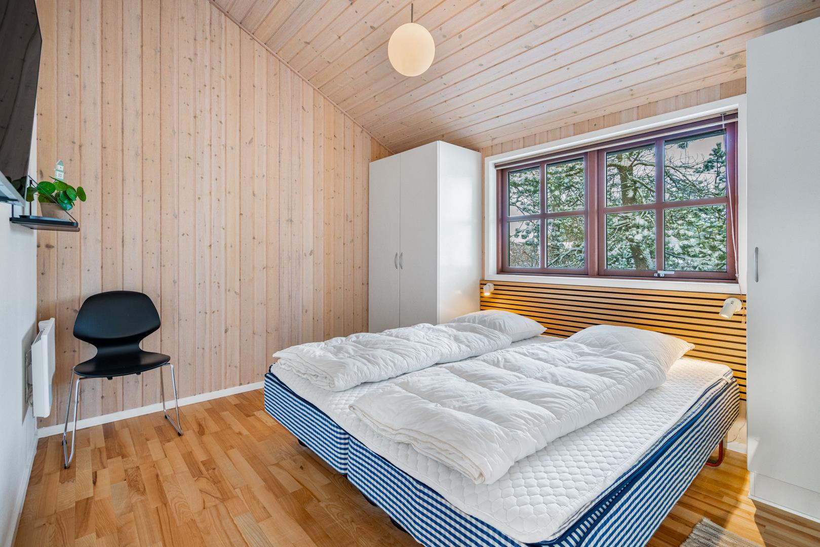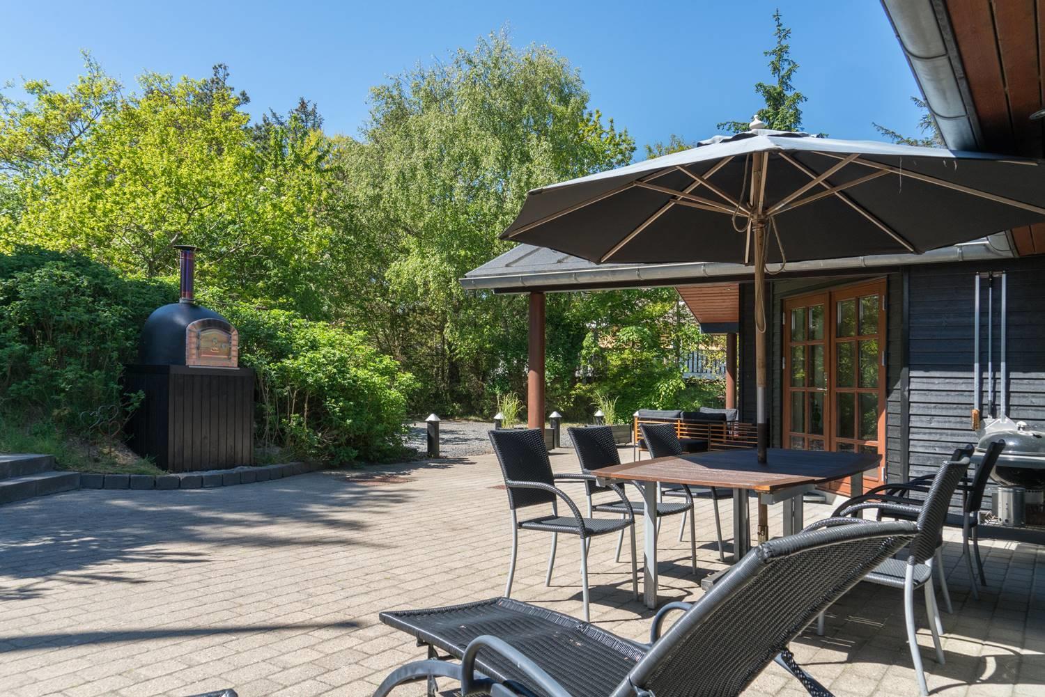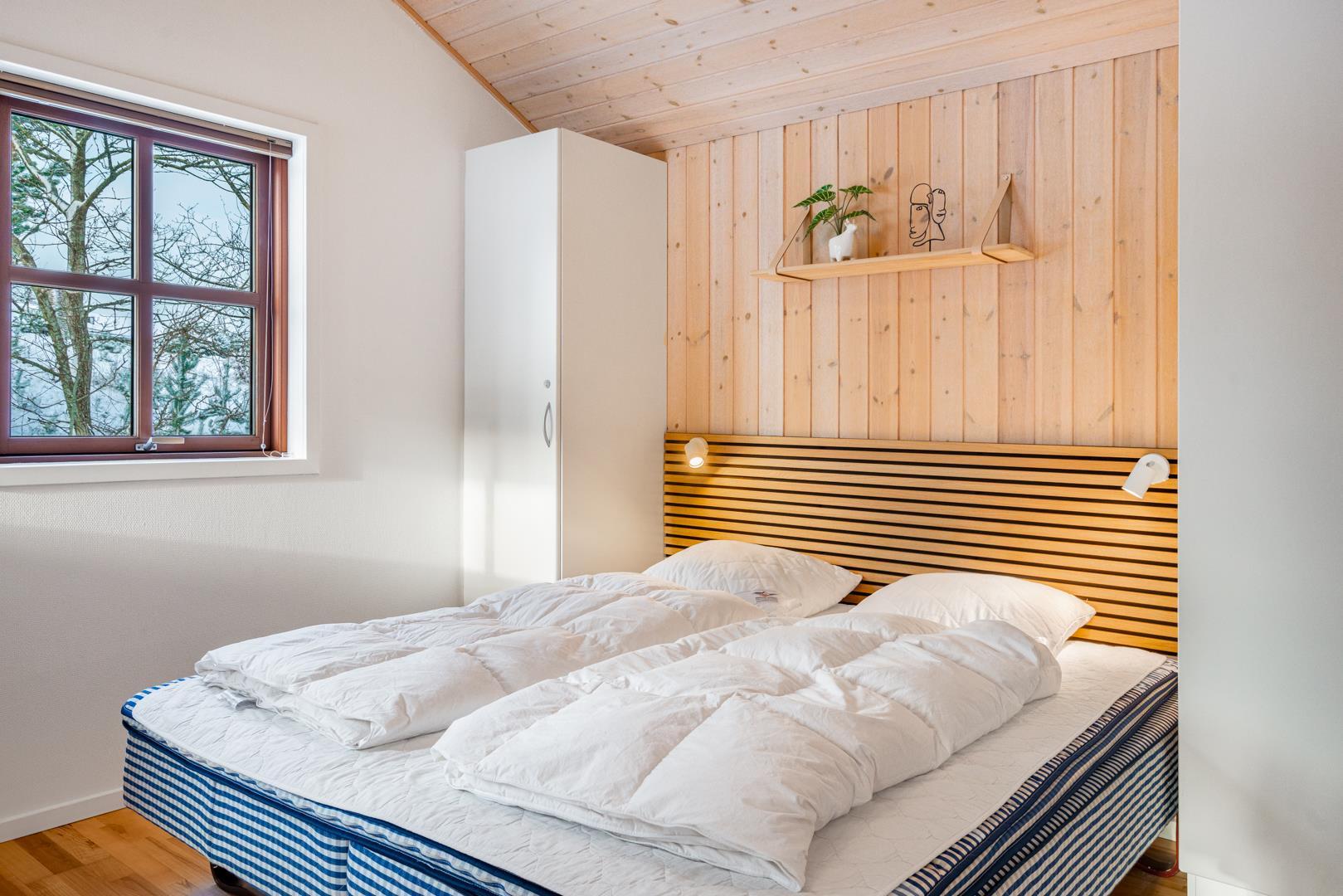 Lækkert feriehus beliggende på ugeneret, flot klitgrund omkranset af træer, buske og for enden af en blind vej. Huset fremtræder lyst og venligt med træloft som går op i kip. Opholdsstue, spiseafdeling og det veludstyrede køkken er i åben forbindelse. Omkring huset er der anlagt stor terrasse, hvorfra solen og freden kan nydes i fulde drag. Alle værelser er med boks- madrasser og det store badeværelse er udstyret med spabad og sauna. Udover badeværelset er der ekstra toilet, bruser. I dette pragtfulde feriehus er de perfekte rammer tilstede for en god ferie.
