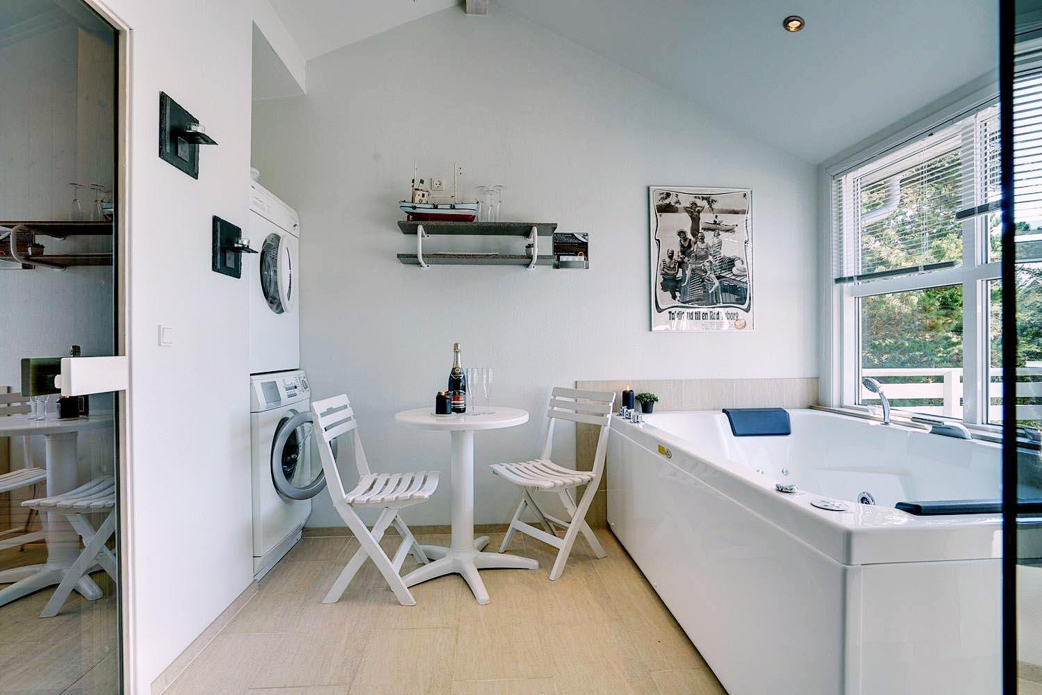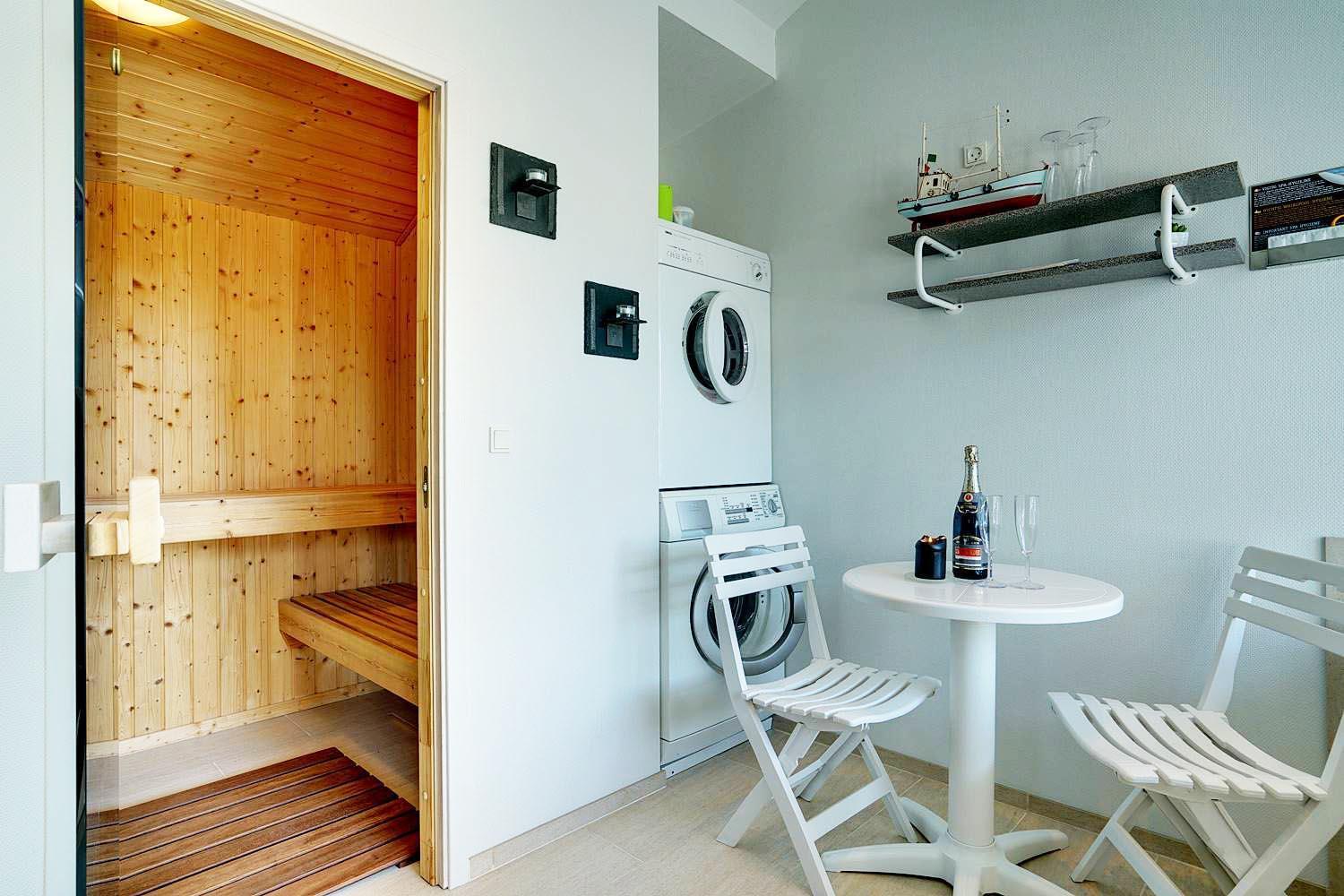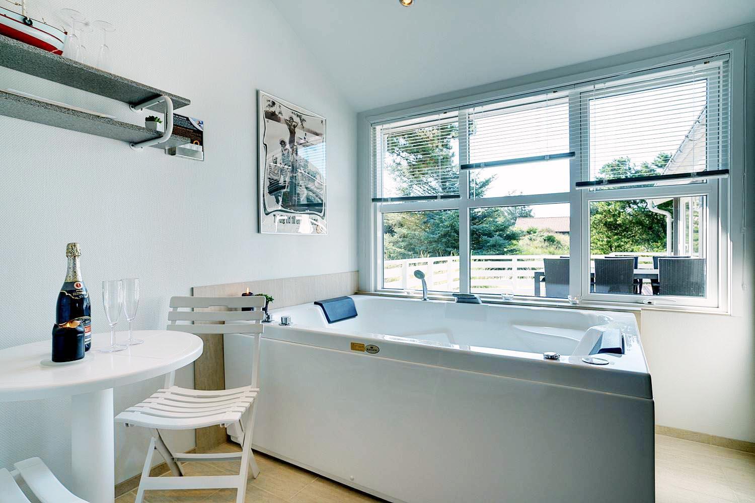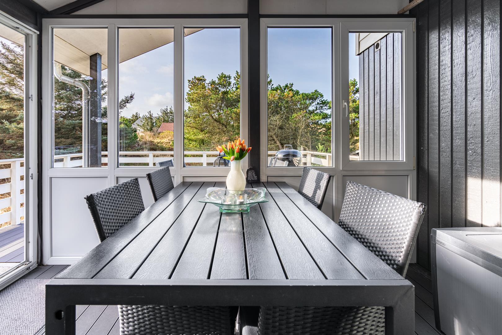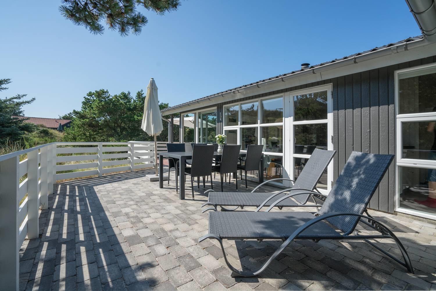 Huset byder på flere skønne terrasser samt en hyggelig udestue, hvor du kan nyde udsigten til naturen uanset vejret. Med to badeværelser med bruser, en separat wellnessafdeling med badekar og sauna, får du de perfekte rammer for afslapning.