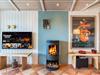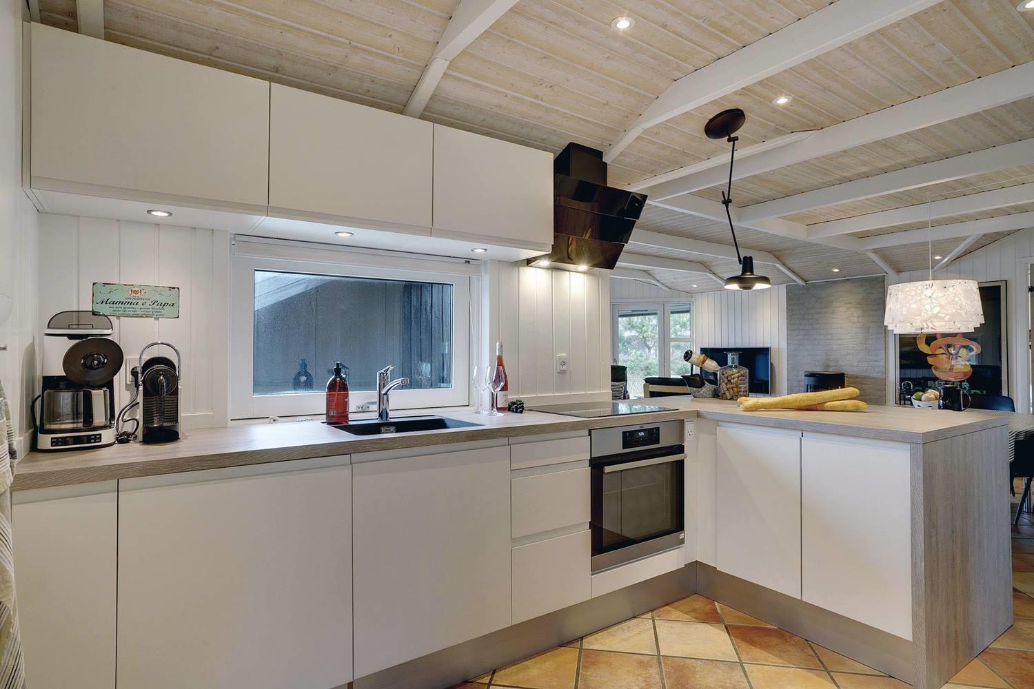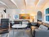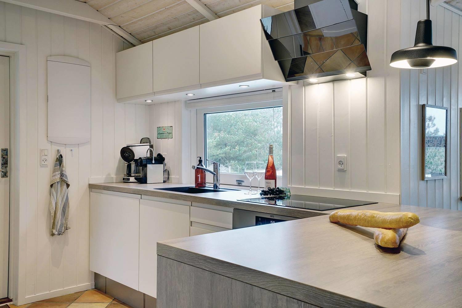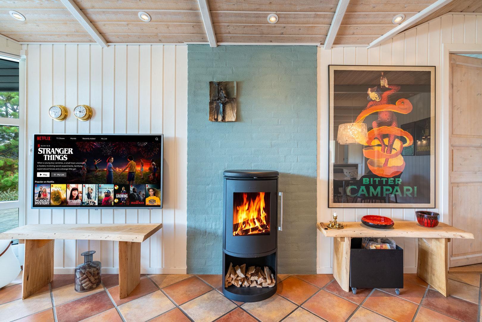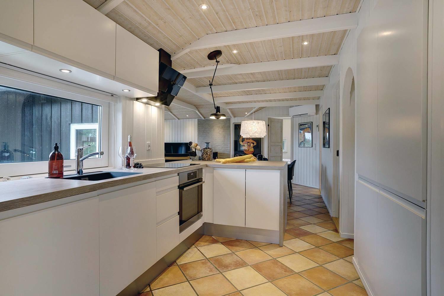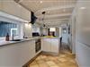 Det nyere køkken ligger i åben forbindelse med den smagfuldt møblerede stue, hvor I kan samles til madlavning, spil og afslapning foran brændeovnen.