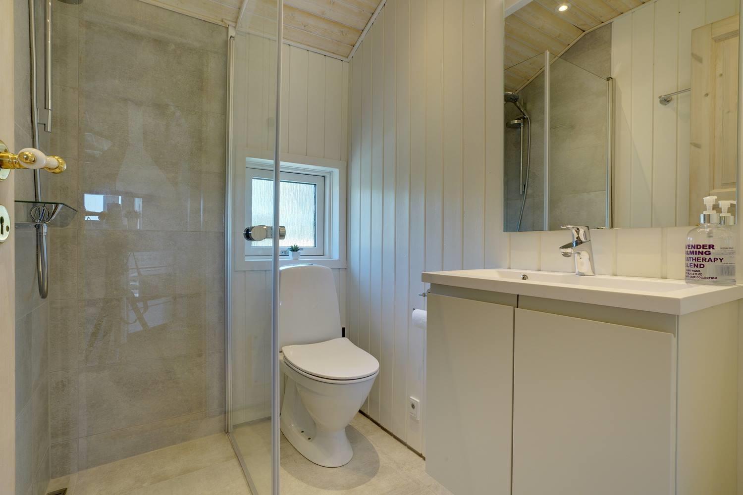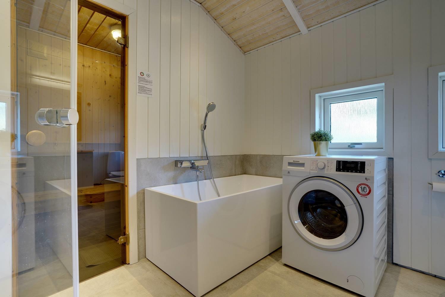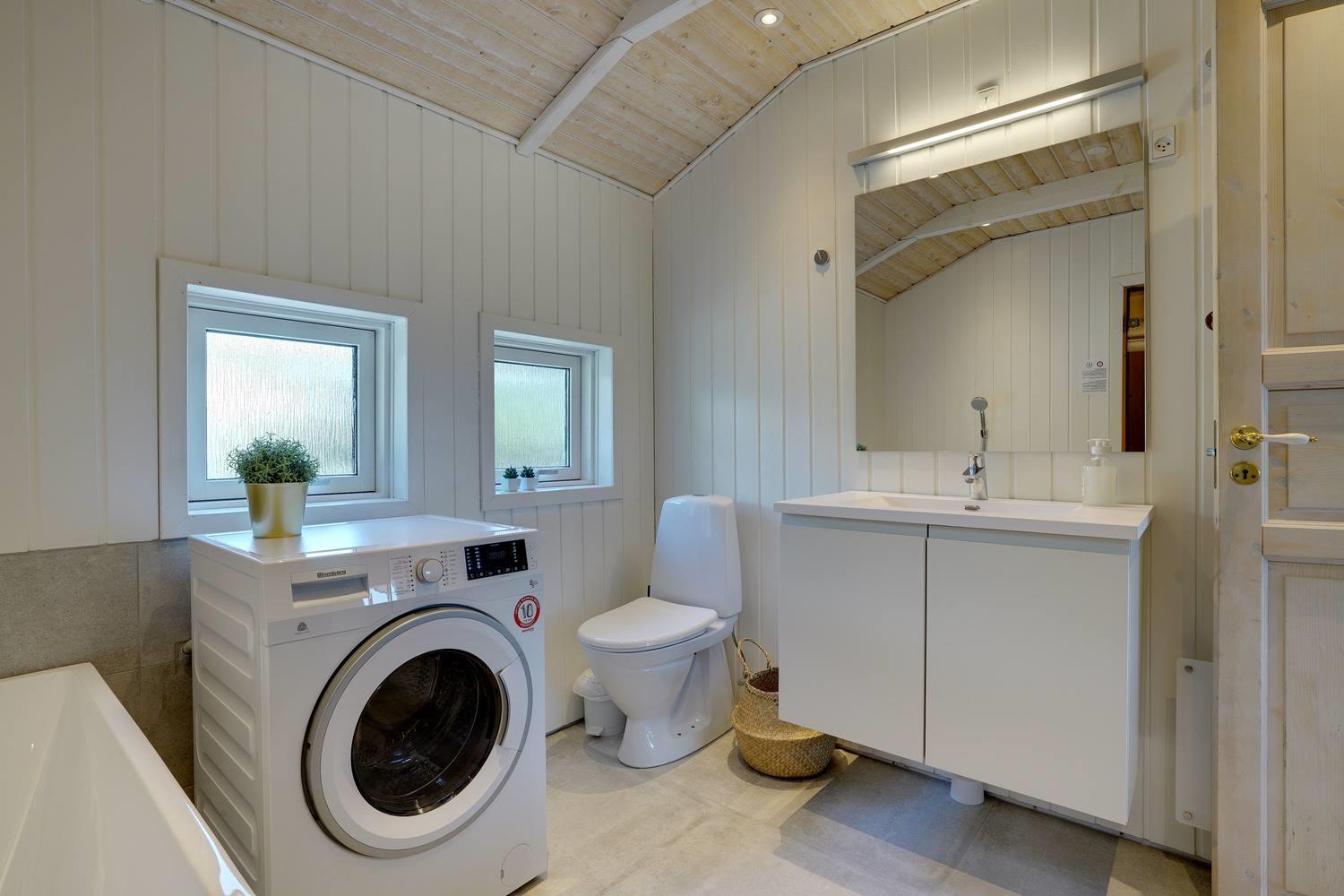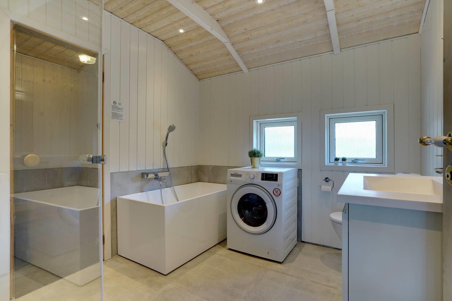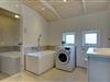 Her er desuden to meget flotte badeværelser, begge i høj kvalitet – det ene med både badekar, sauna, vaskemaskine og tørretumbler.