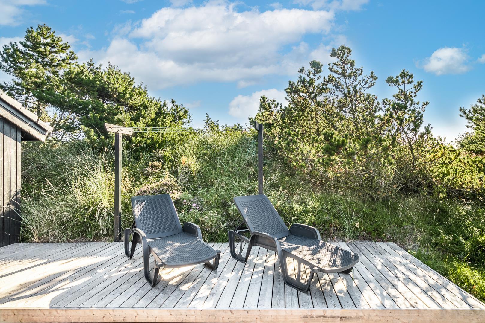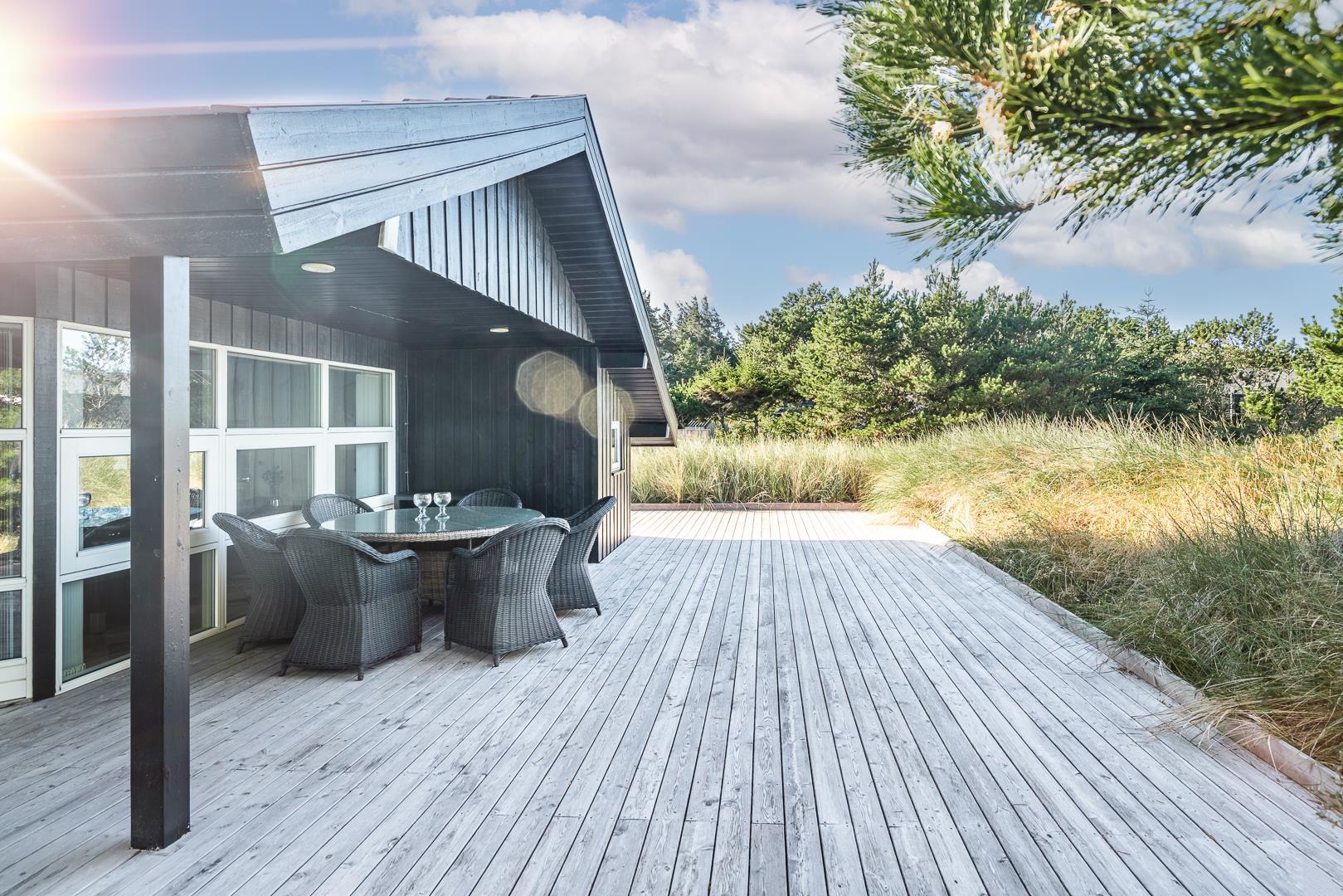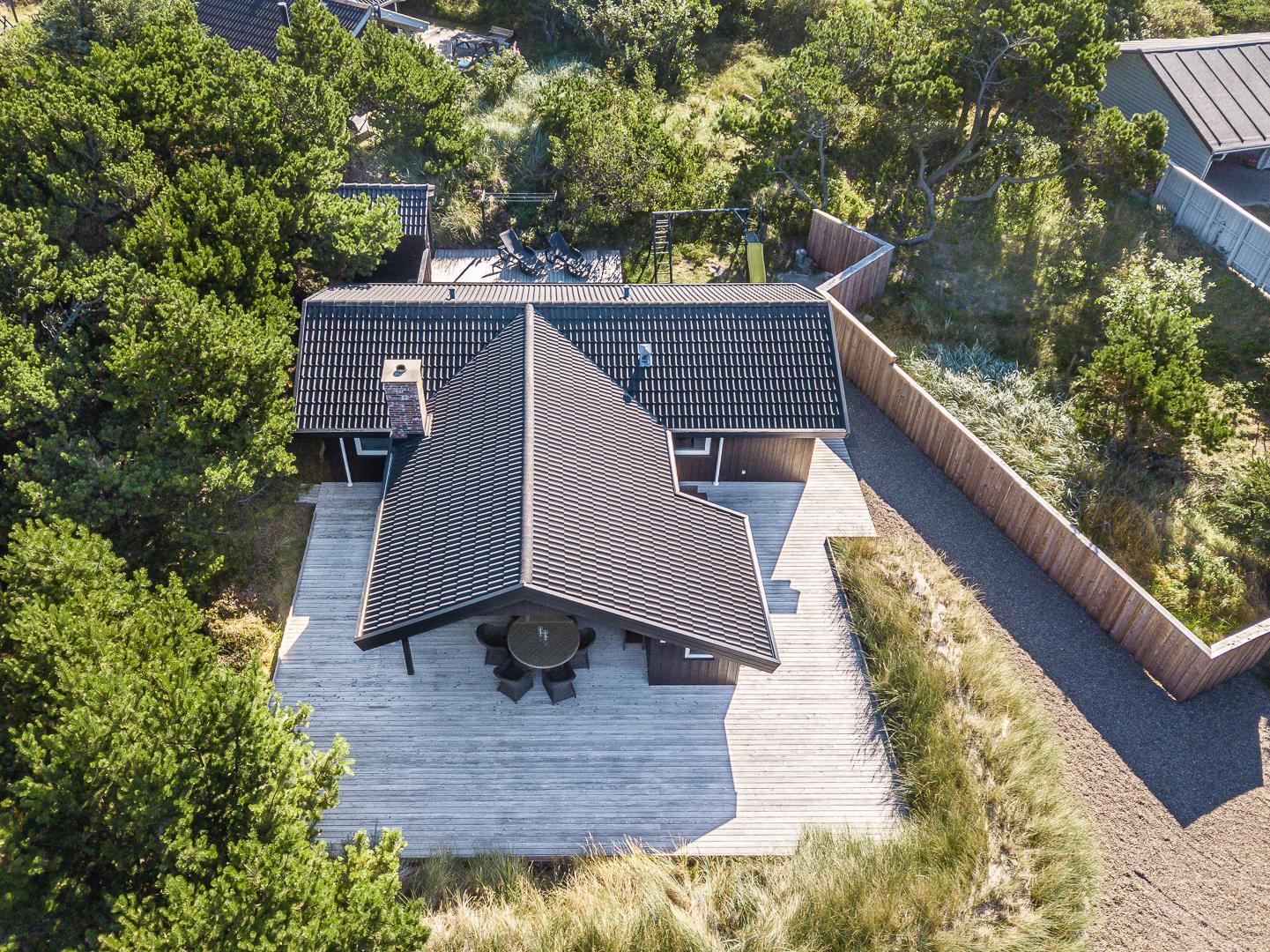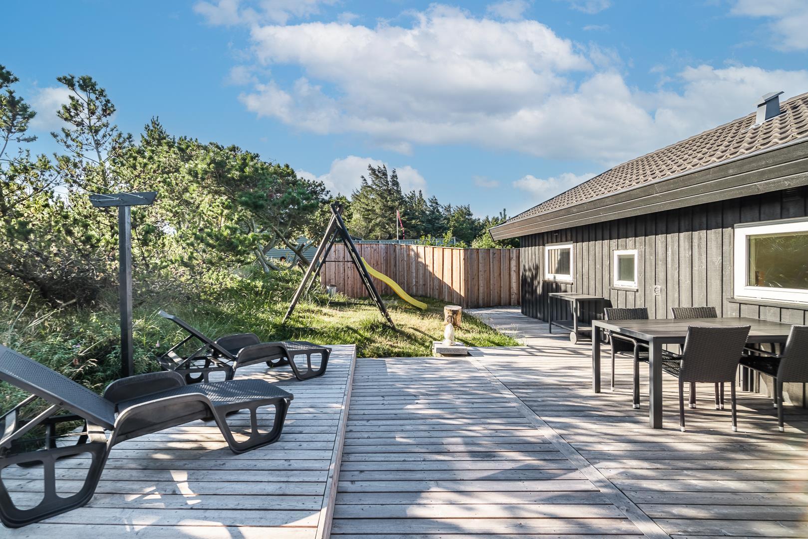 Rundt om huset breder sig store, solrige træterrasser, hvor I altid kan finde en læfyldt krog – uanset tidspunkt på dagen. Her er plads til grillhygge, solbadning eller bare en stille stund med en god bog.