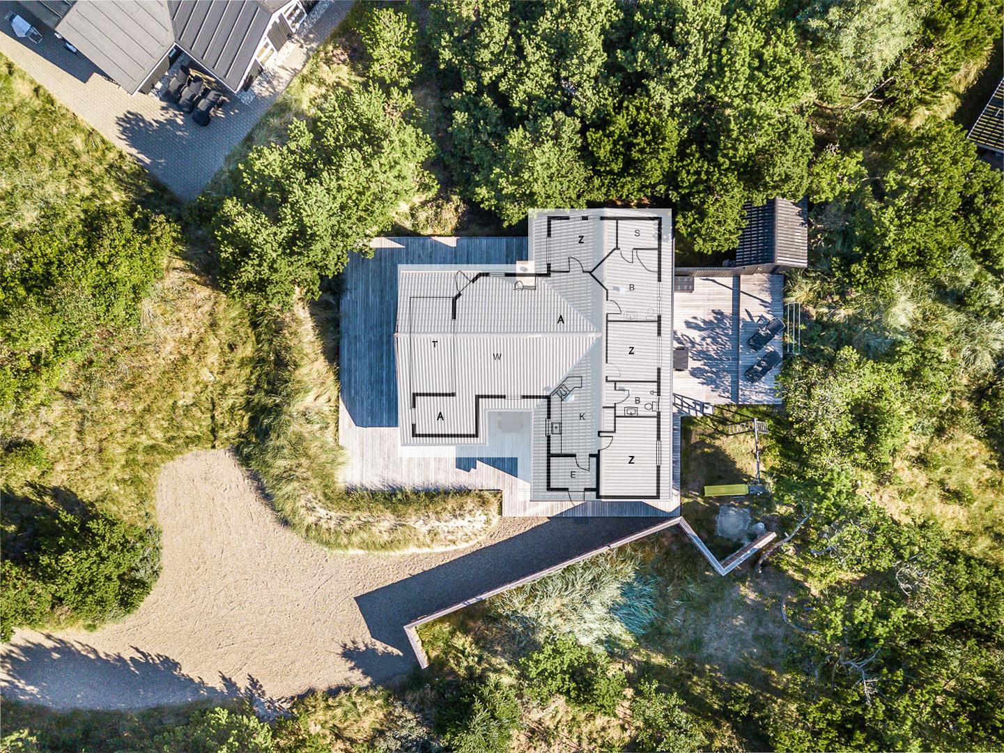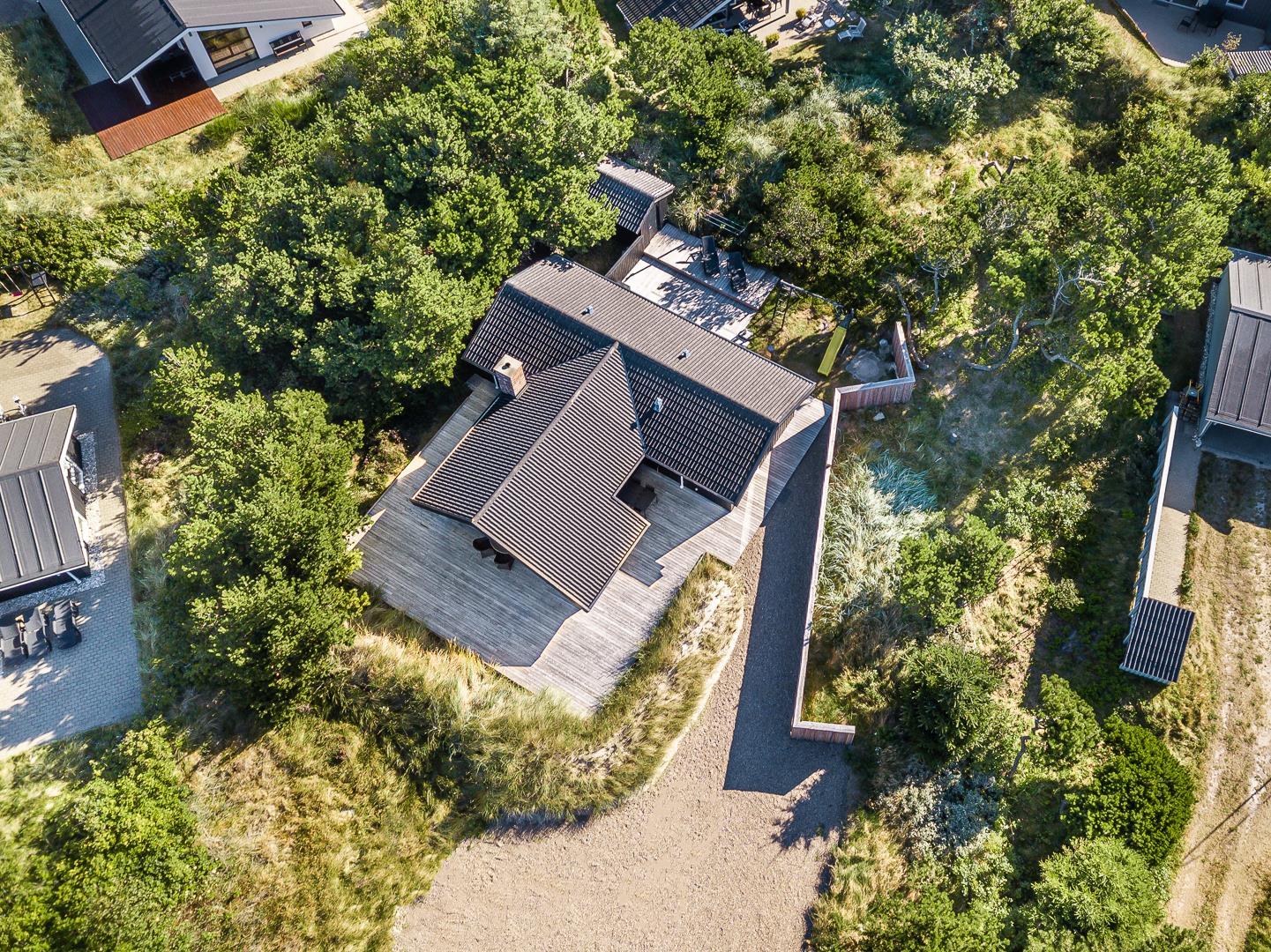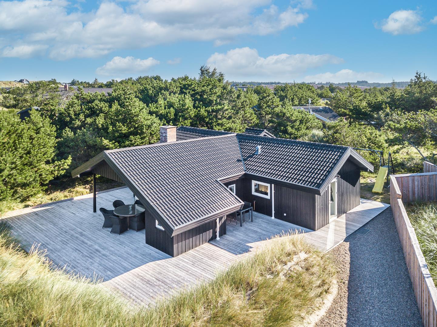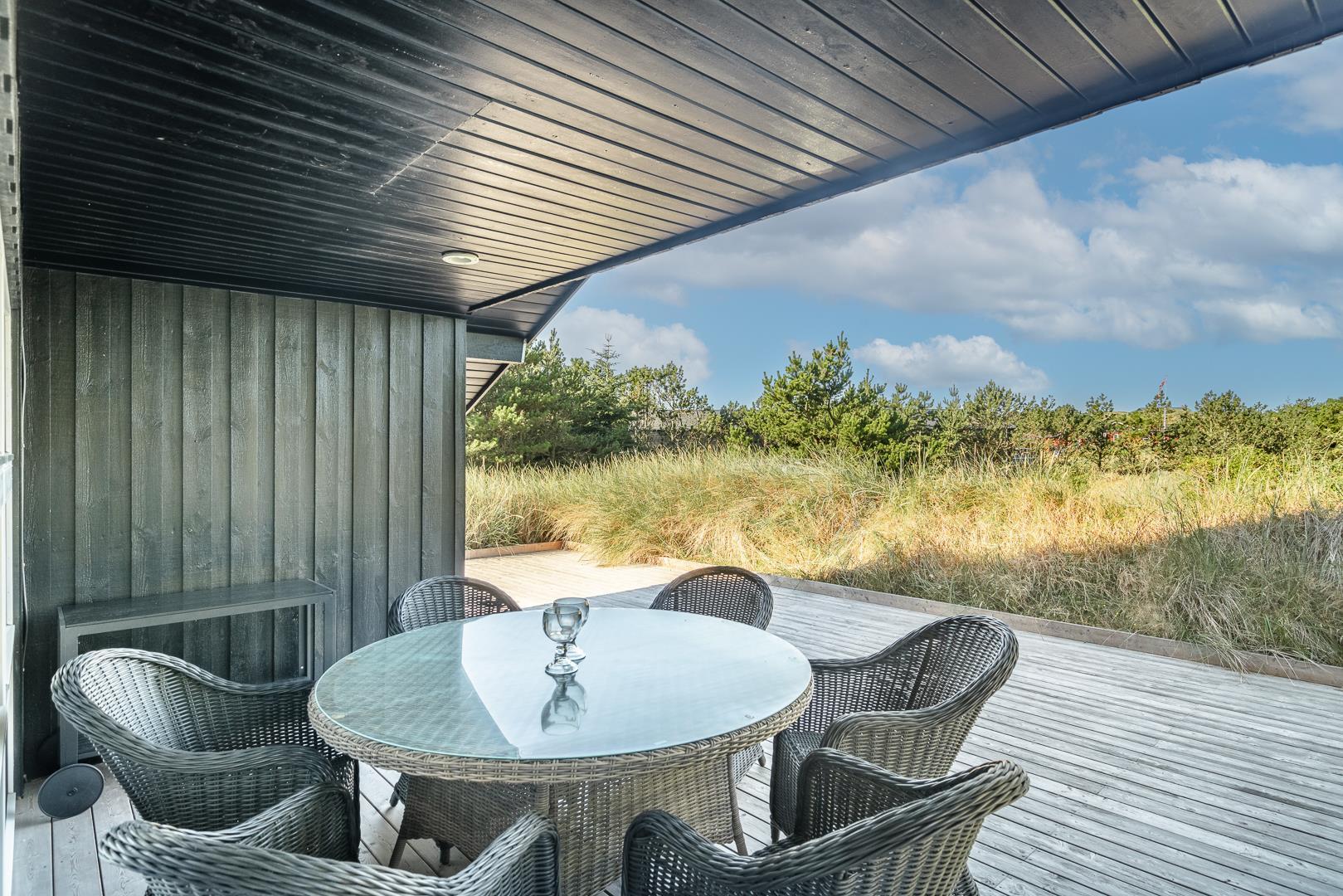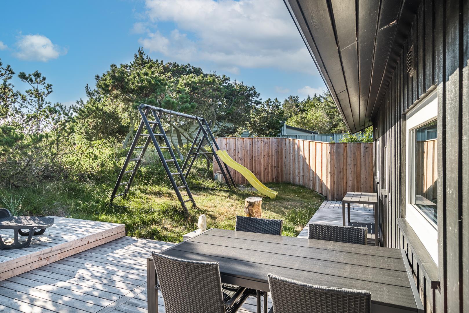 Rundt om huset breder sig store, solrige træterrasser, hvor I altid kan finde en læfyldt krog – uanset tidspunkt på dagen. Her er plads til grillhygge, solbadning eller bare en stille stund med en god bog.