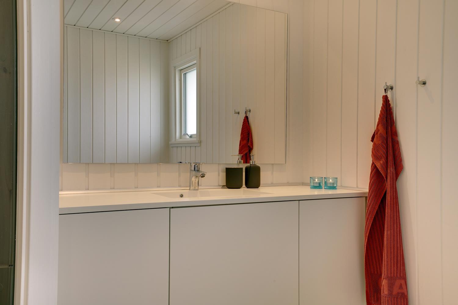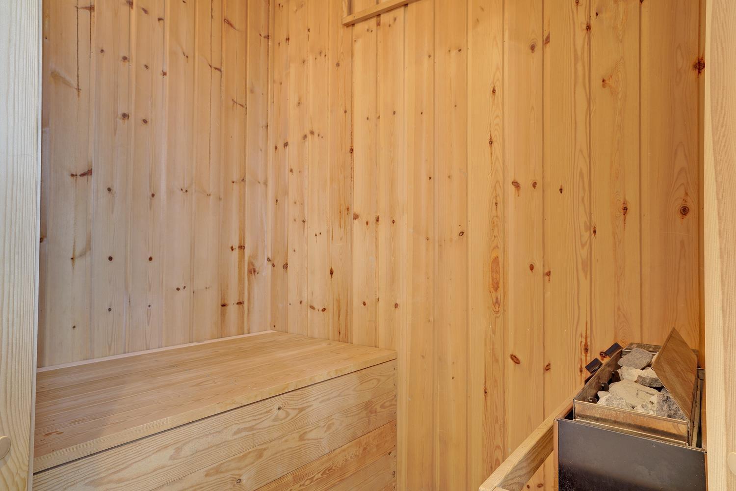 Badeværelset er nyrenoveret og stilfuldt, og herfra er der direkte adgang til husets sauna, hvor du kan slappe af efter en dag fyldt med oplevelser.