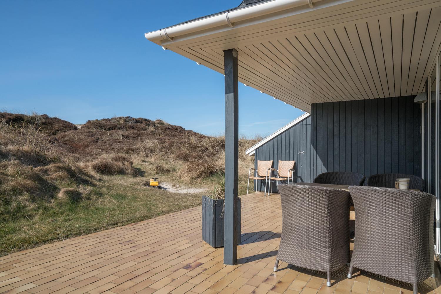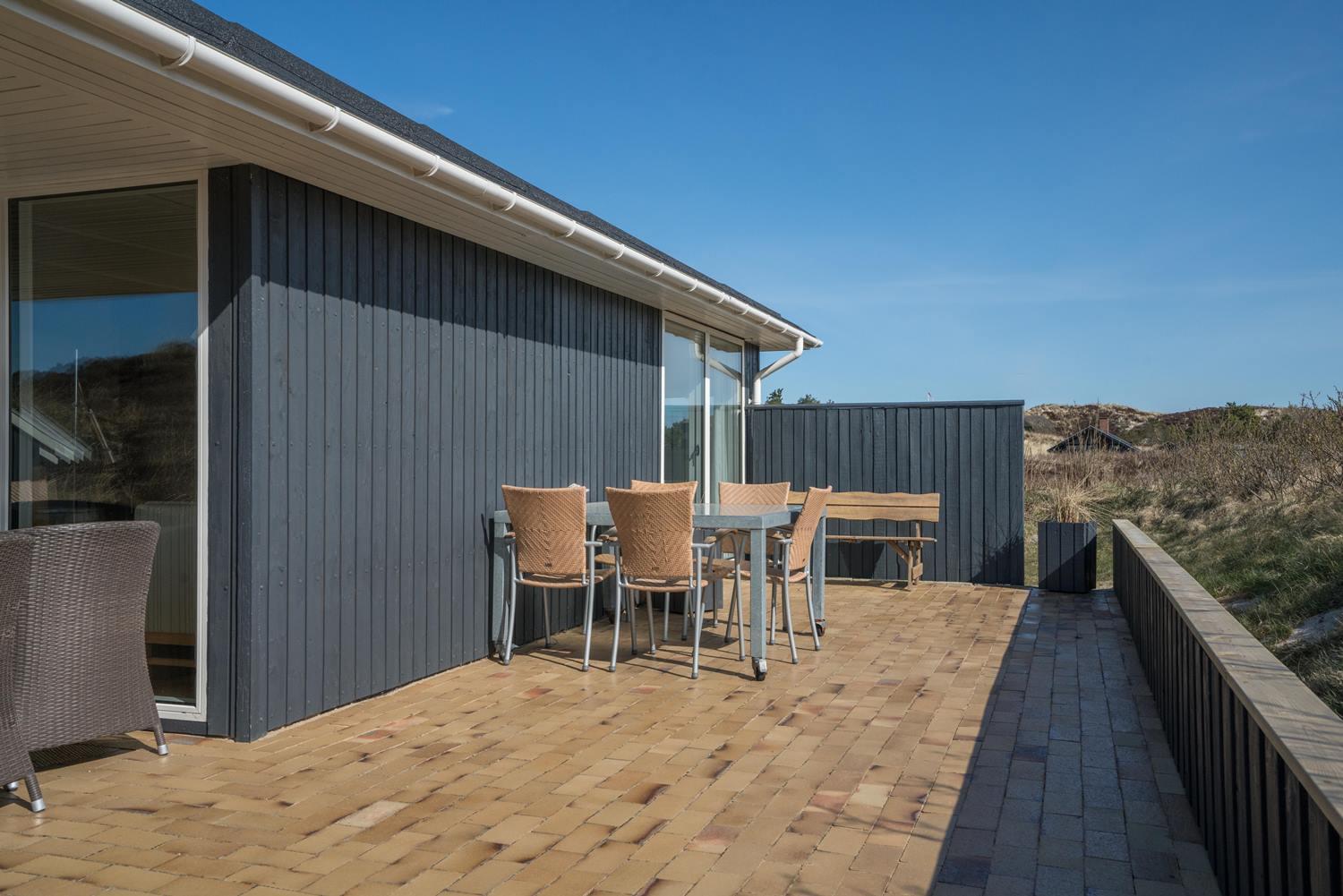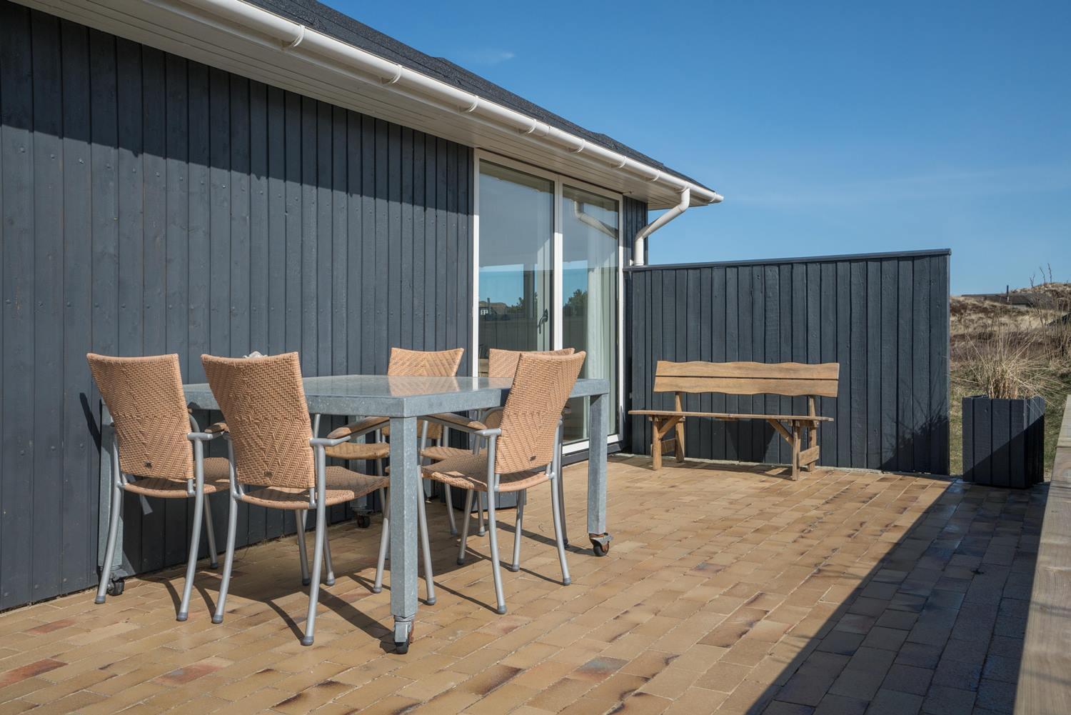 Udendørs venter en stor og meget ugeneret terrasse, hvor du kan nyde solen, grille og bare koble helt af i den friske vestjyske luft.
