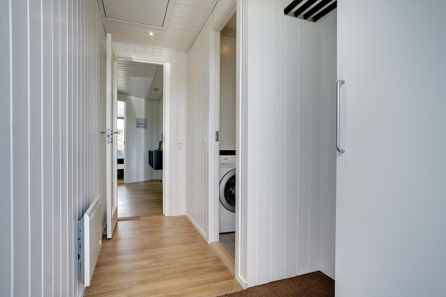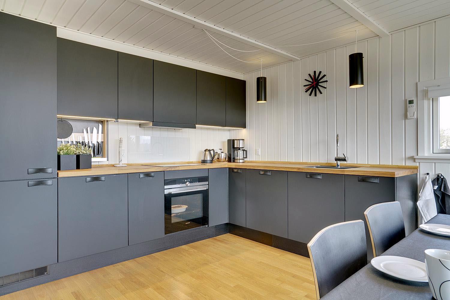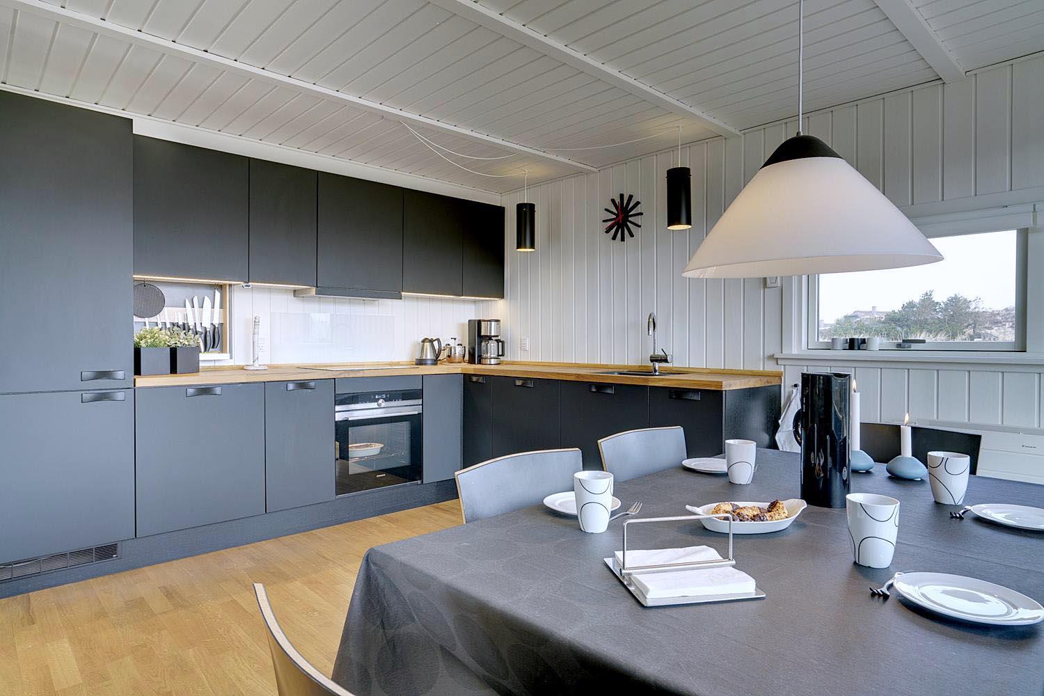 Hjelmevej 154 - Henne Strand er smagfuldt og hyggeligt indrettet med kvalitetsmøbler og trægulve i hele huset, hvilket skaber en varm og indbydende atmosfære. Det moderne køkken ligger i åben forbindelse med stuen, hvilket gør det nemt at samles til gode måltider og hyggelige stunder.