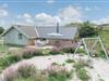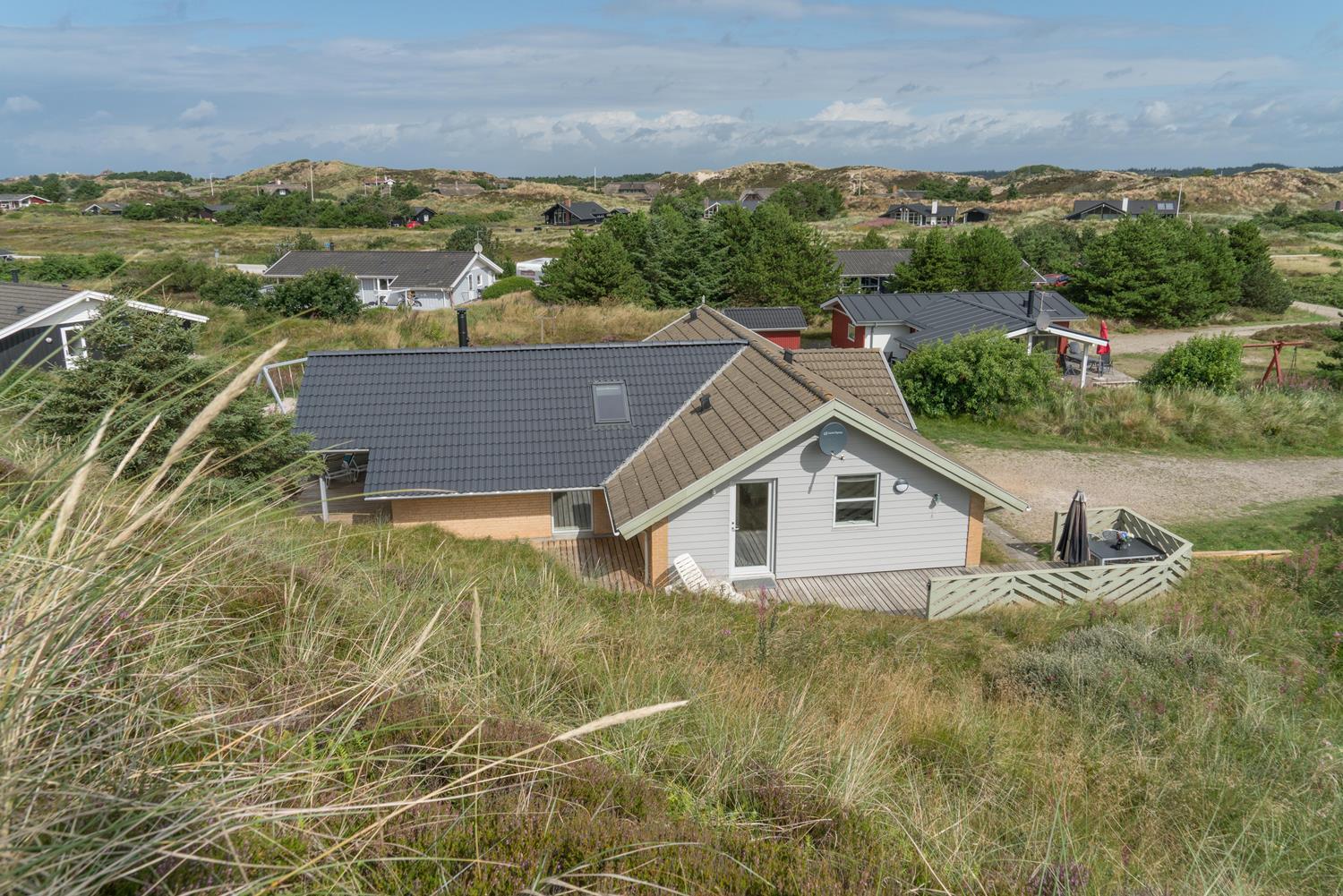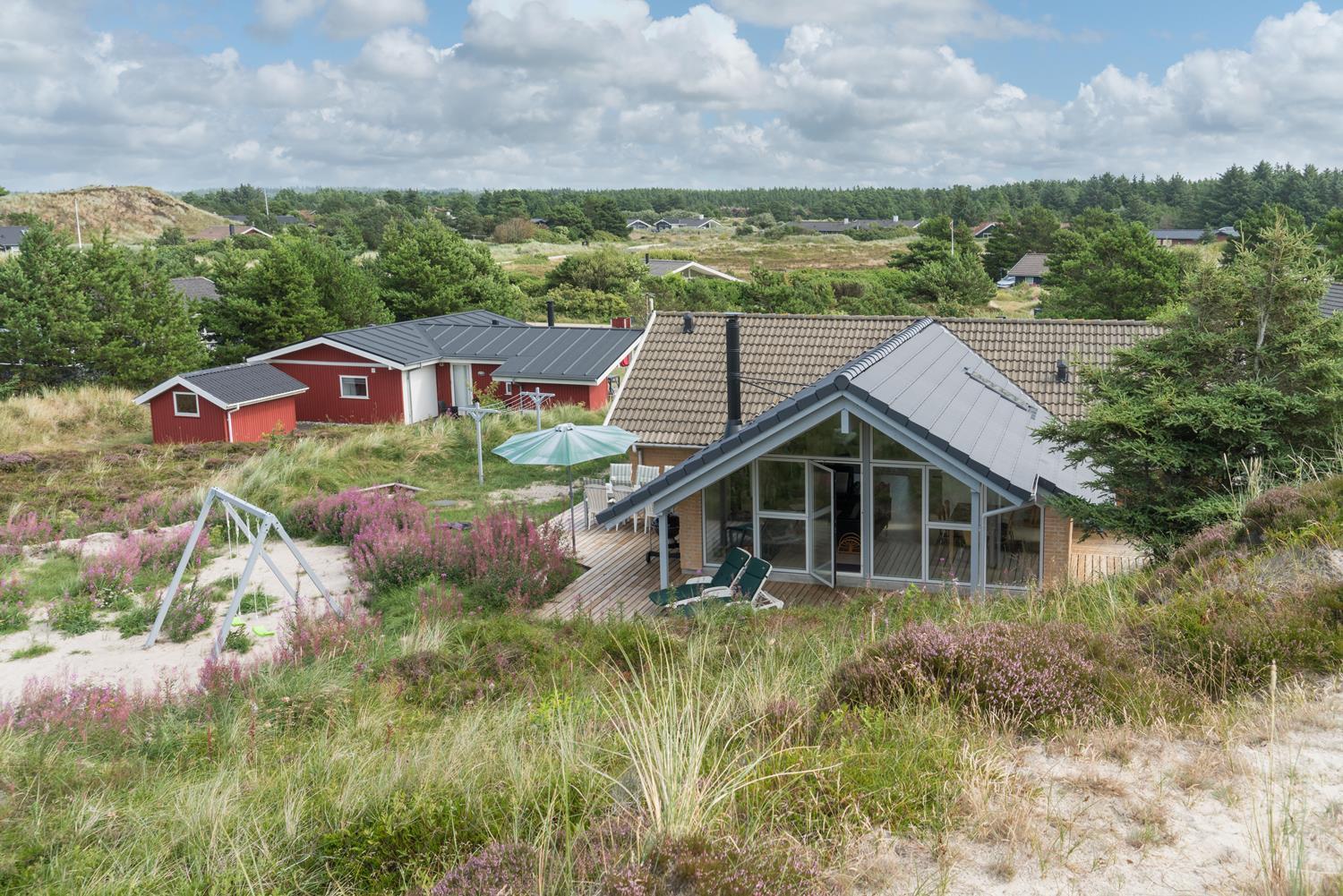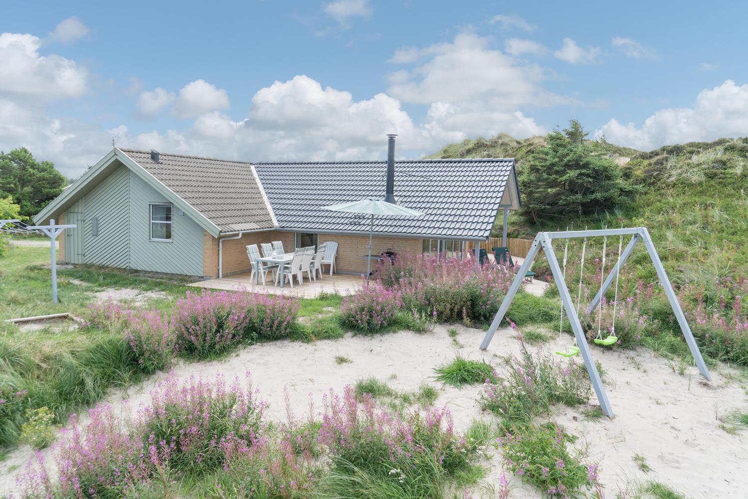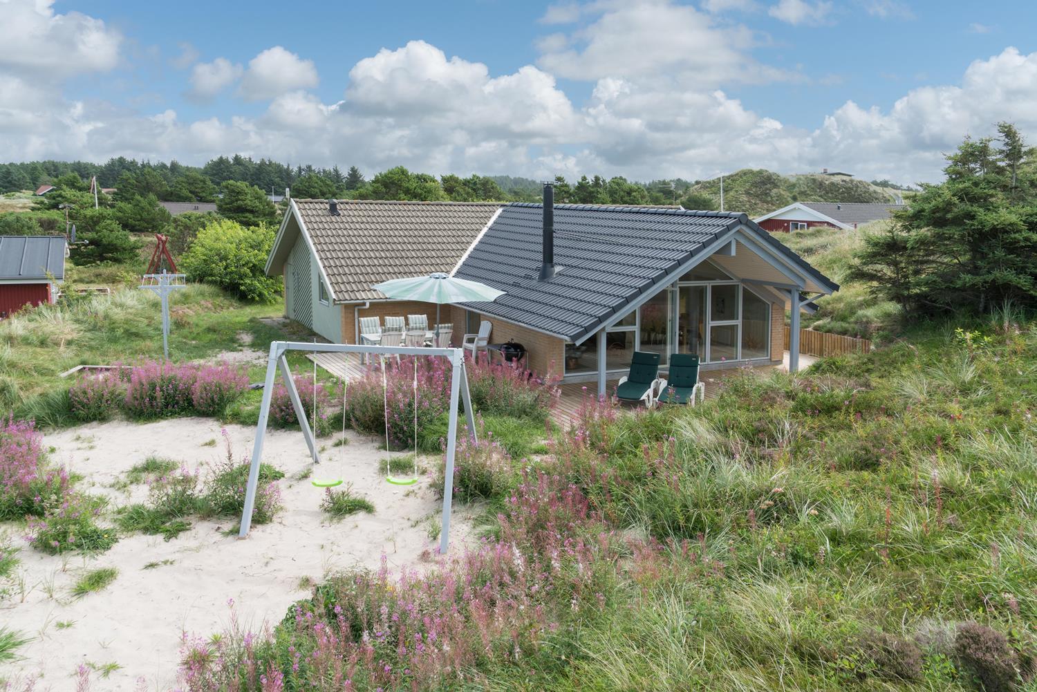 En del af terrassen er overdækket, så man kan flytte ind under tag når duggen falder. Bag huset er der en høj klit, som giver læ på terrassen. Der er også tænkt på de små gæster. Der er både sandkasse og gynge.