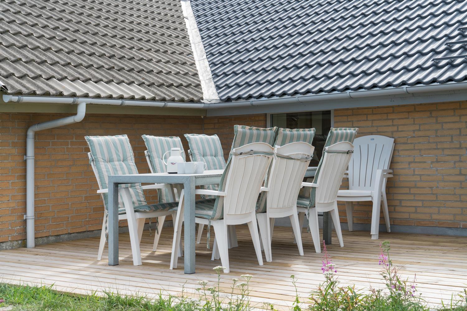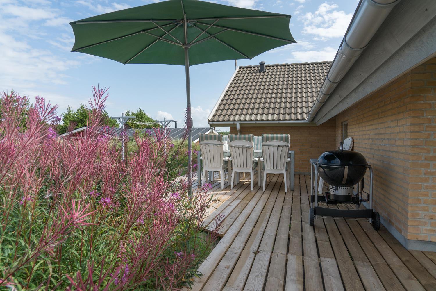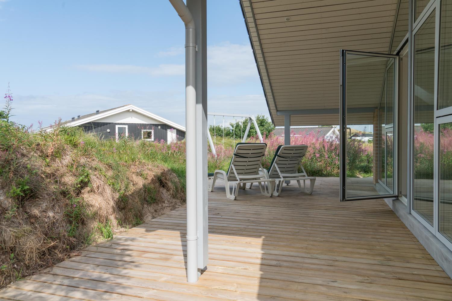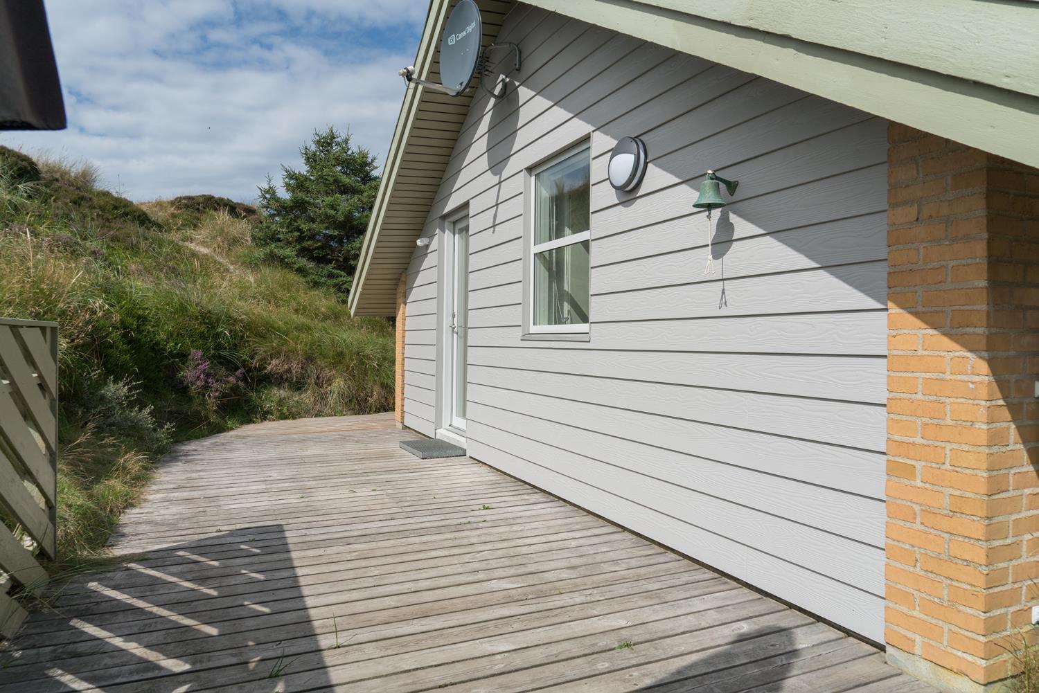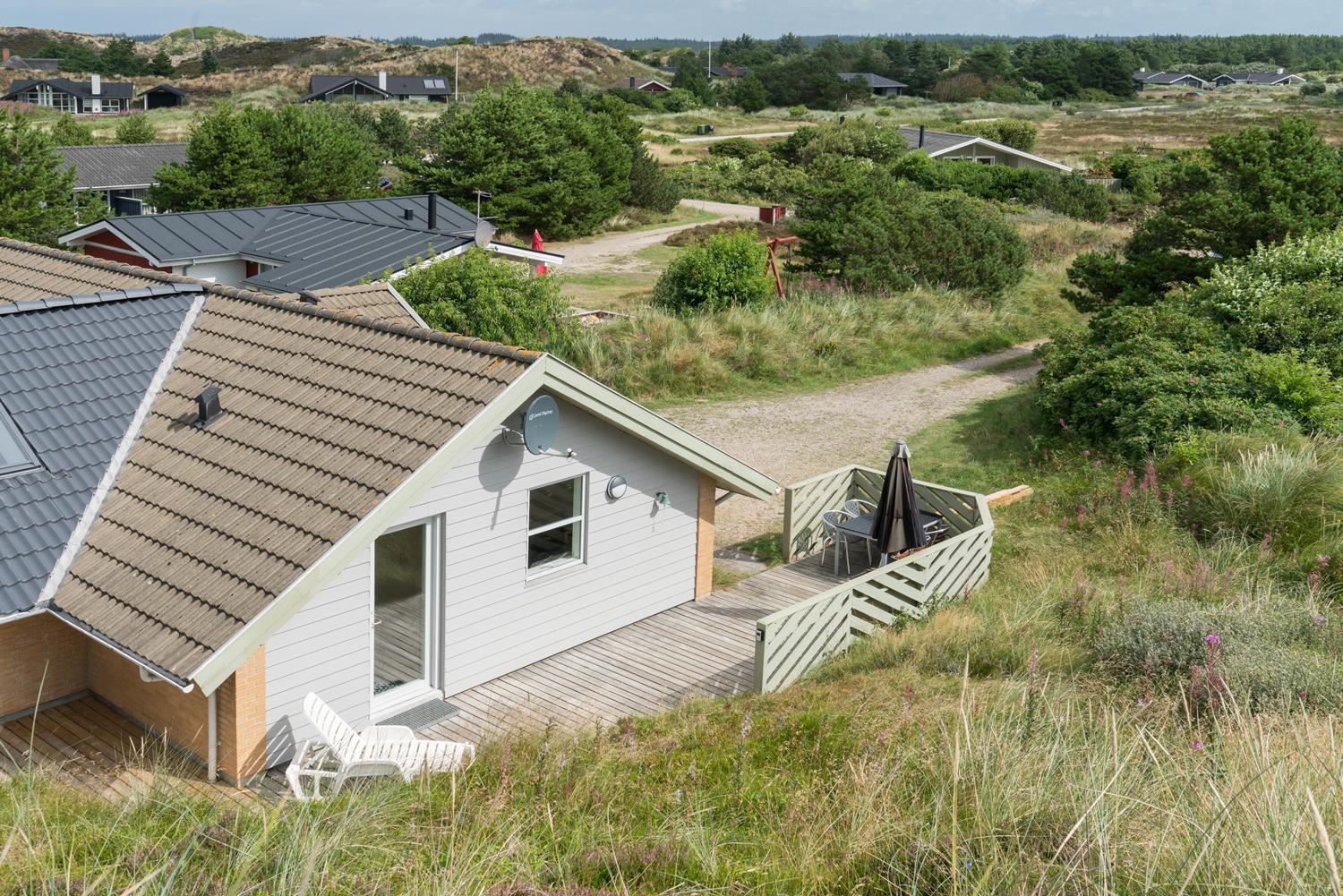 En del af terrassen er overdækket, så man kan flytte ind under tag når duggen falder. Bag huset er der en høj klit, som giver læ på terrassen. Der er også tænkt på de små gæster. Der er både sandkasse og gynge.