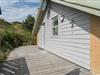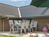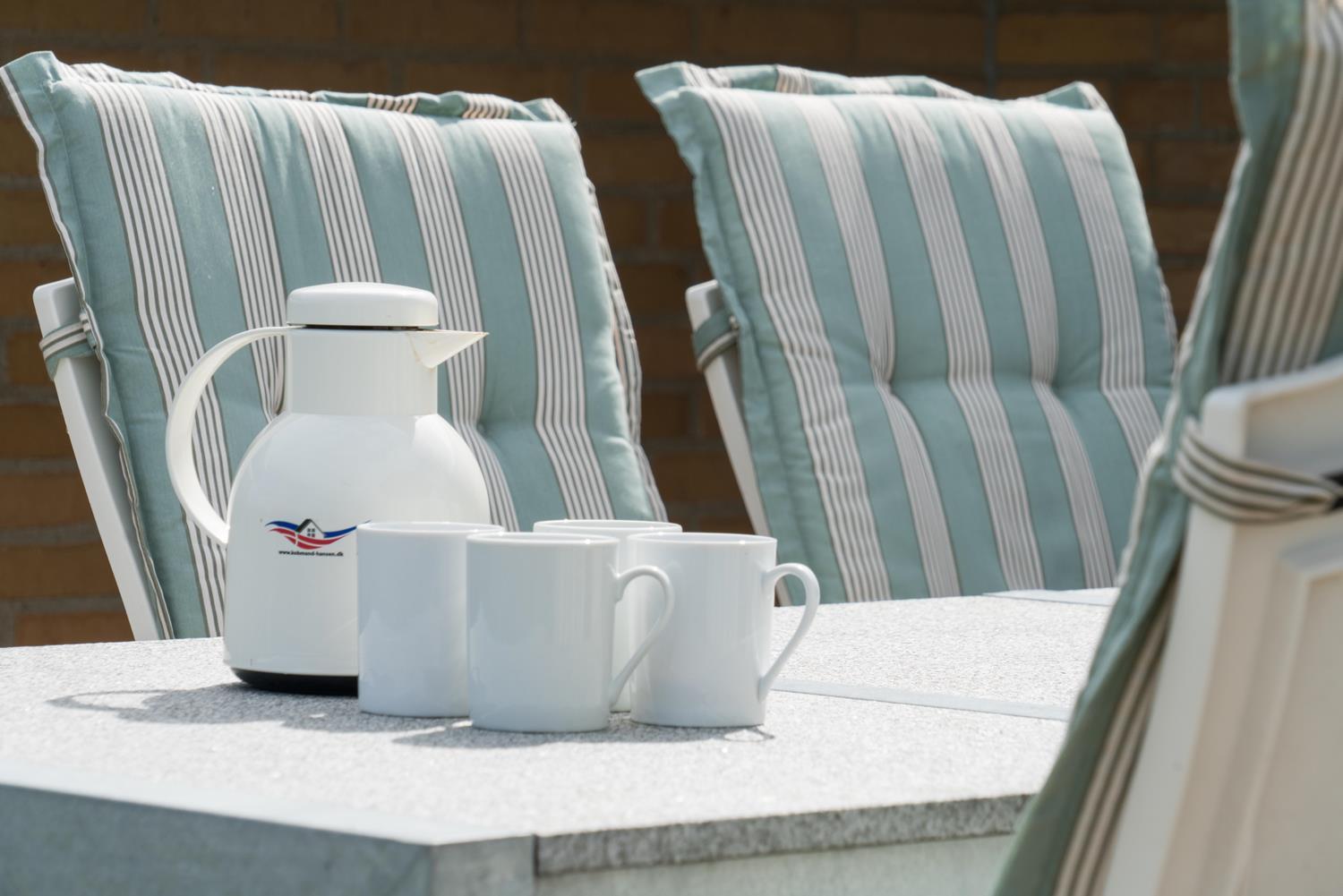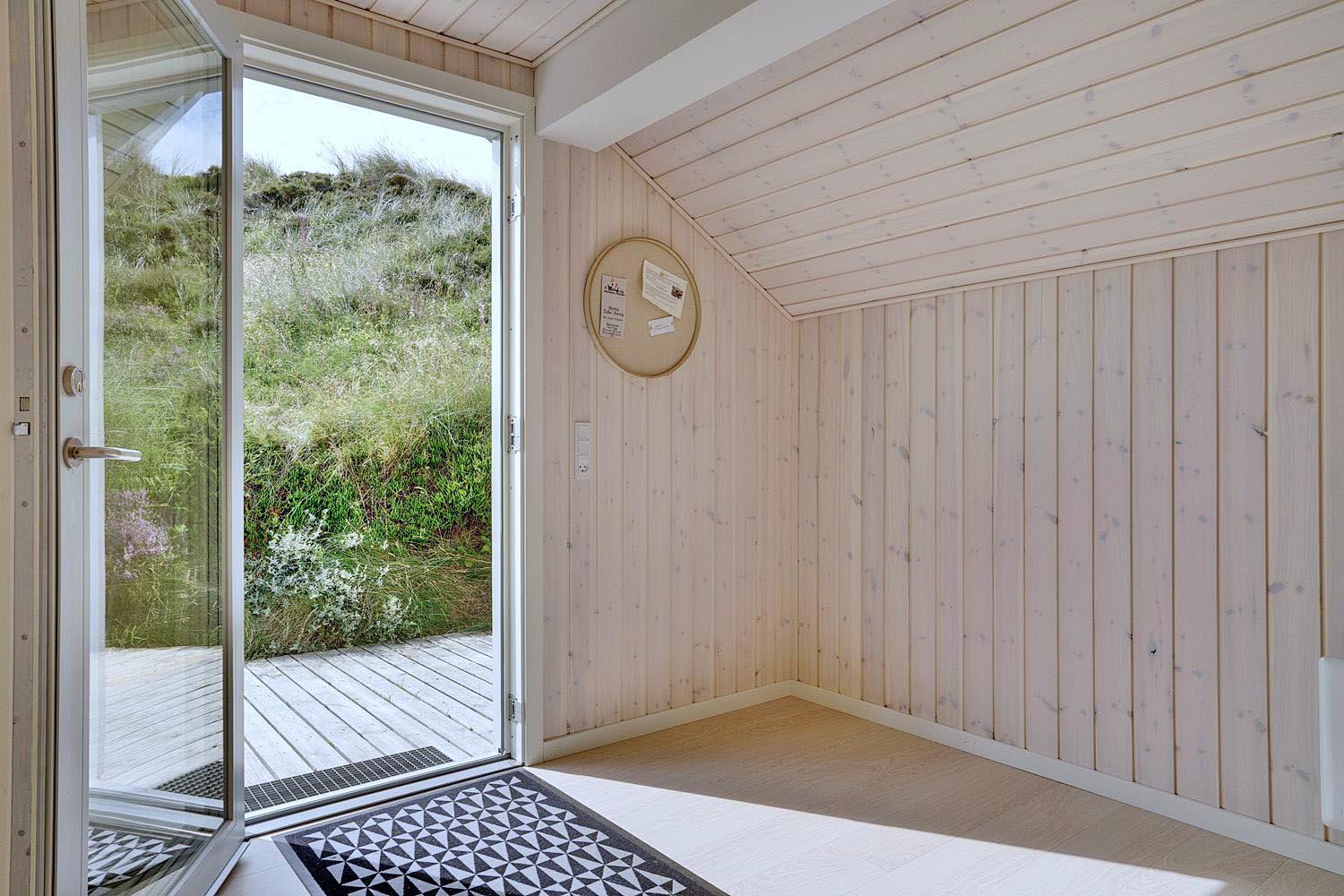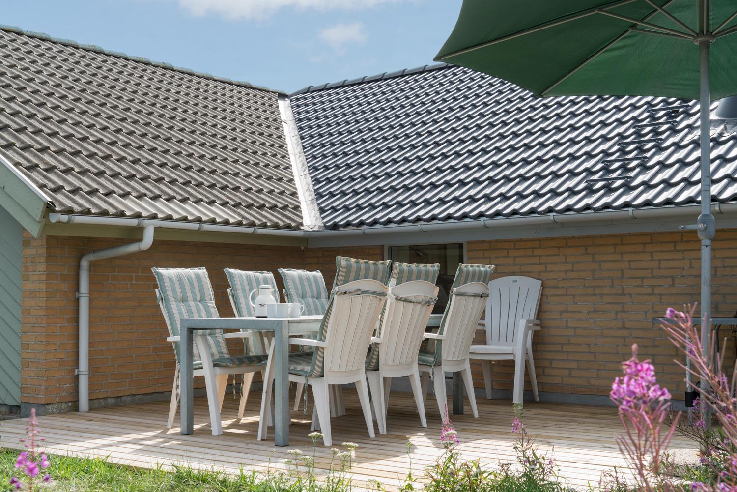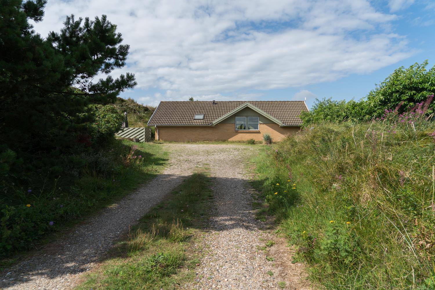 En del af terrassen er overdækket, så man kan flytte ind under tag når duggen falder. Bag huset er der en høj klit, som giver læ på terrassen. Der er også tænkt på de små gæster. Der er både sandkasse og gynge.