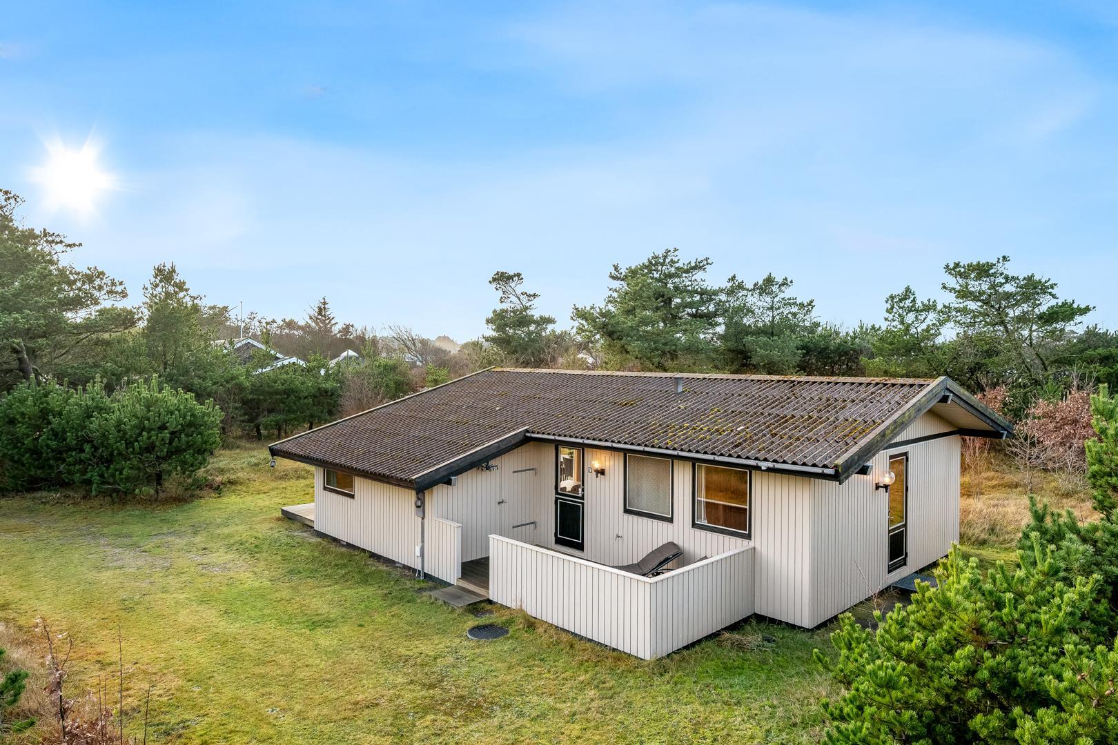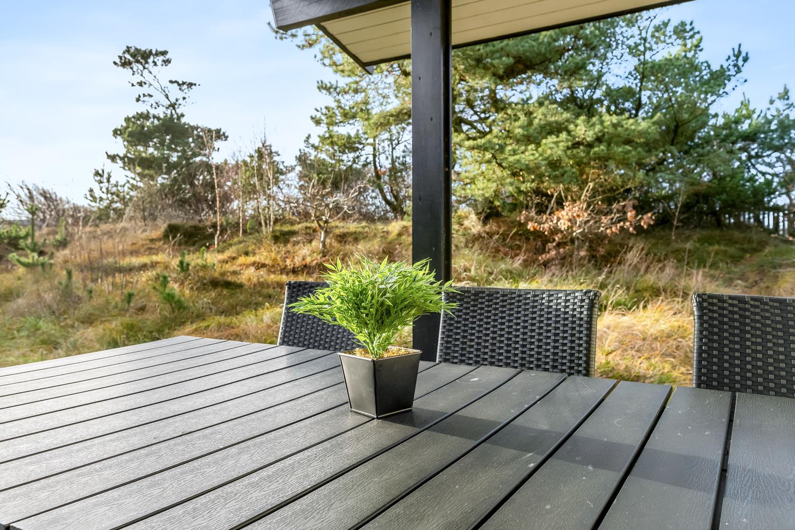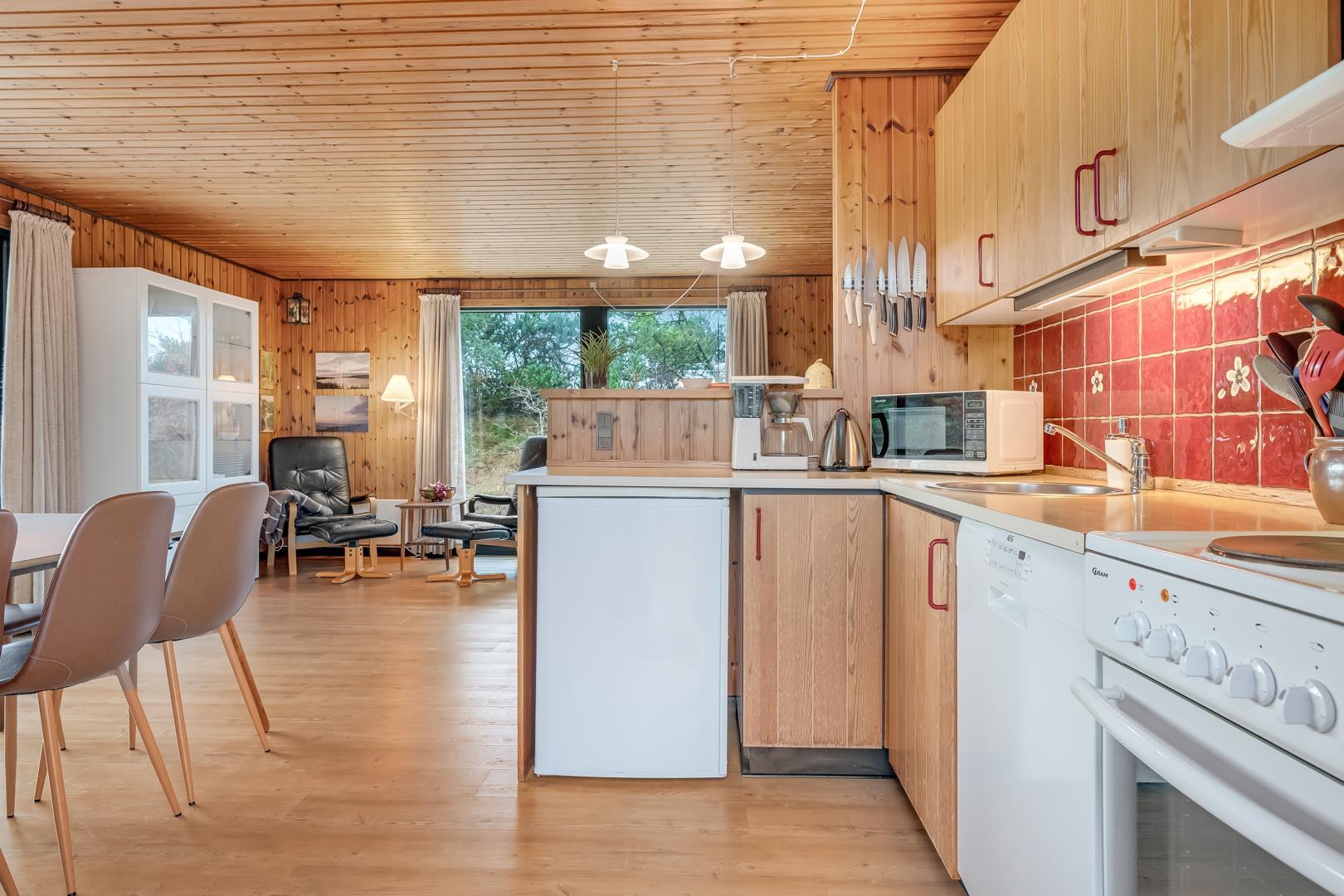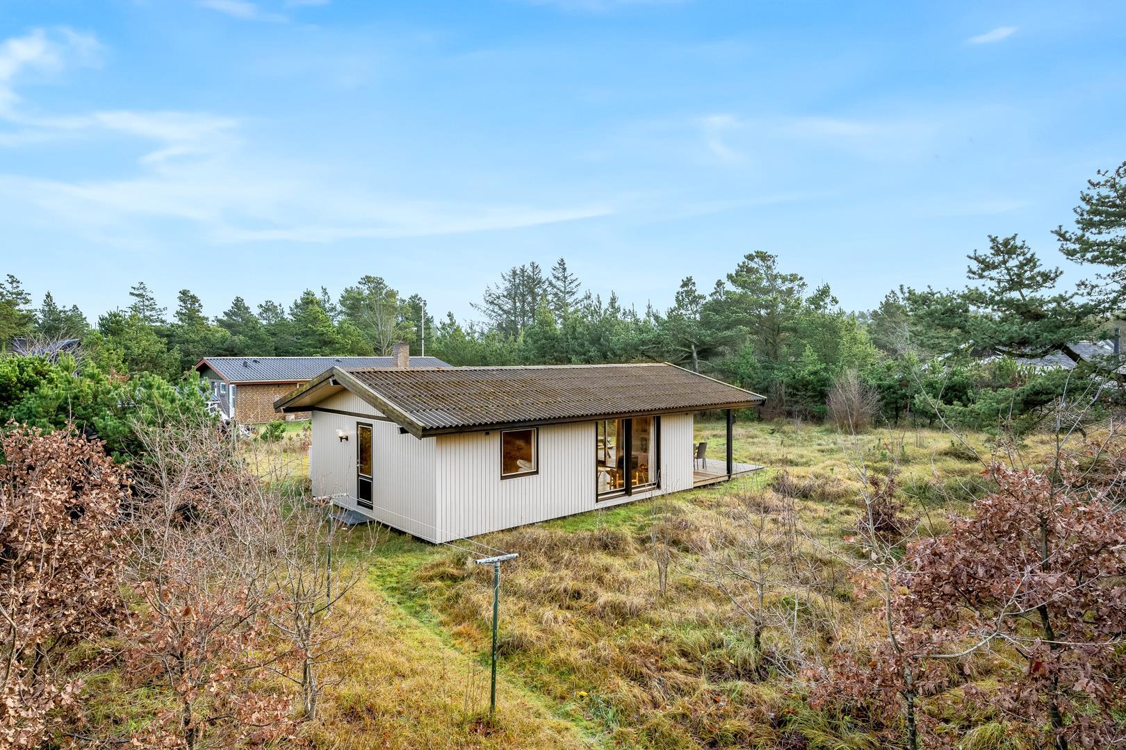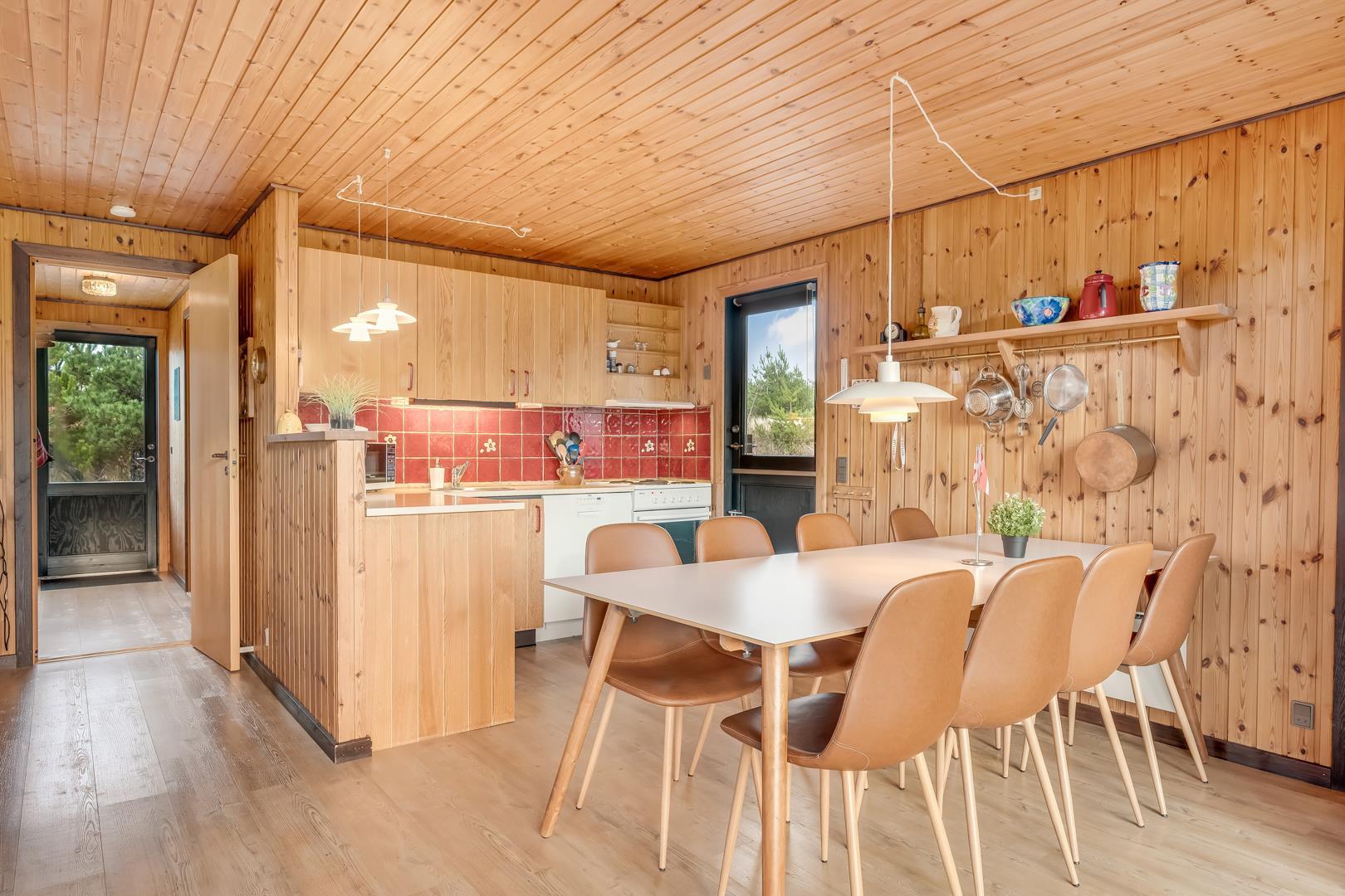 Hyggeligt og velholdt træhus på ugeneret, kuperet hedegrund. Omgivet af fyrretræer. Små hyggekroge med bord og bænk. Ideelt til børn med gemmesteder og plads til boldspil foran huset. Køkken og stue i et med udgang til overdækket syd- og vestvendt terrasse. Fra køkken udgang til østvendt terrasse, med mulighed for solskin hele formiddagen.