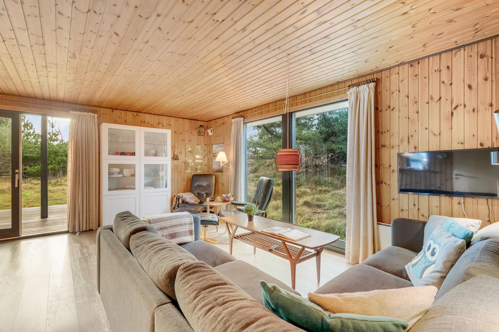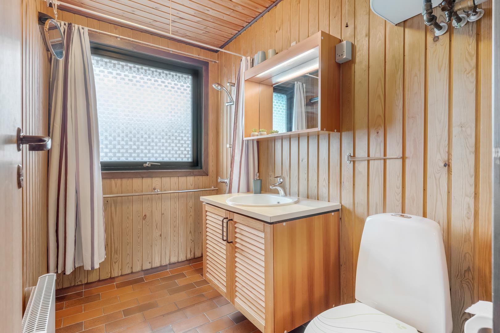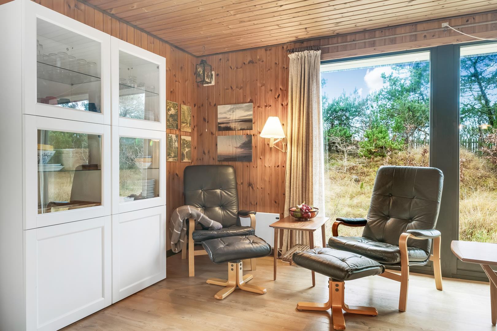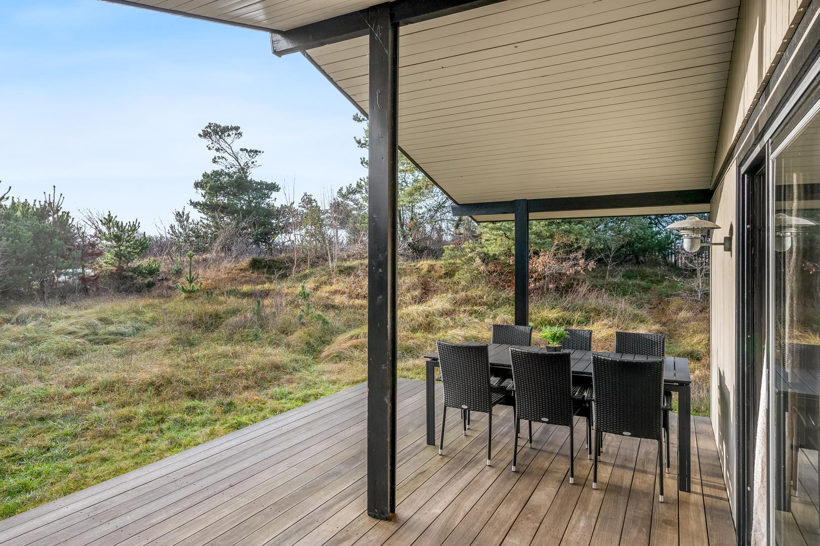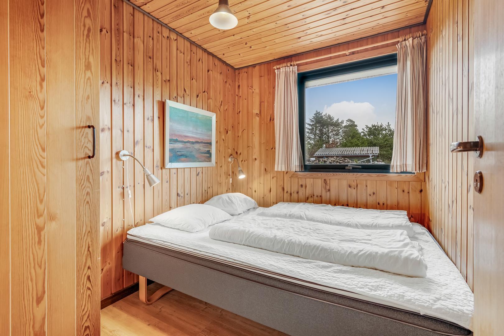 Hyggeligt og velholdt træhus på ugeneret, kuperet hedegrund. Omgivet af fyrretræer. Små hyggekroge med bord og bænk. Ideelt til børn med gemmesteder og plads til boldspil foran huset. Køkken og stue i et med udgang til overdækket syd- og vestvendt terrasse. Fra køkken udgang til østvendt terrasse, med mulighed for solskin hele formiddagen.