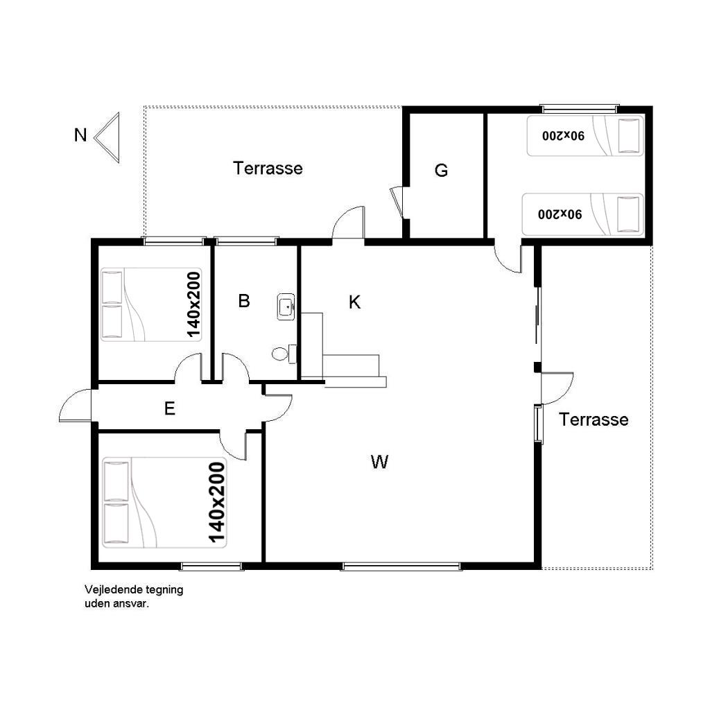 Sengestørrelser: 2 dobbeltsenge 140 x 200 cm + 2 enkeltsenge 90 x 200 cm