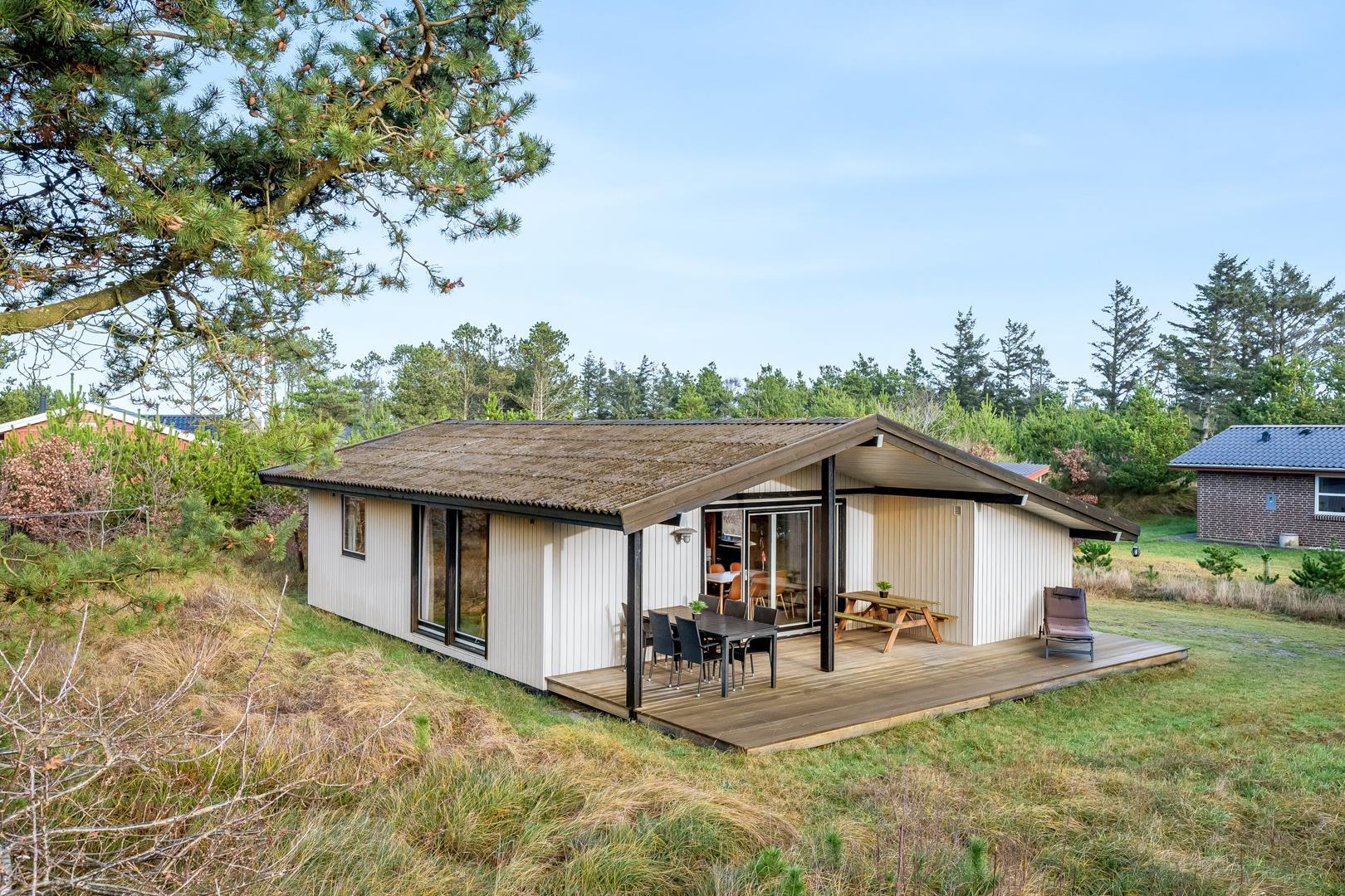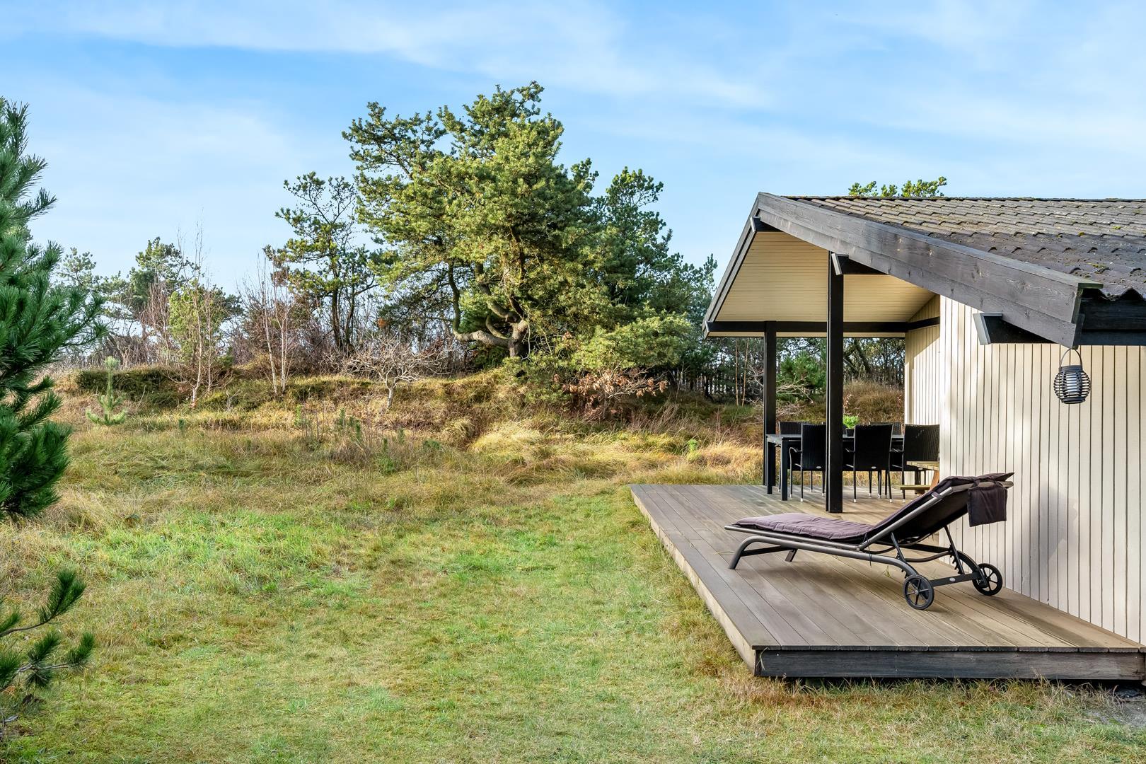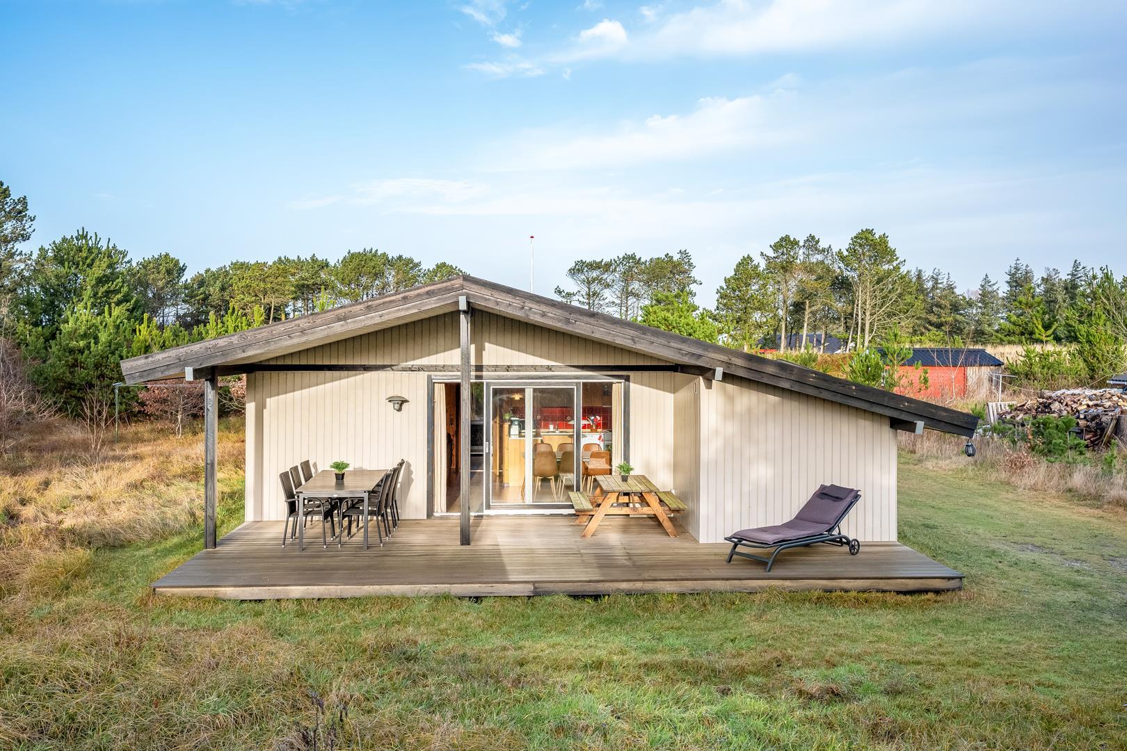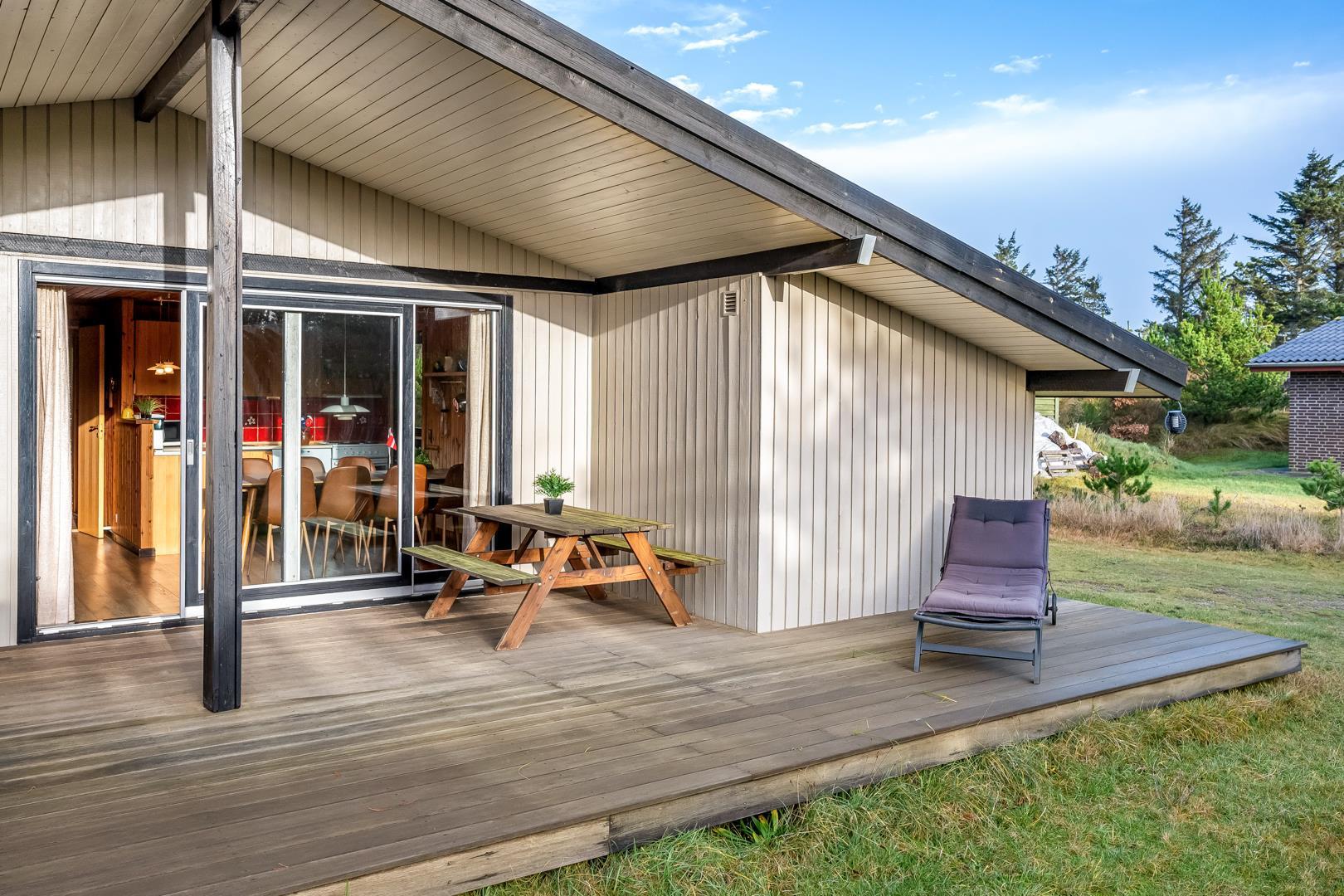 Hyggeligt træhus tæt på Henne Strand med flere terrasser og plads til børn i naturskønne omgivelser.