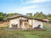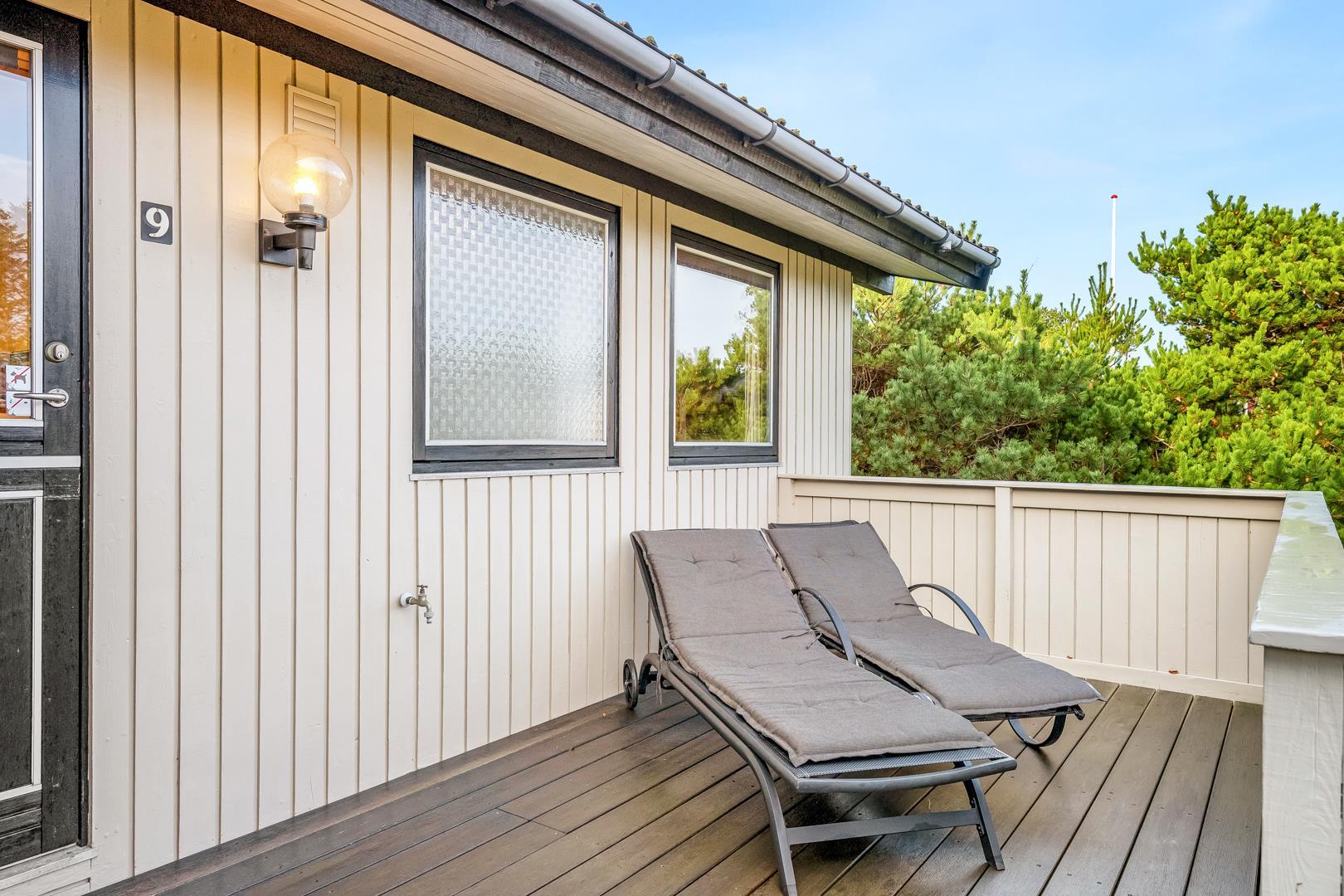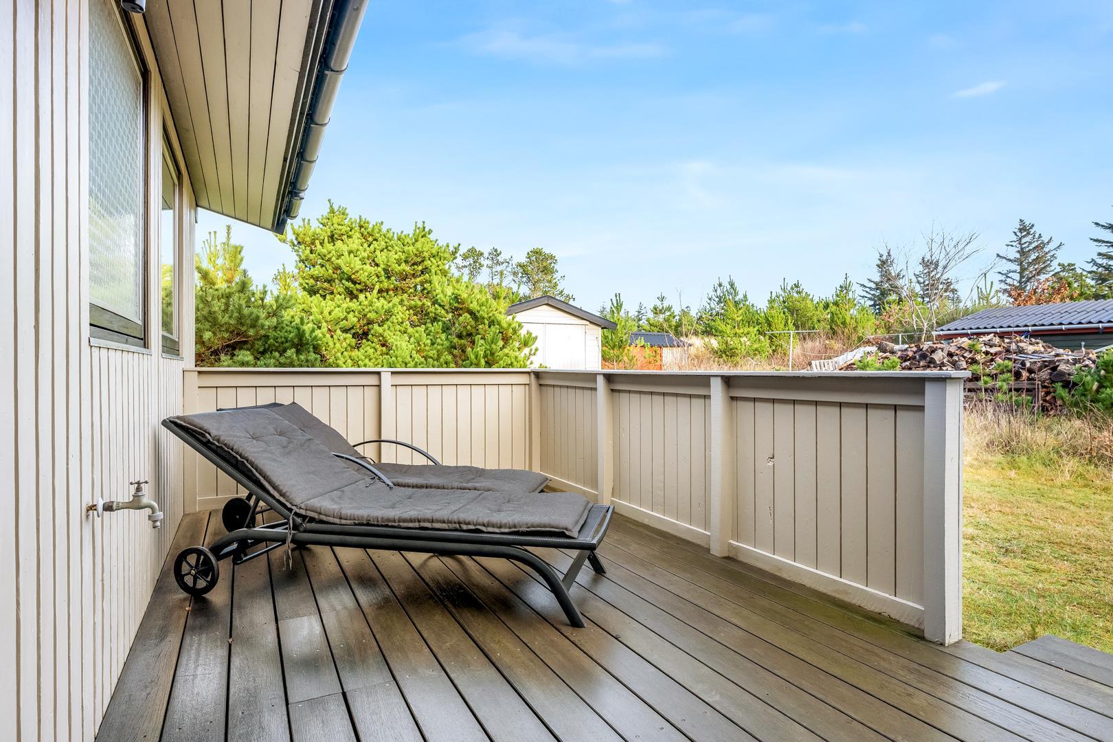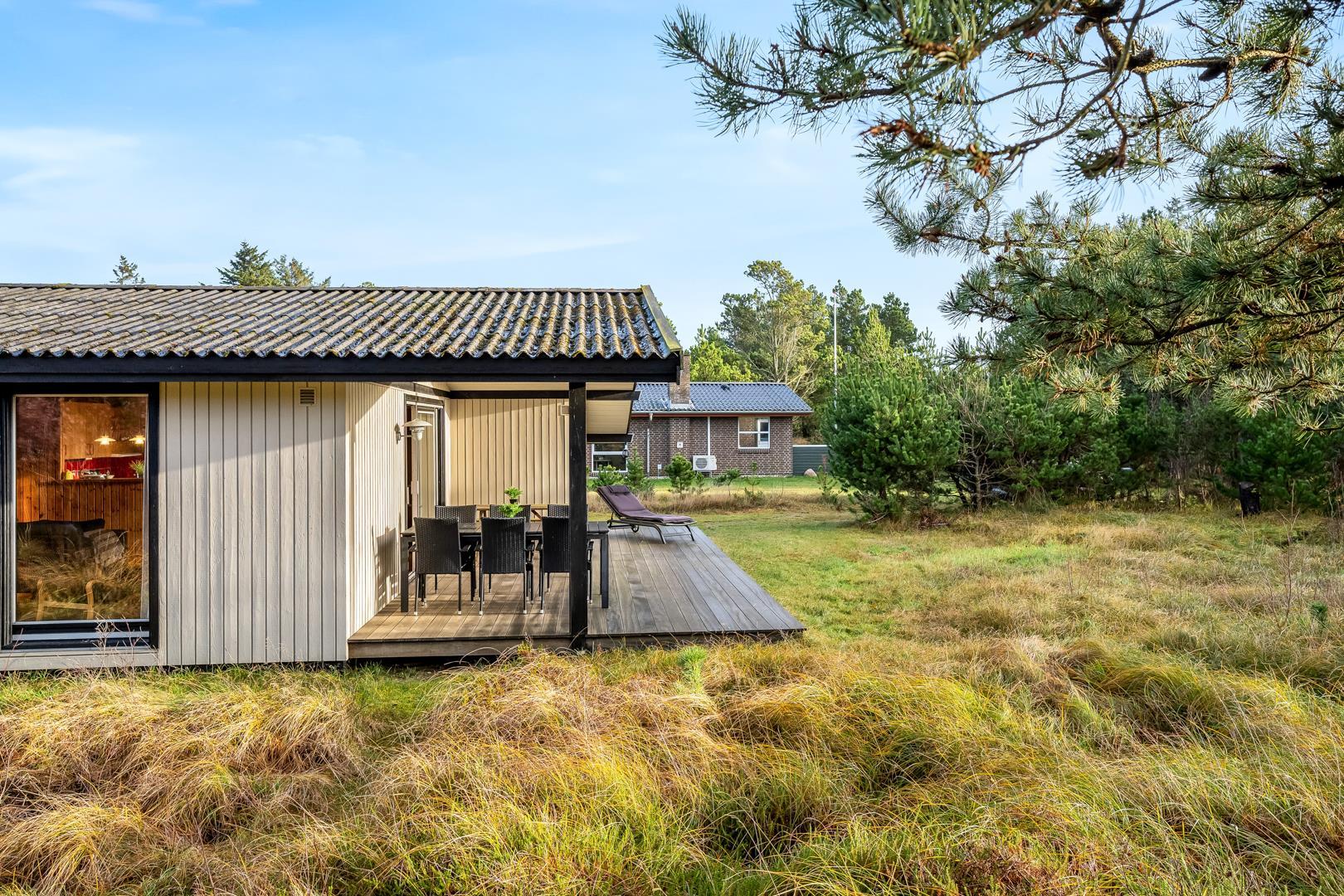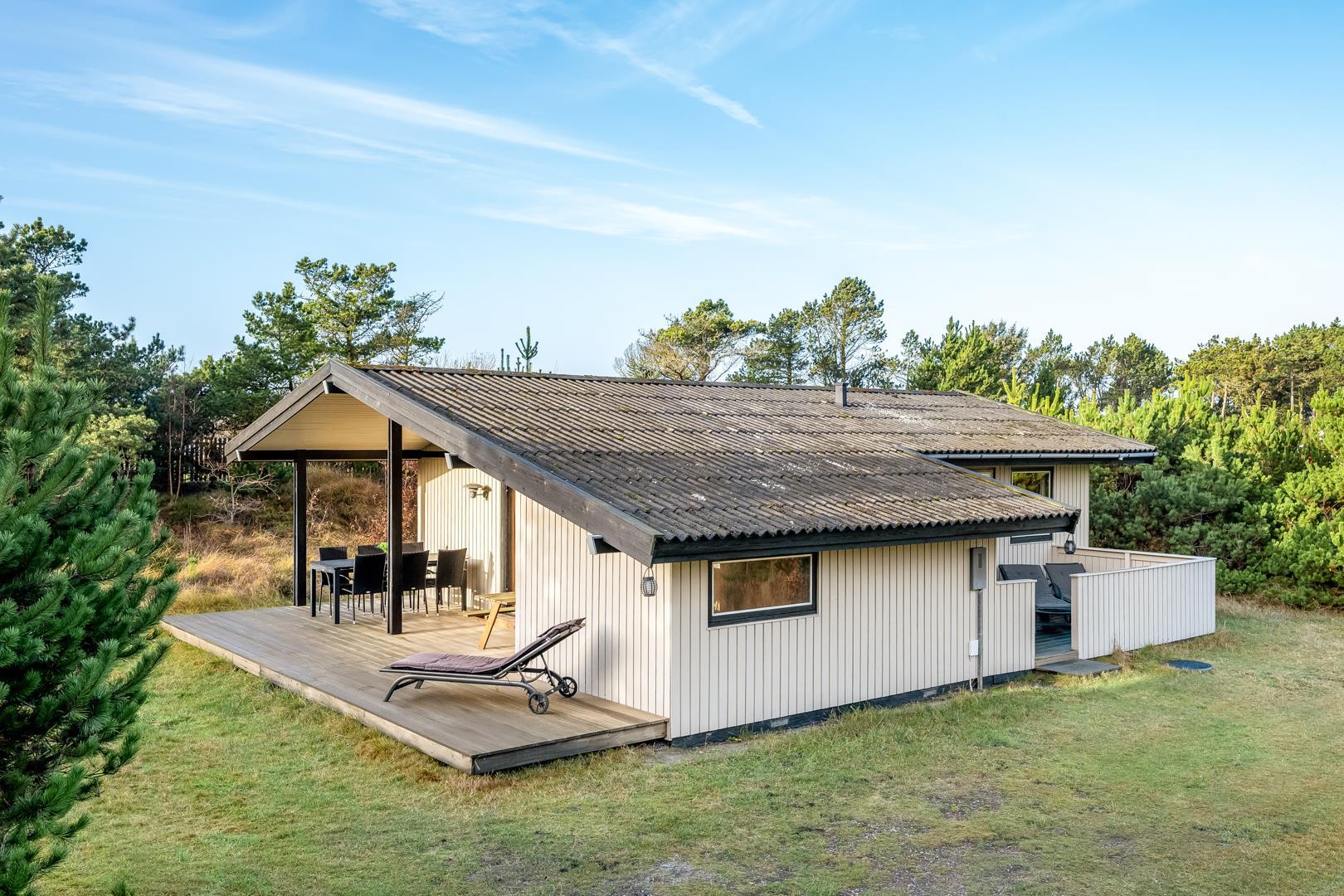 Hyggeligt træhus tæt på Henne Strand med flere terrasser og plads til børn i naturskønne omgivelser.