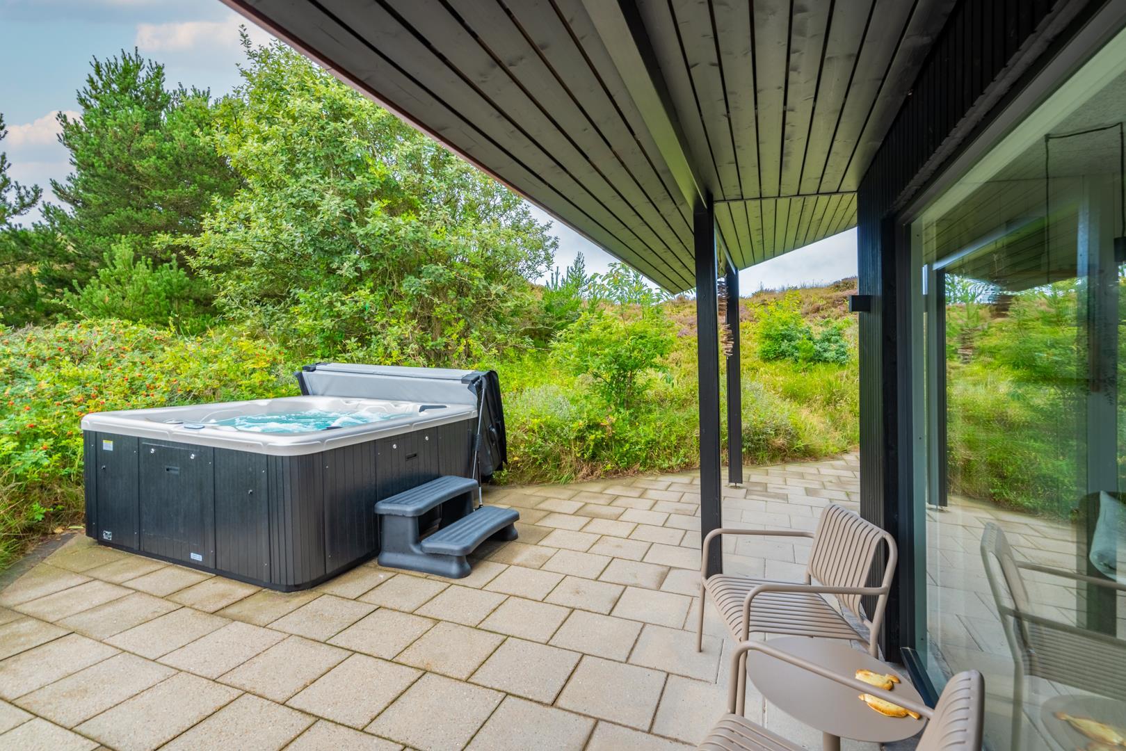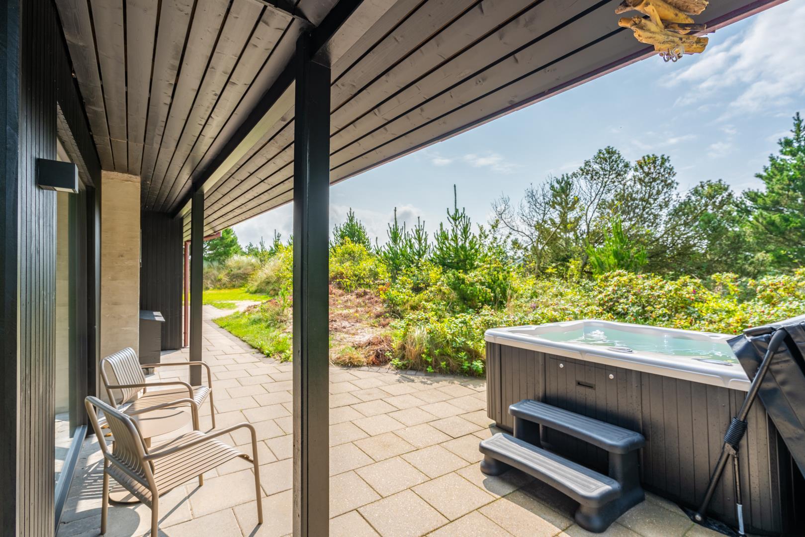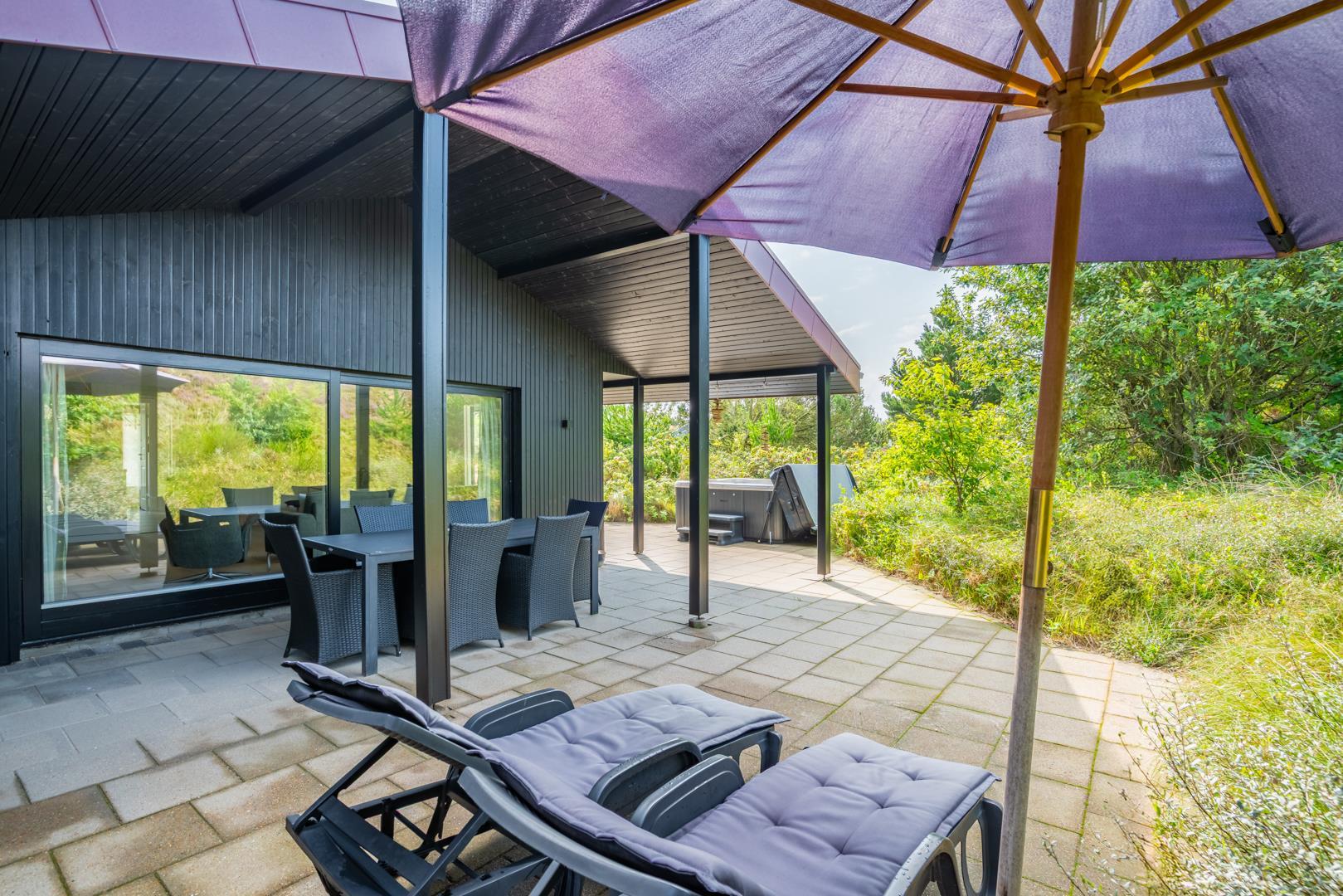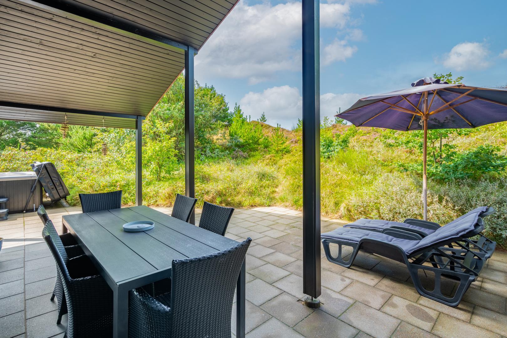 Fra stuen er der direkte adgang til en overdækket og sydvestvendt terrasse, hvor I kan nyde solnedgangen i fuld ro og privatliv.