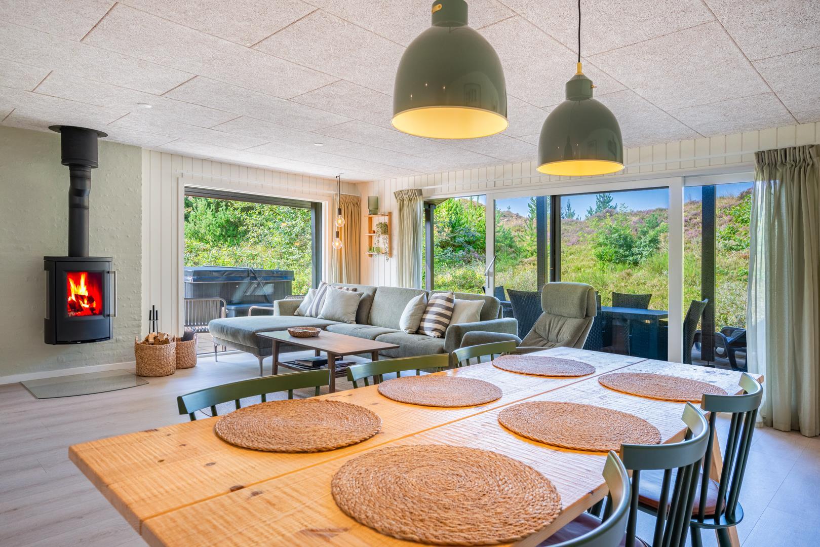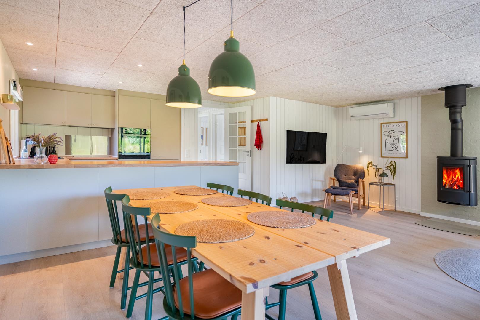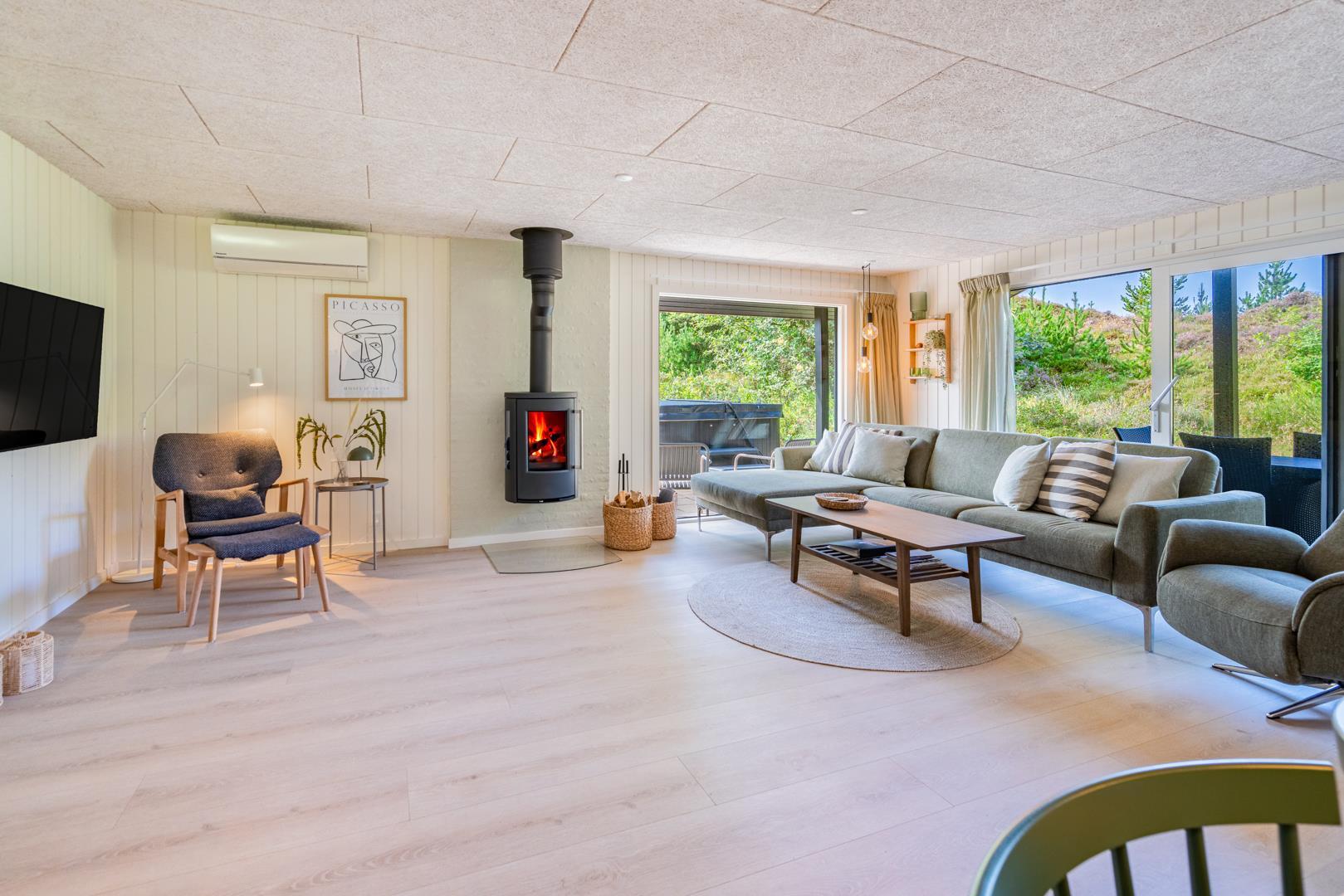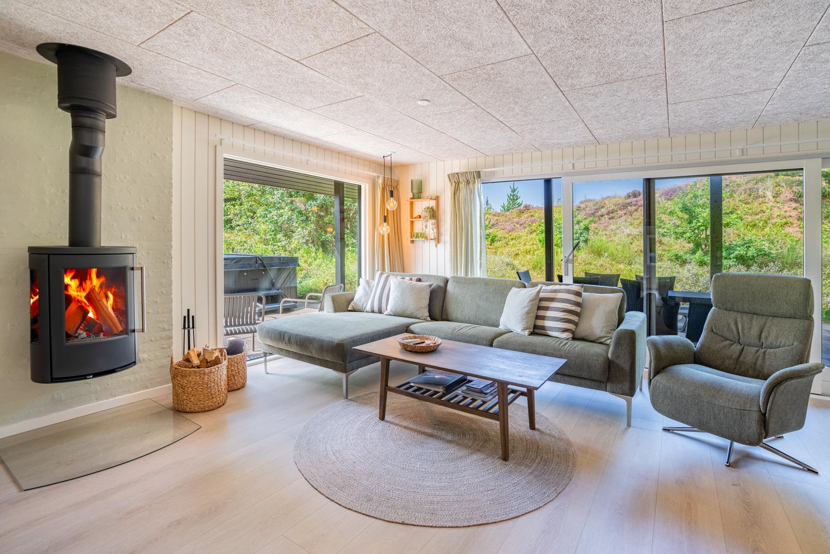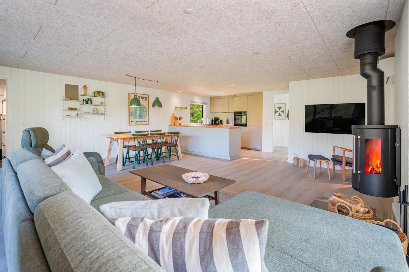 Her er der tænkt på alle detaljer! I 2025 har feriehuset gennemgået en gennemgribende modernisering med ny udvendig beklædning, nyt lækkert køkken og et lyst og indbydende køkken-alrum. De store vinduespartier i stuen trækker naturen helt ind i rummet, og midt i det hele står en hyggelig brændeovn, som spreder varme ud i rummet.