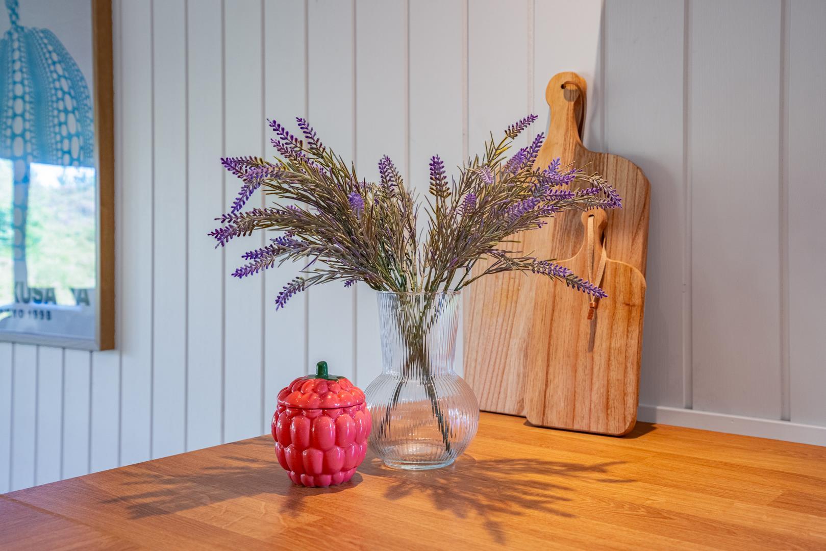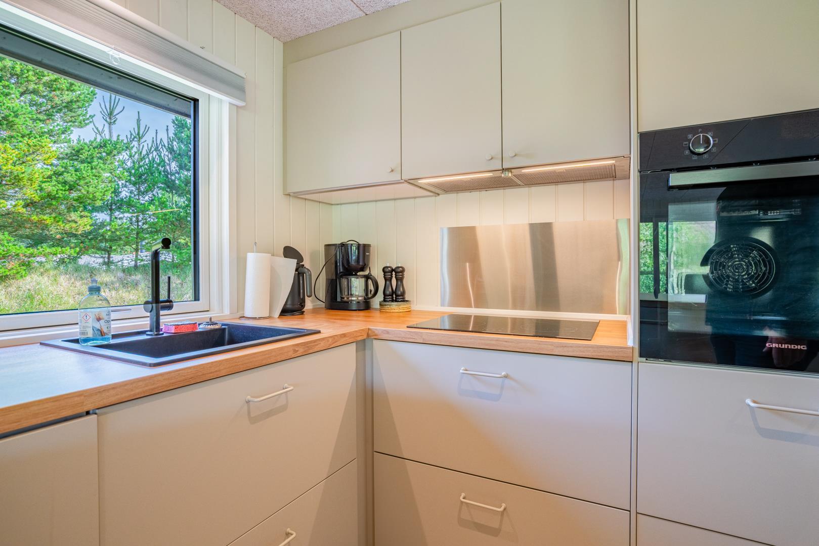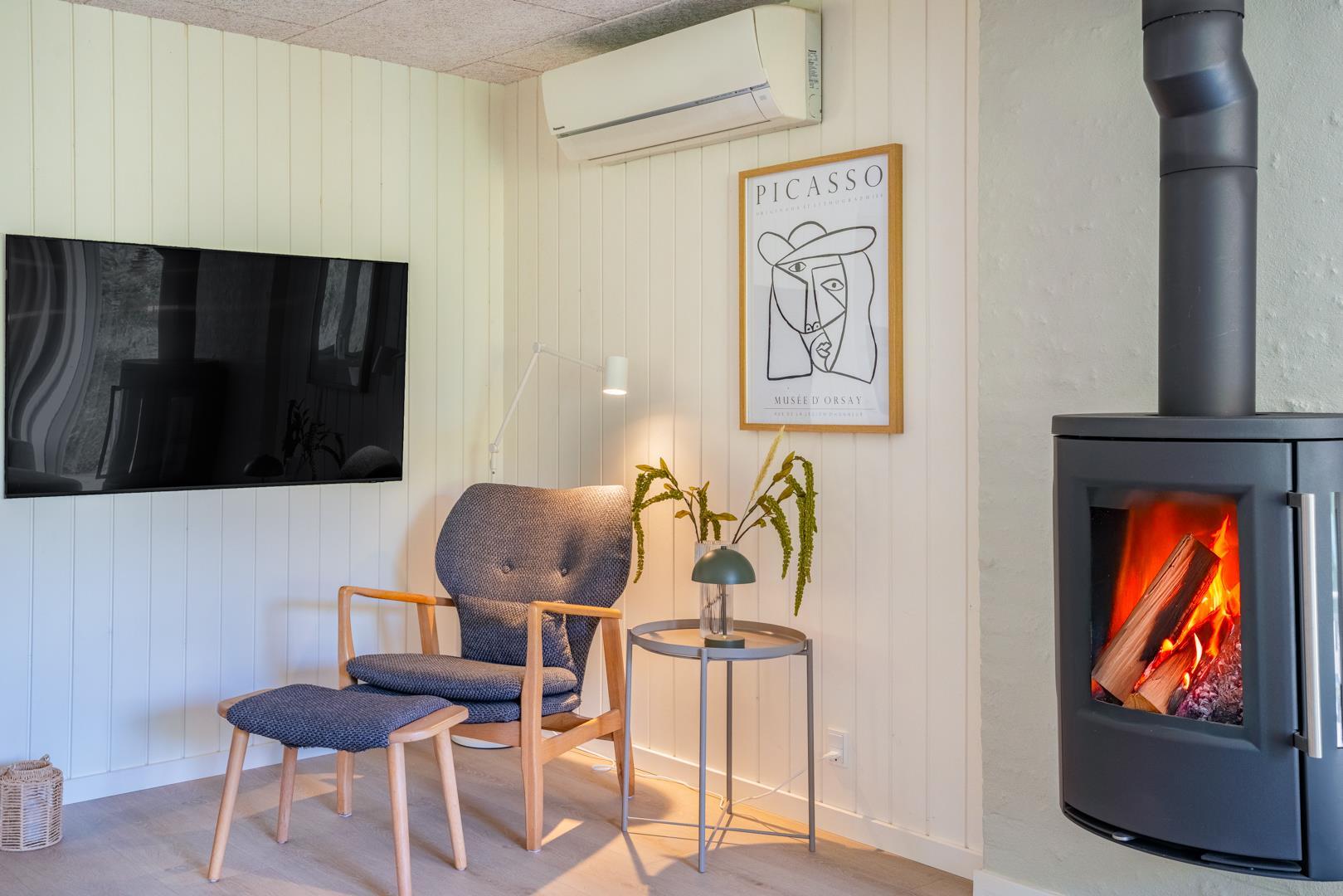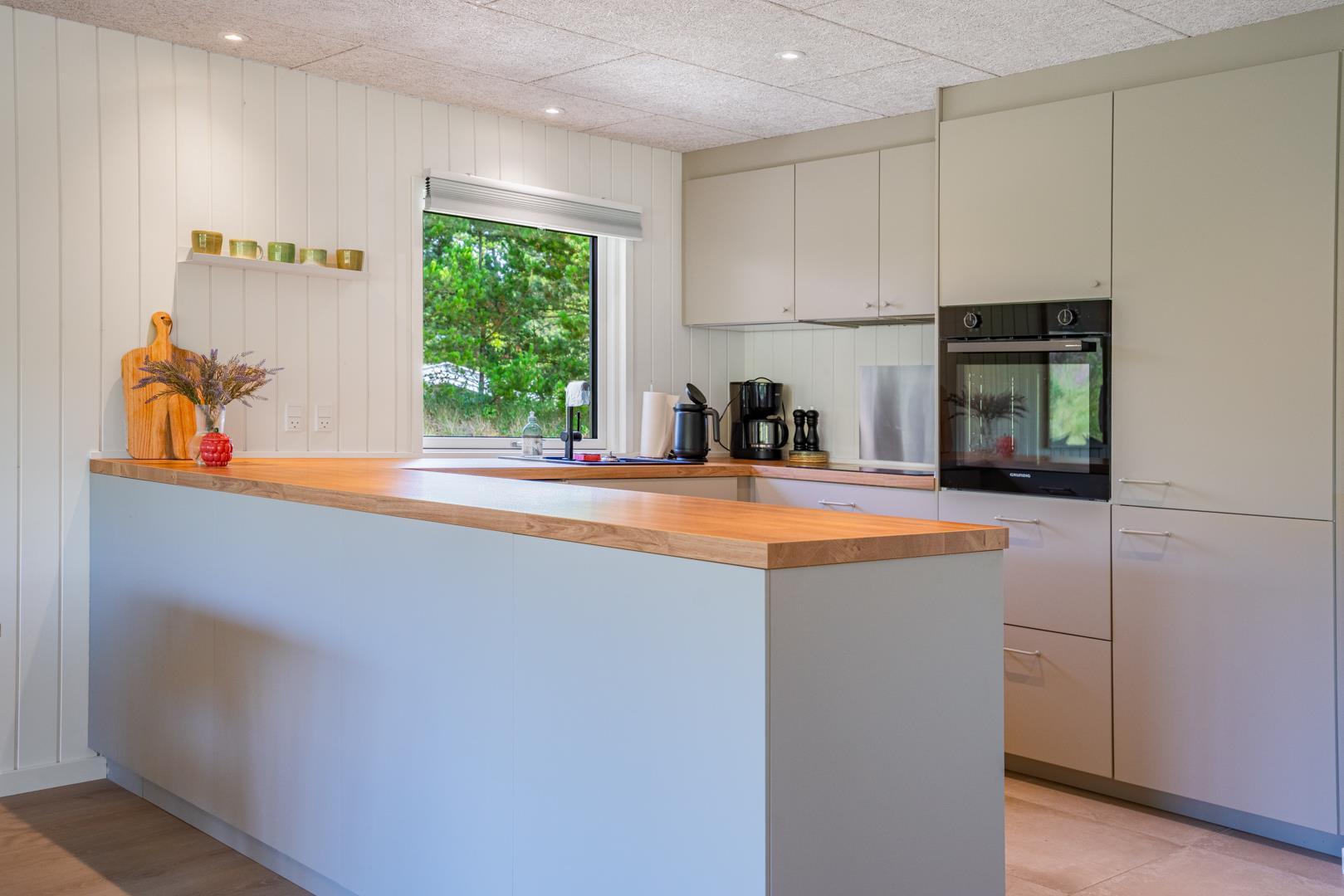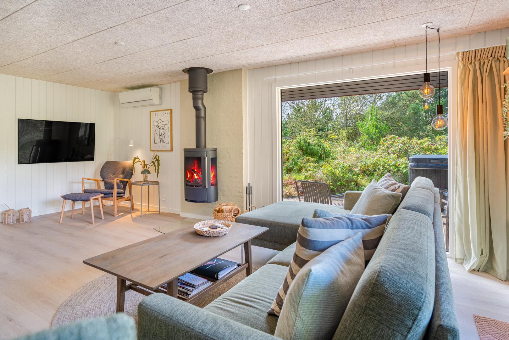 Her er der tænkt på alle detaljer! I 2025 har feriehuset gennemgået en gennemgribende modernisering med ny udvendig beklædning, nyt lækkert køkken og et lyst og indbydende køkken-alrum. De store vinduespartier i stuen trækker naturen helt ind i rummet, og midt i det hele står en hyggelig brændeovn, som spreder varme ud i rummet.