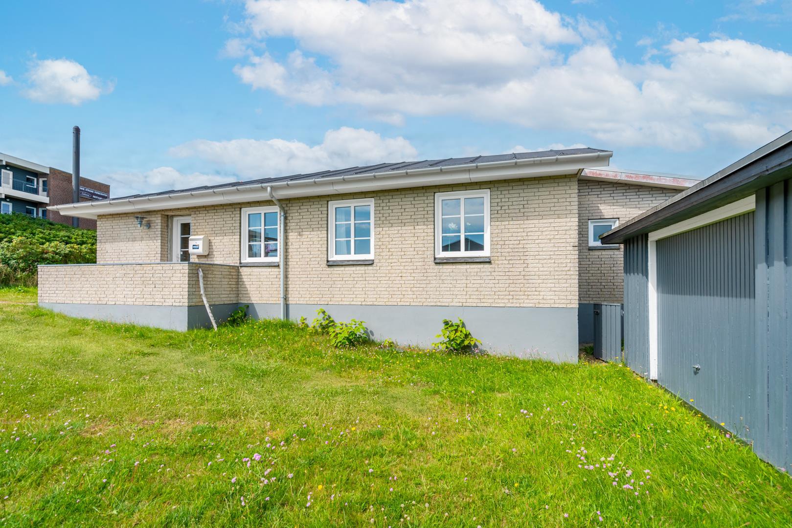 Hyggeligt og velholdt feriehus beliggende tæt på feriebyen Henne Strand og Vesterhavet. Der er ca. 5 minutters gang til stranden og indkøb. Trods feriehusets meget centrale beliggenhed er haven og terrasserne ugenerte. Feriehuset fremstår lyst og venligt og er indrettet med et veludstyret køkken og hyggelig stue med energibesparende varmepumpe. Flot nyere badeværelse. Der er opsat garage på grunden.