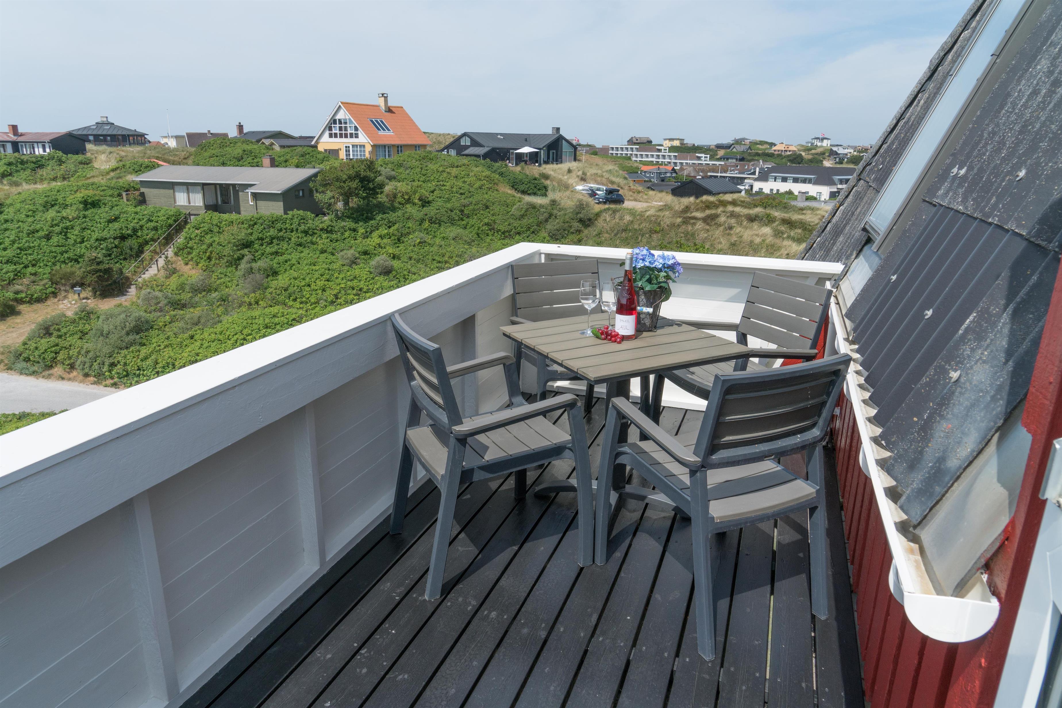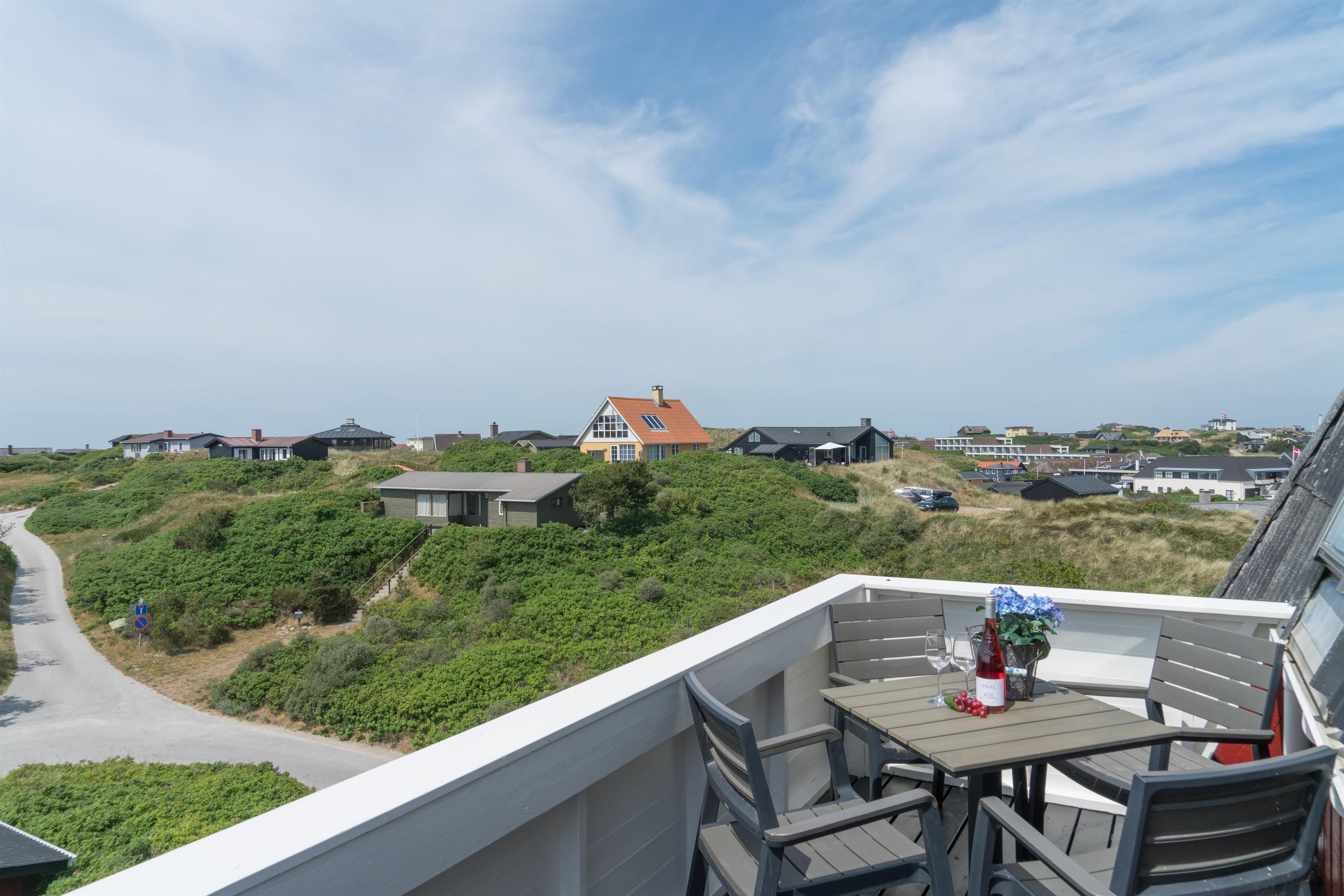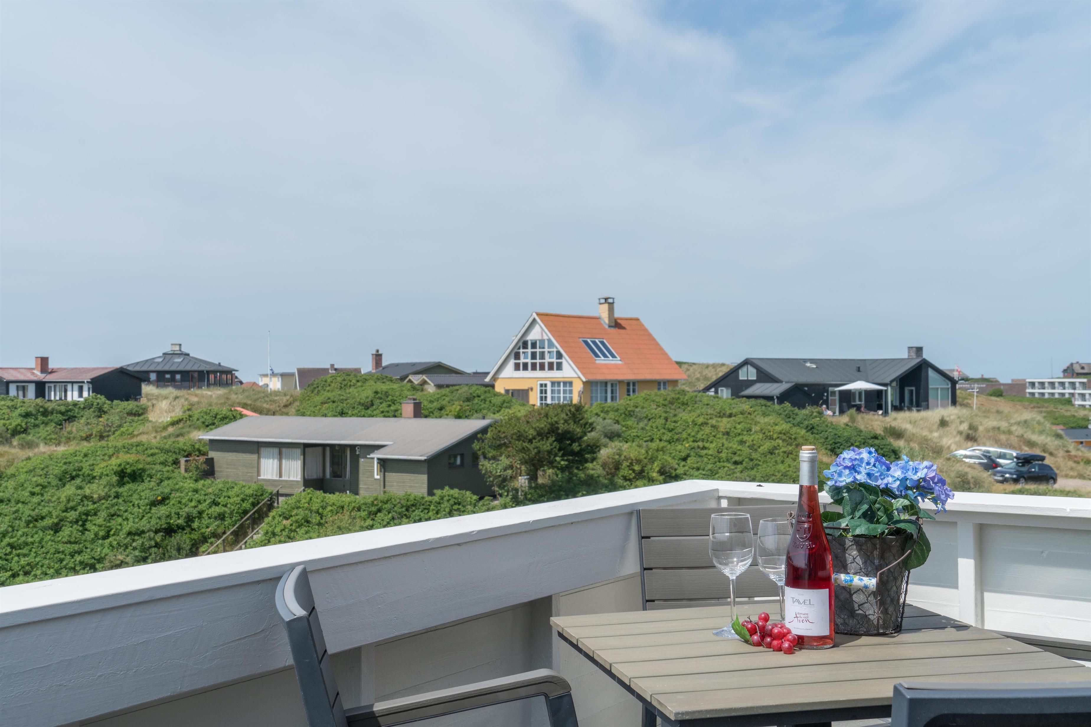 Lys ferielejlighed på 1. sal med unik vestvendt altan og panoramaudsigt til hav, klitter og by i Henne Strand.
