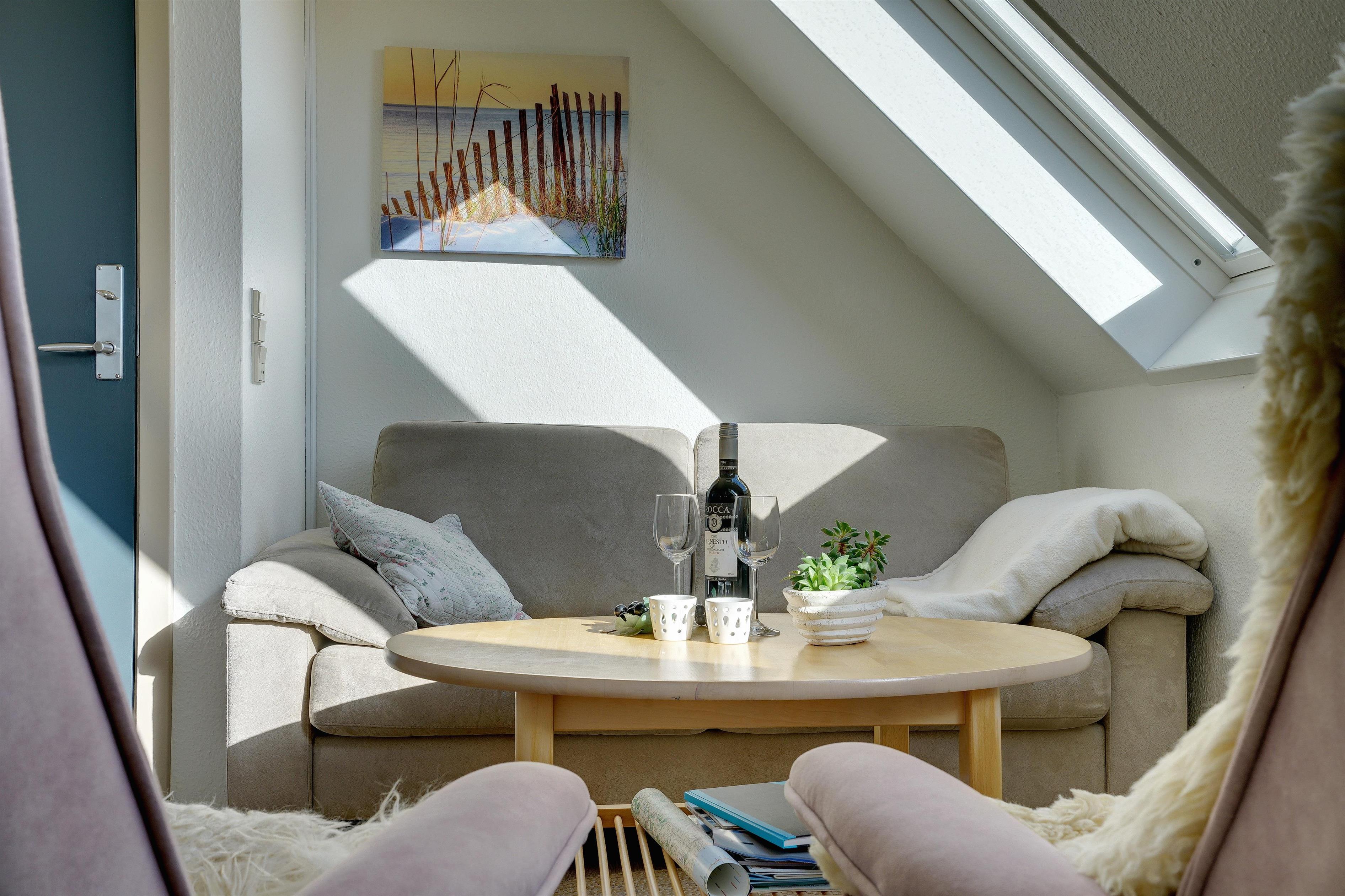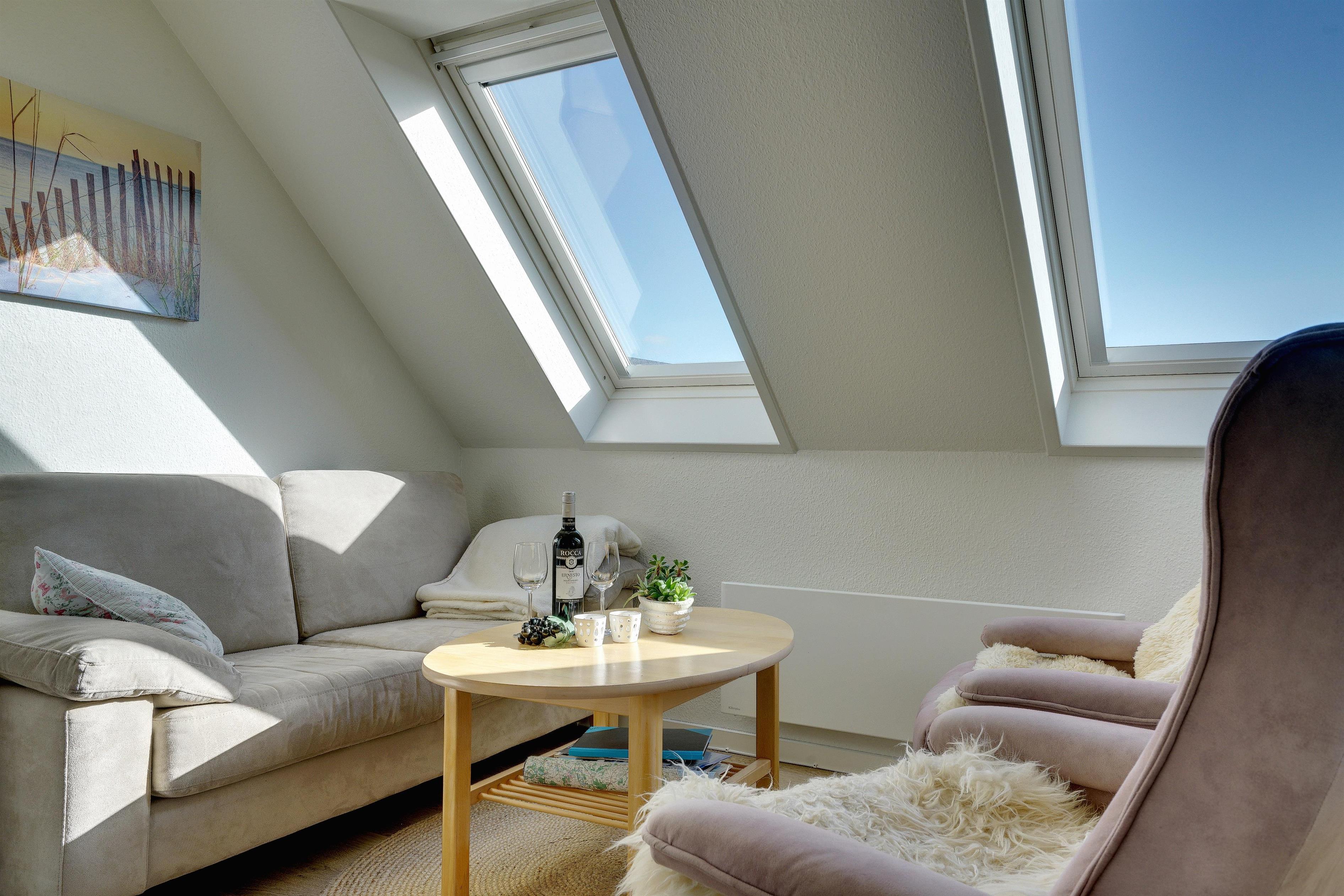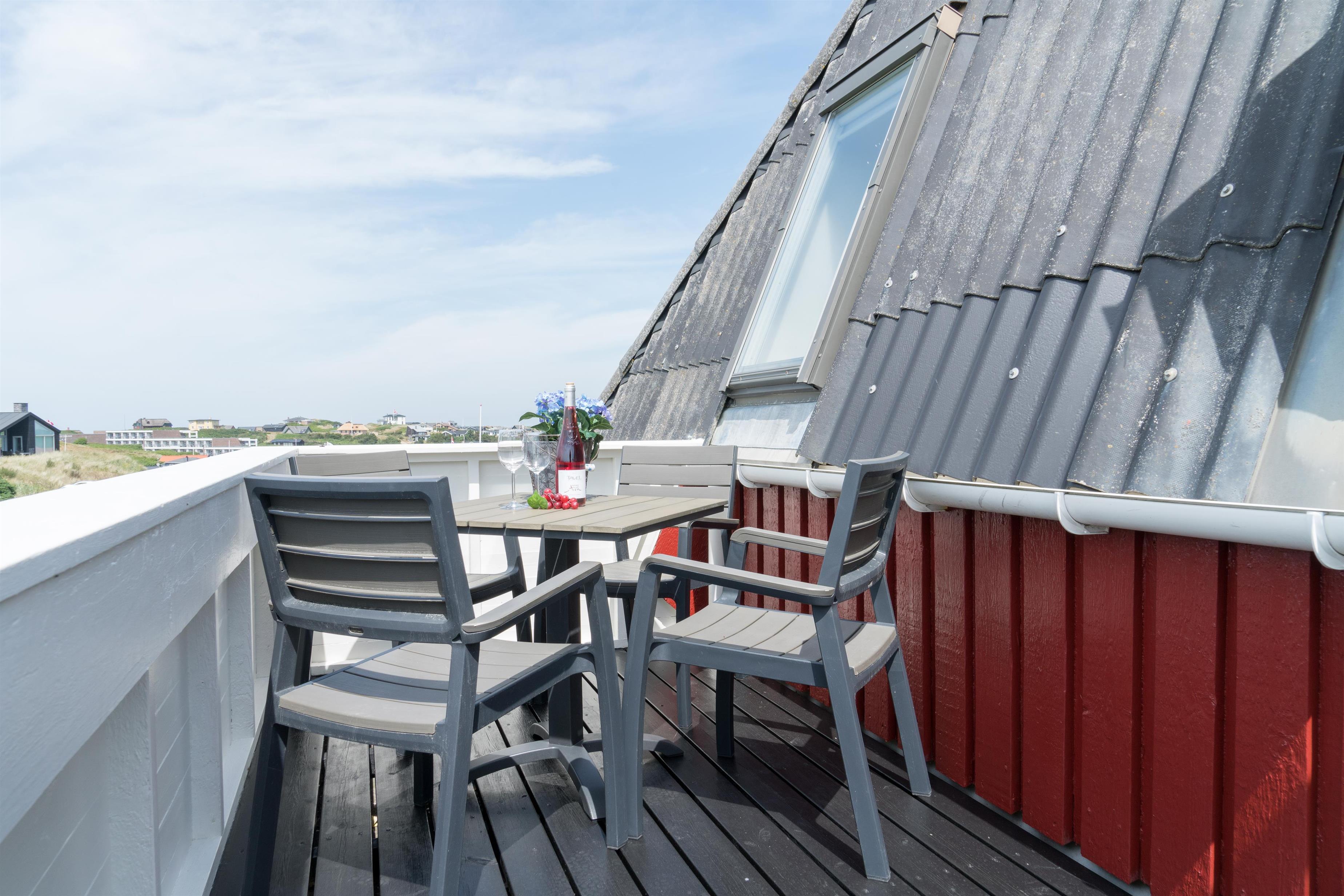 Lys ferielejlighed på 1. sal med unik vestvendt altan og panoramaudsigt til hav, klitter og by i Henne Strand.