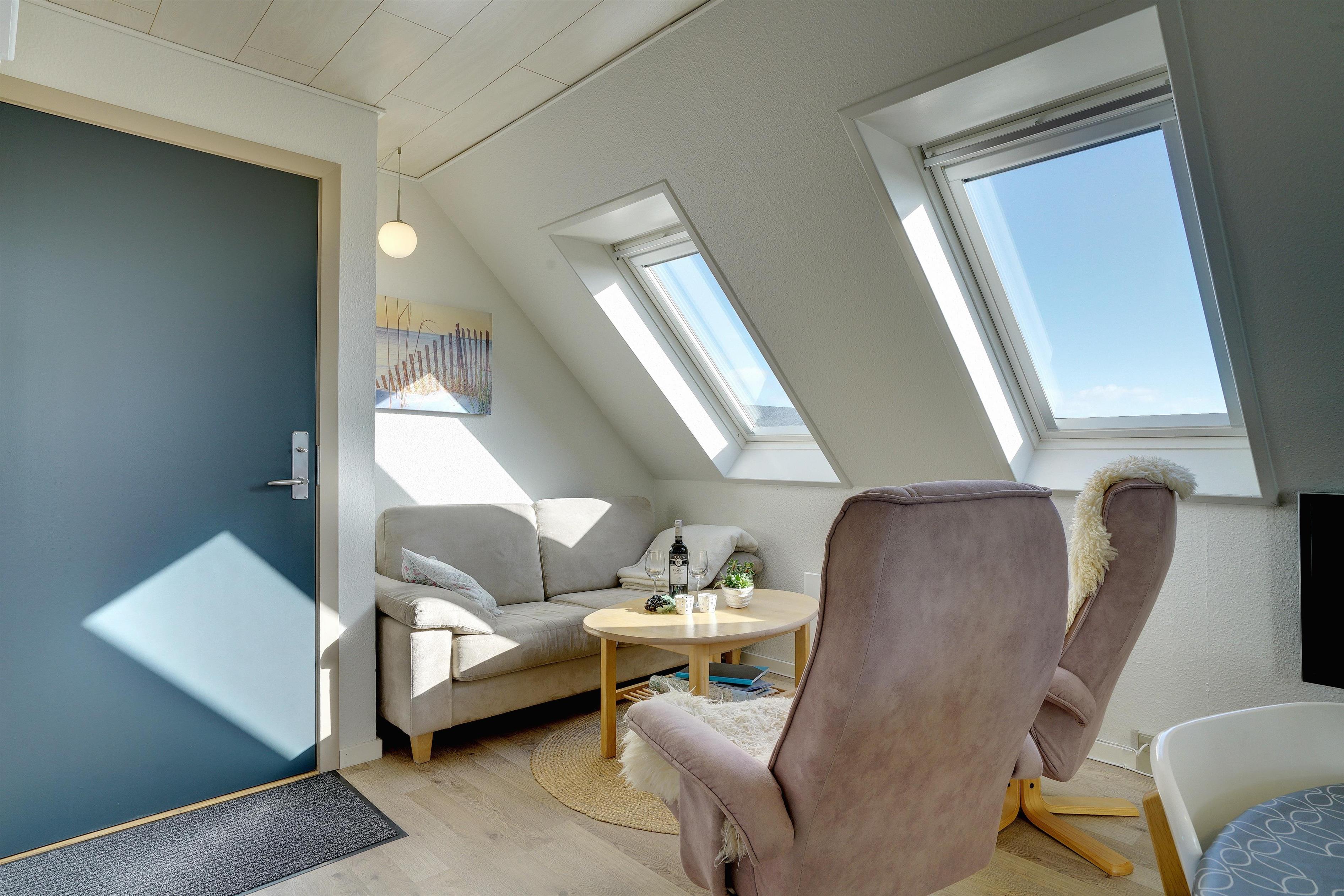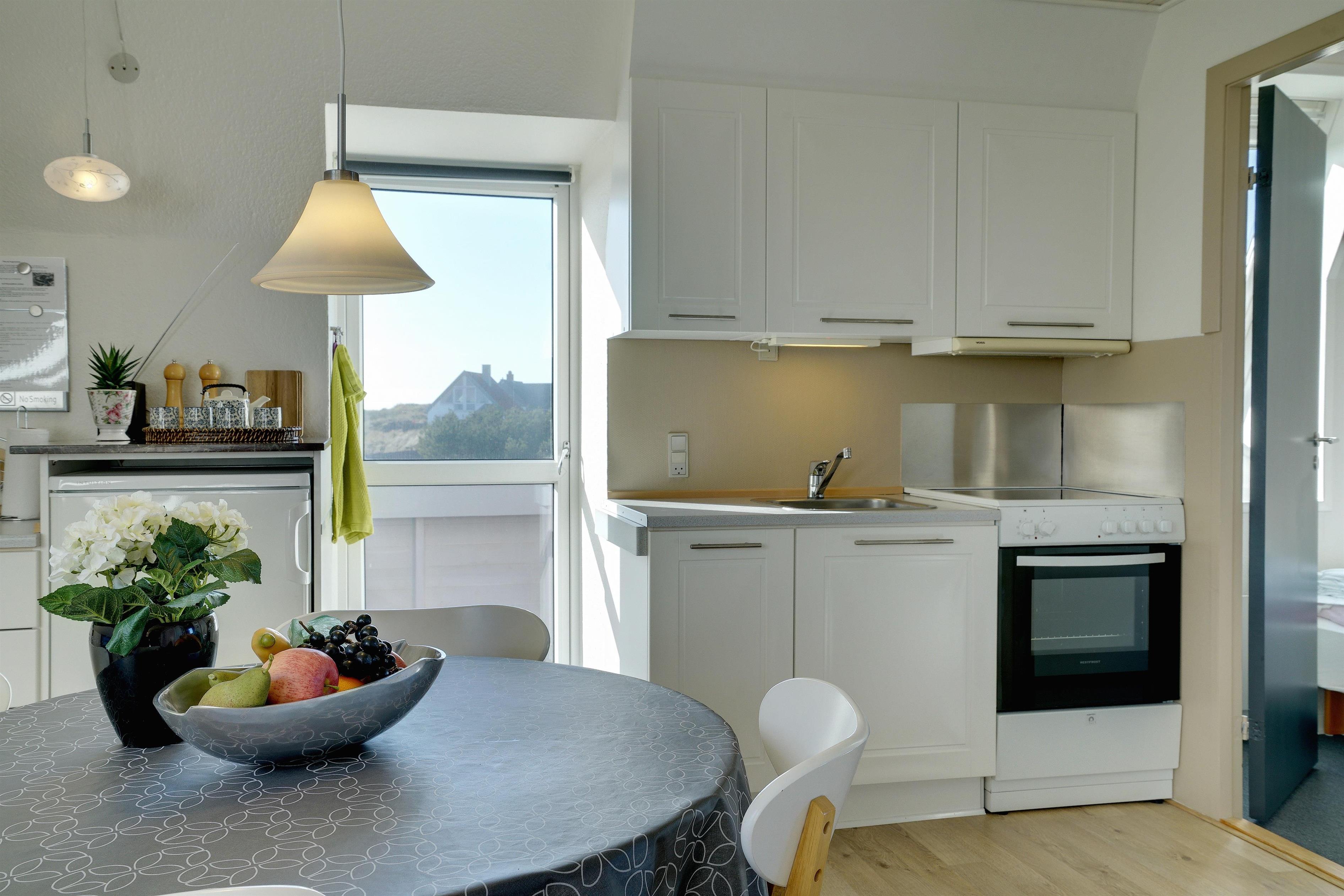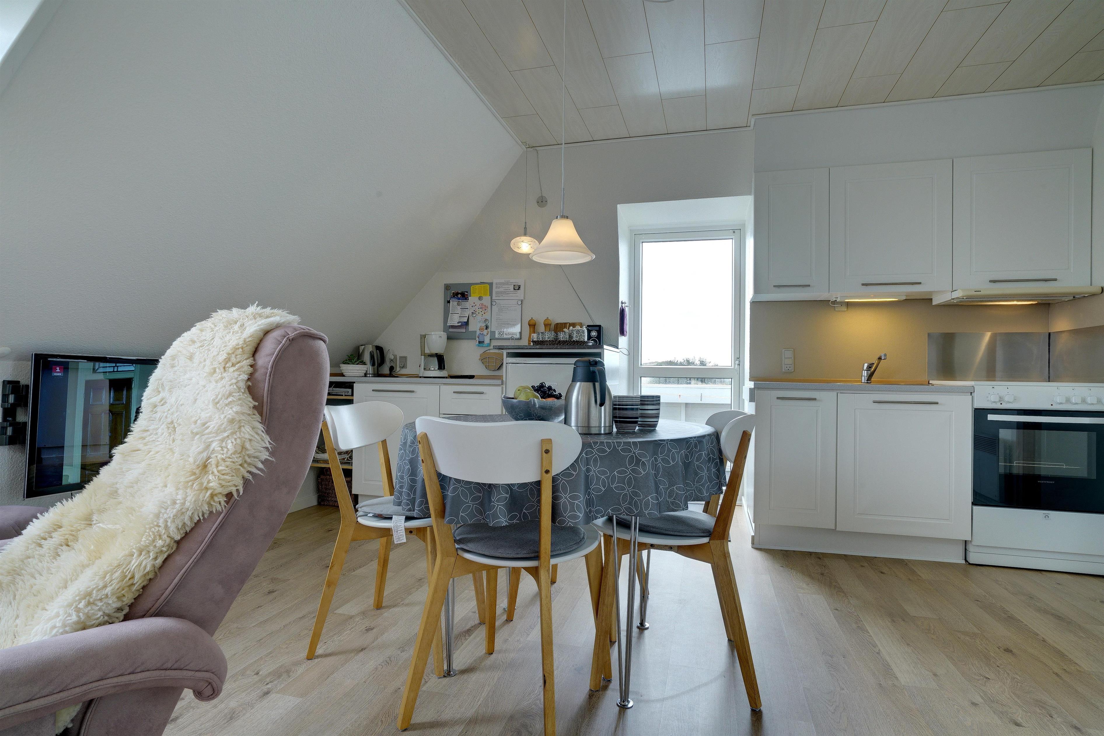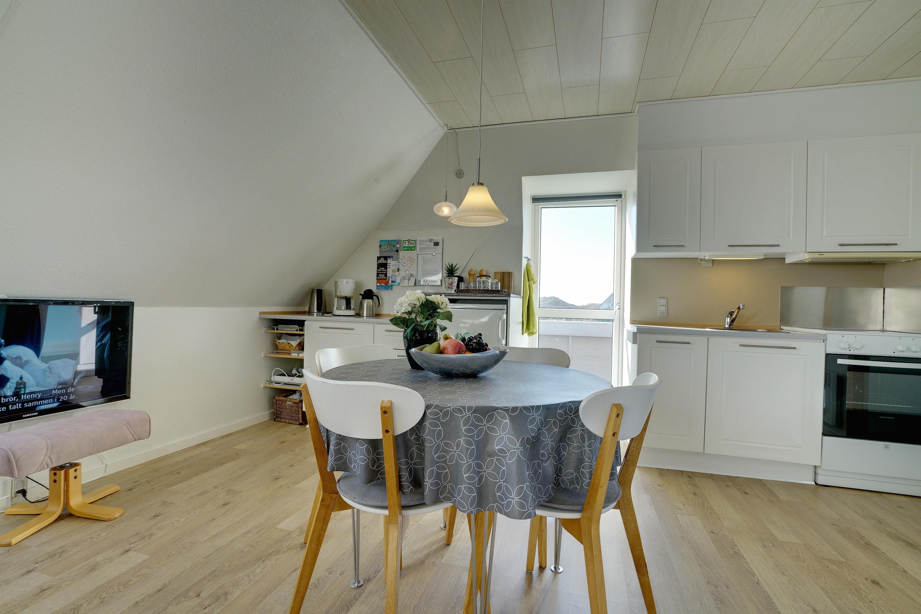Pragtfuld ferielejlighed på 1. sal, der som den eneste på Nordsø Klit har vestvendt altan, hvilket giver en unik udsigt til både hav og klitter samt byen. Den høje beliggenhed i klitterne giver en pragtfuld udsigt 270 grader rundt. Lejligheden fremtræder lys, har en personlig indretning. SONOS Sound system og Cromecast til TV.