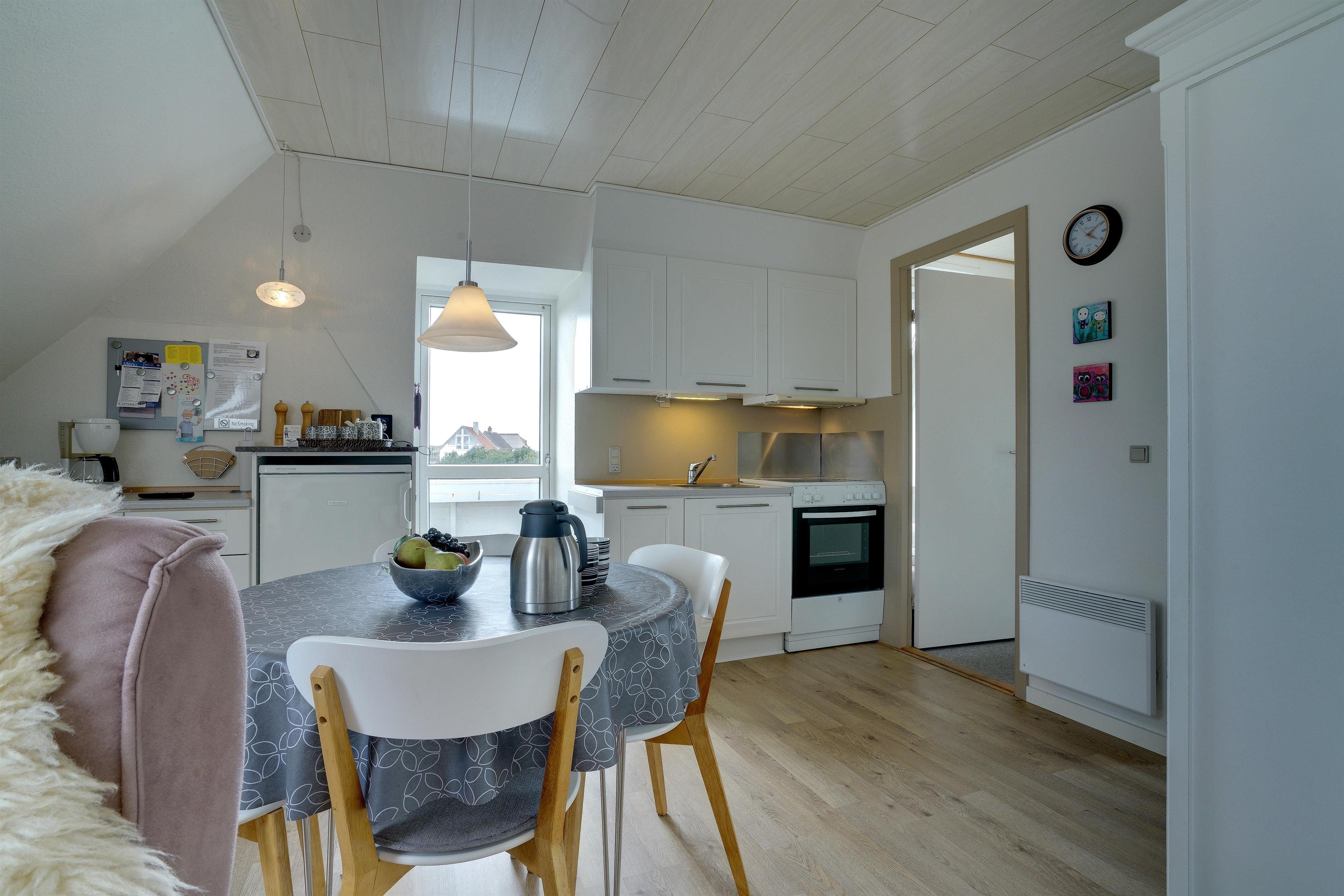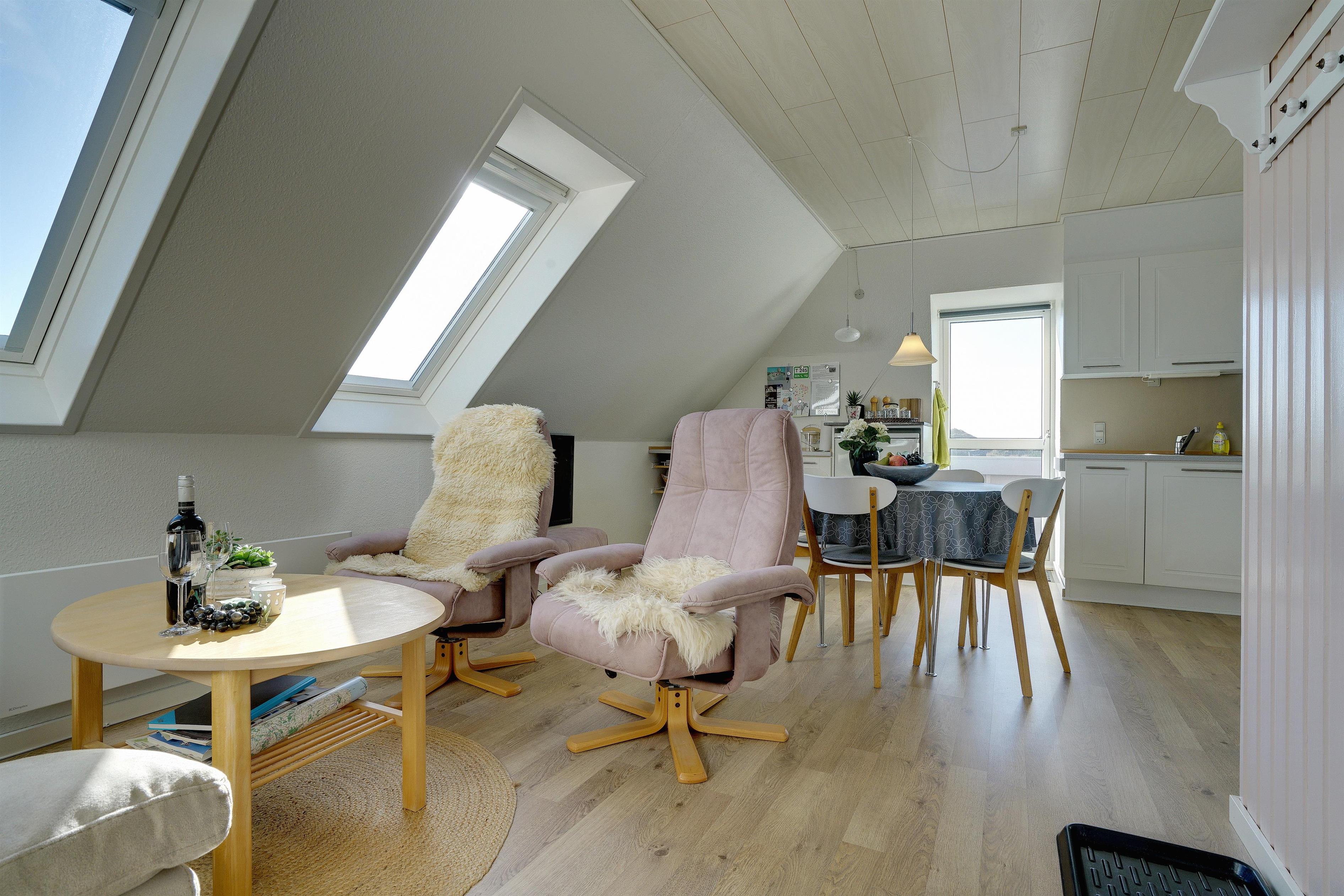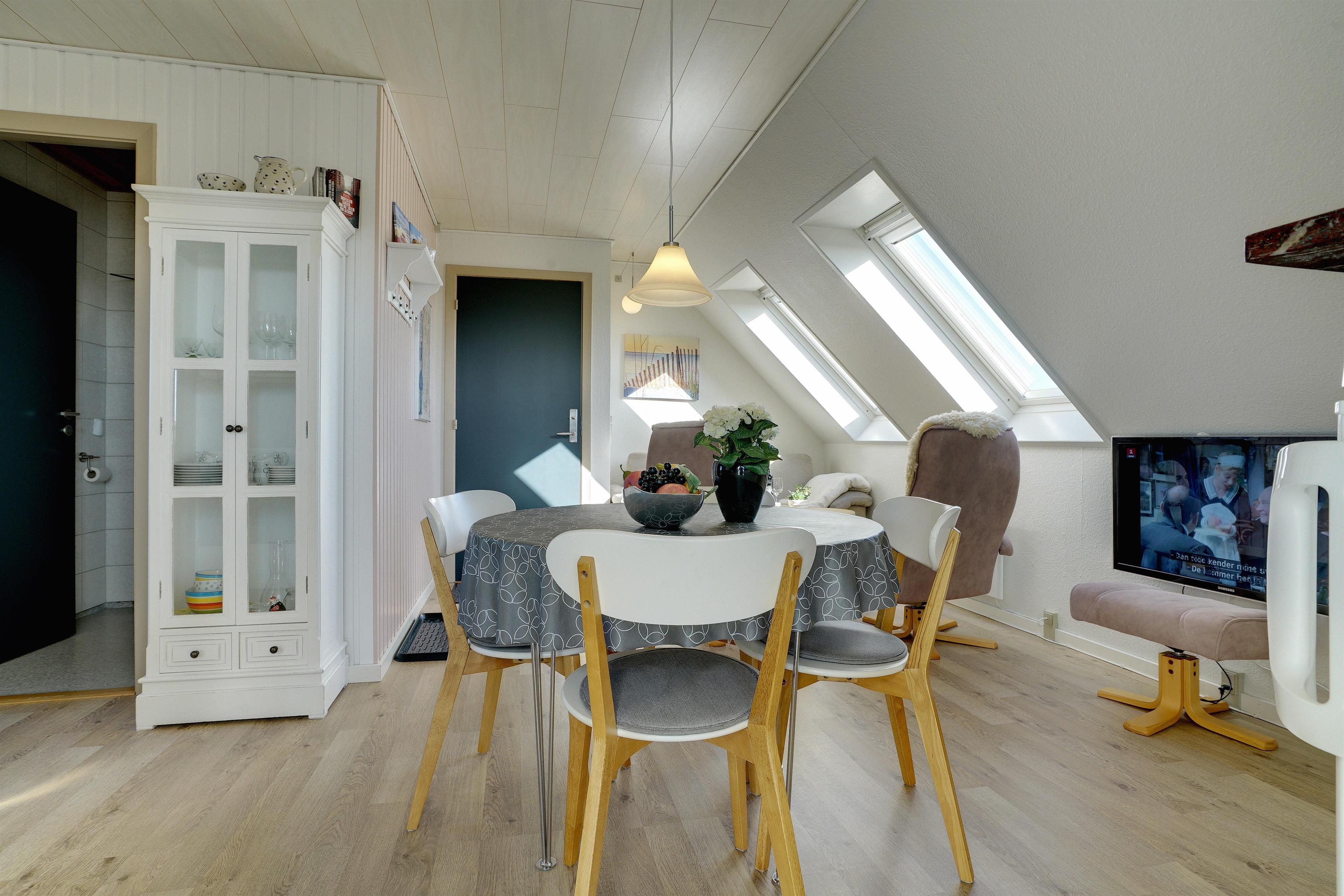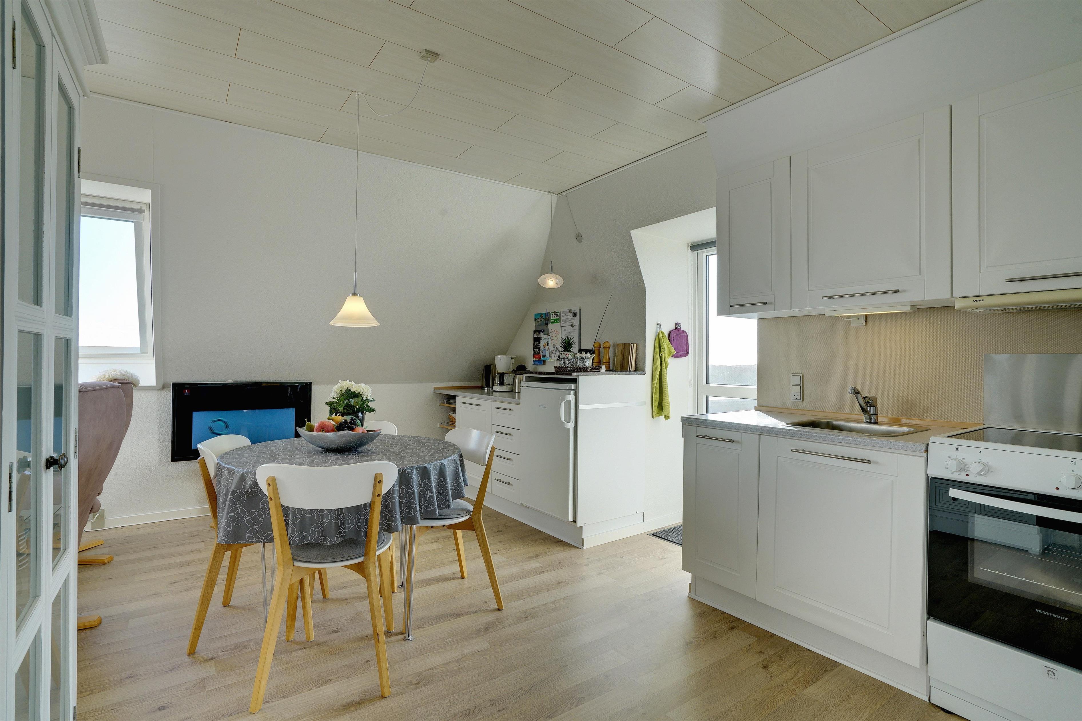 Pragtfuld ferielejlighed på 1. sal, der som den eneste på Nordsø Klit har vestvendt altan, hvilket giver en unik udsigt til både hav og klitter samt byen. Den høje beliggenhed i klitterne giver en pragtfuld udsigt 270 grader rundt. Lejligheden fremtræder lys, har en personlig indretning. SONOS Sound system og Cromecast til TV.