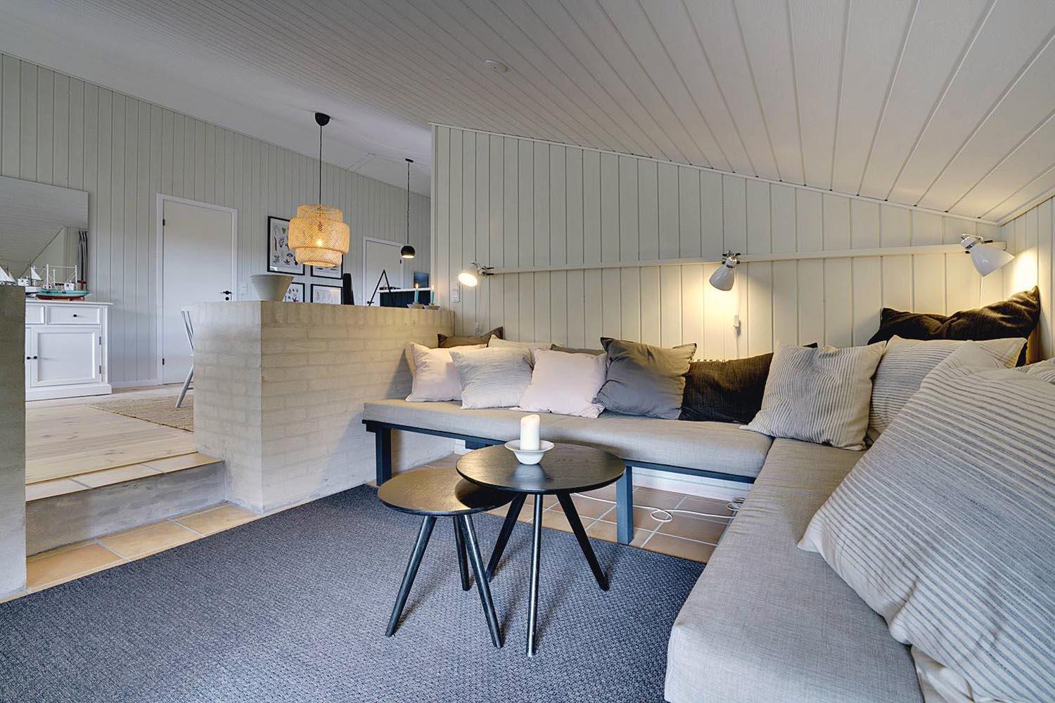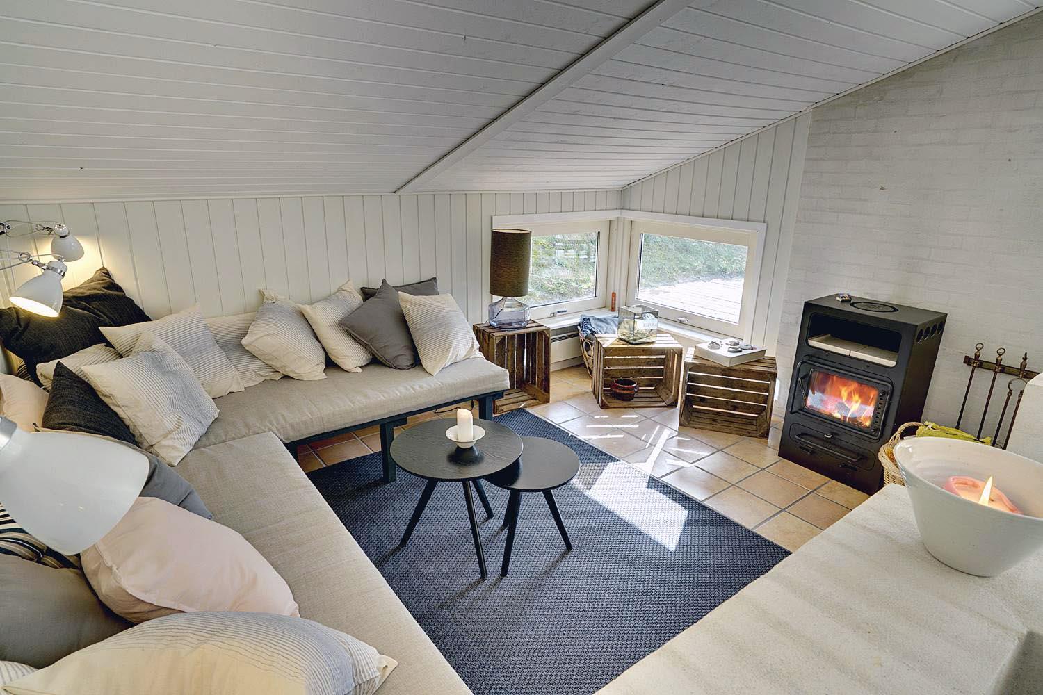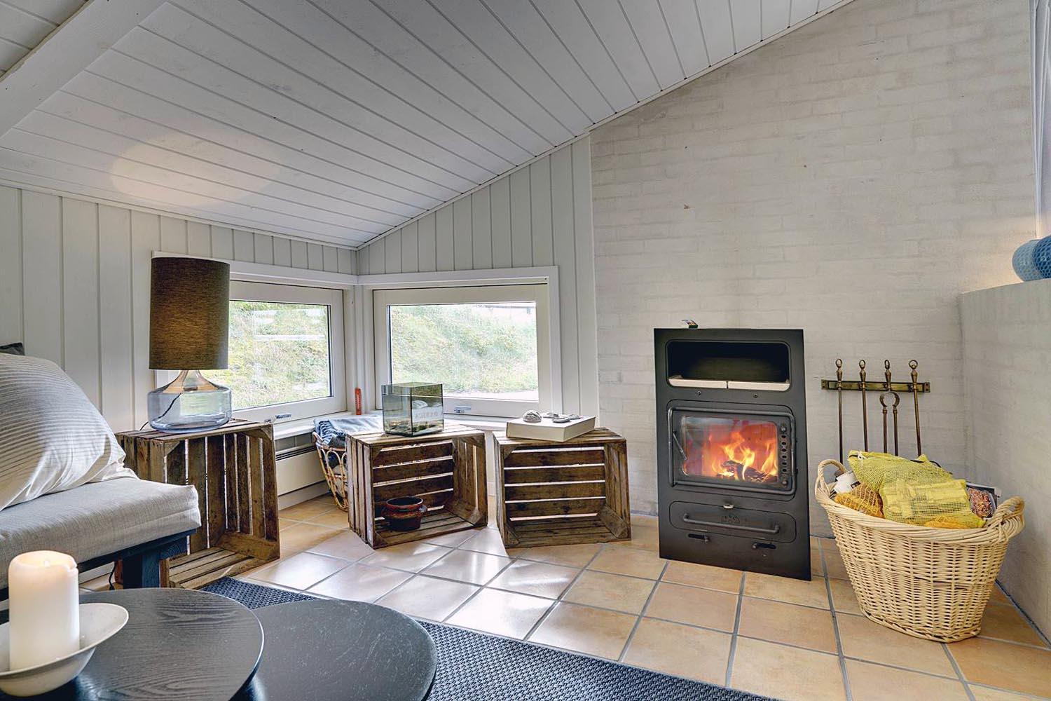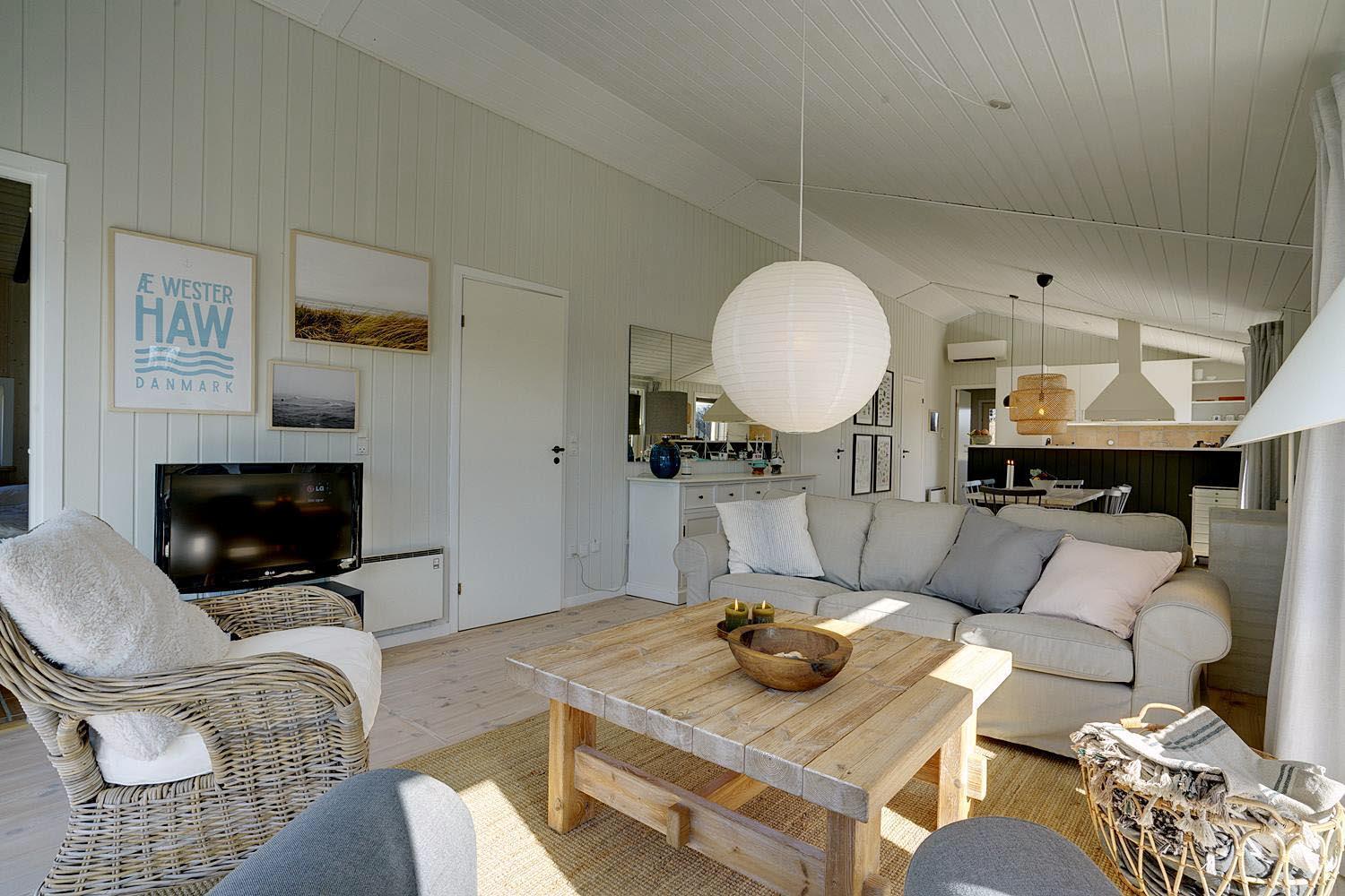"Klithytten" er navnet på huset, og det byder på rigelige mængder af sommerhusstemning, der særligt kan opleves i den nedsænkede stue med brændeovn, bløde møbler og store vinduer med et flot naturligt lysindfald. Huset fremstår meget lyst og velholdt. Der er plads til seks sovende gæster, som kan fordele sig i to værelser med dobbeltsenge og to værelser med enkeltsenge. Endelig er der to badeværelser i huset begge med brusebad.