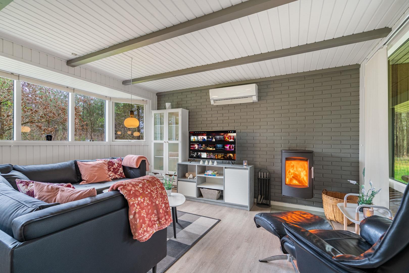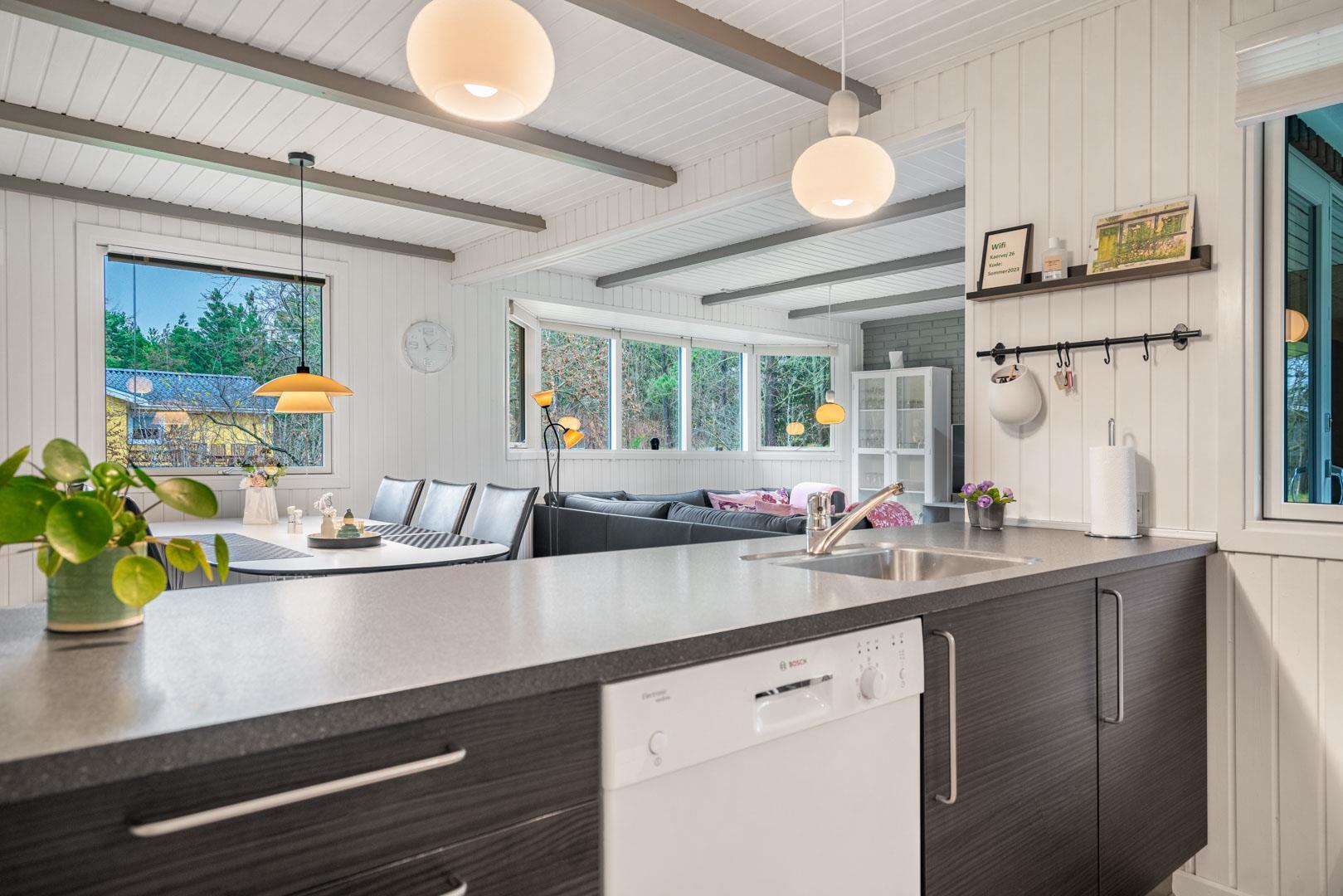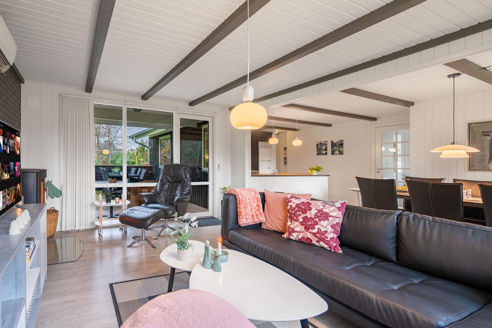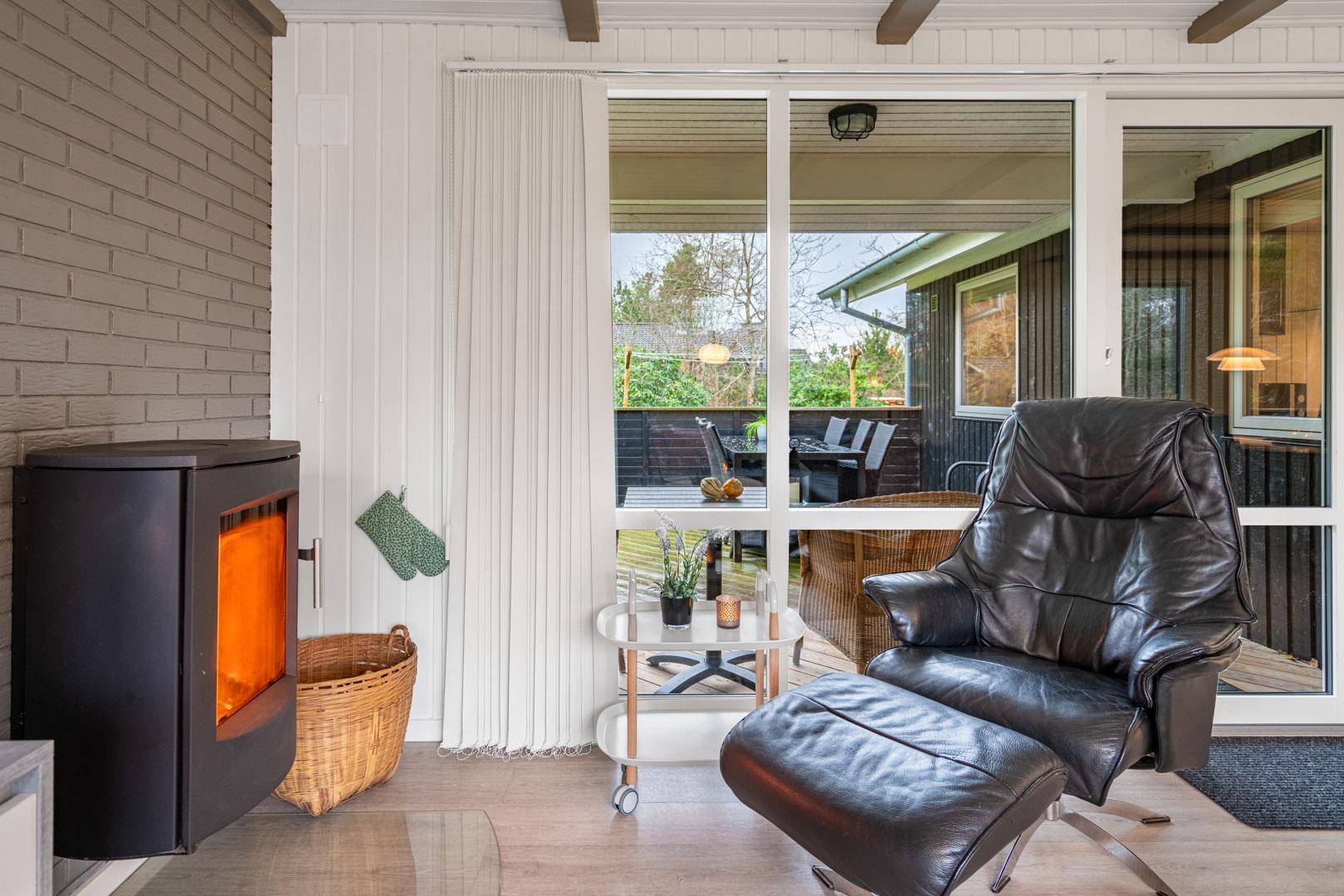 Huset byder på et nyere, flot badeværelse med badekar, hvor du kan forkæle dig selv efter en dag med aktiviteter. Det veludstyrede køkken er ideelt til at tilberede lækre måltider, og den åbne forbindelse til stuen skaber et lyst og indbydende rum. Stuen er smagfuldt indrettet med komfortable møbler og en brændeovn, der sikrer hygge og varme på de kølige aftener.
