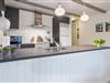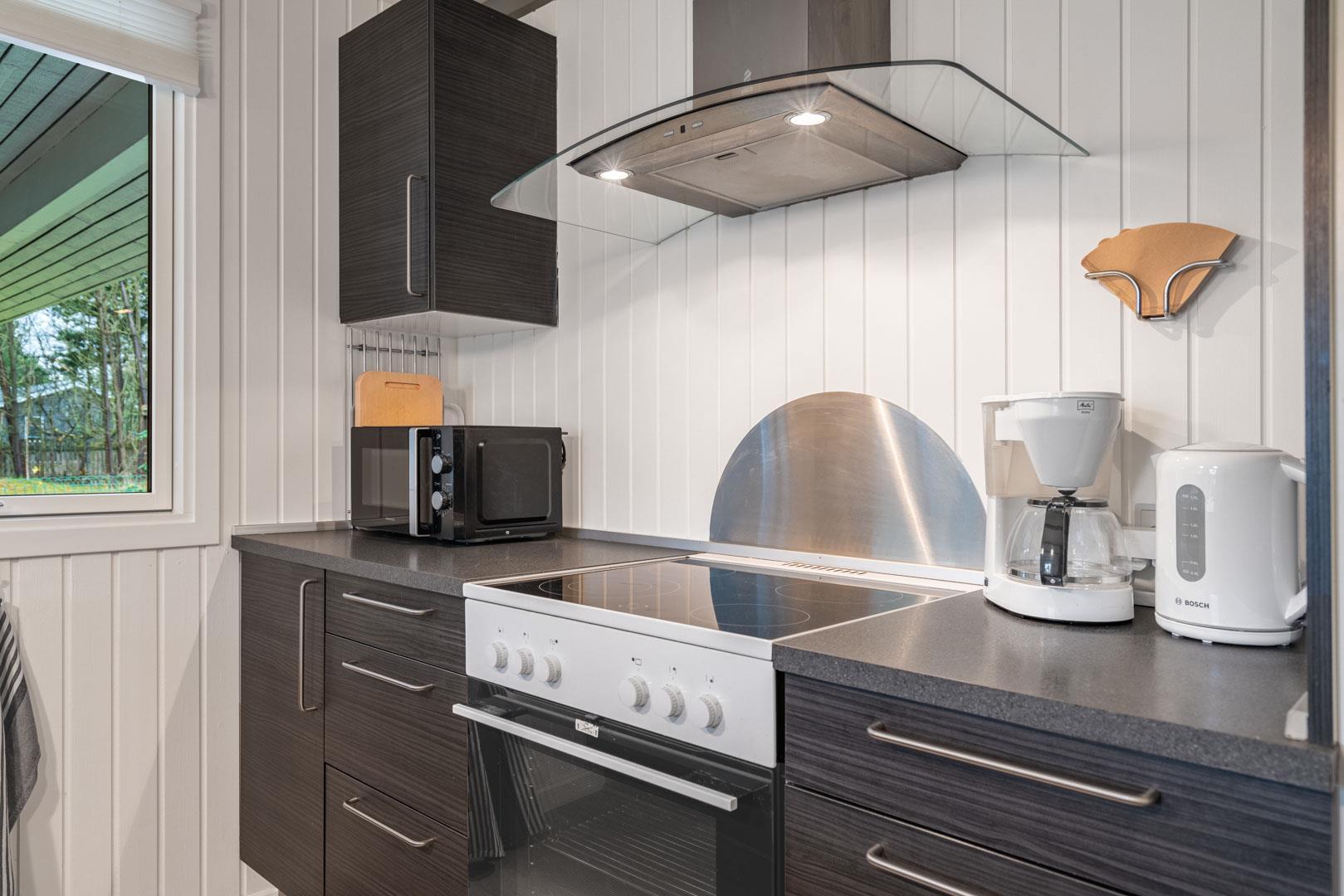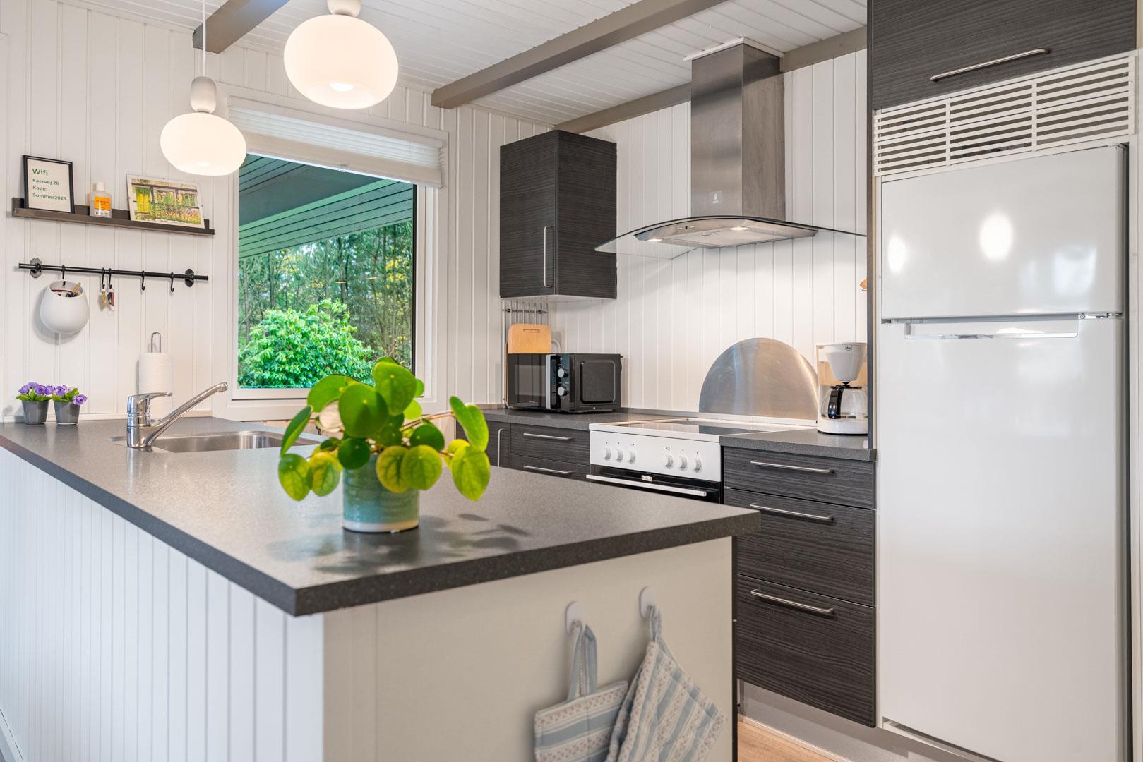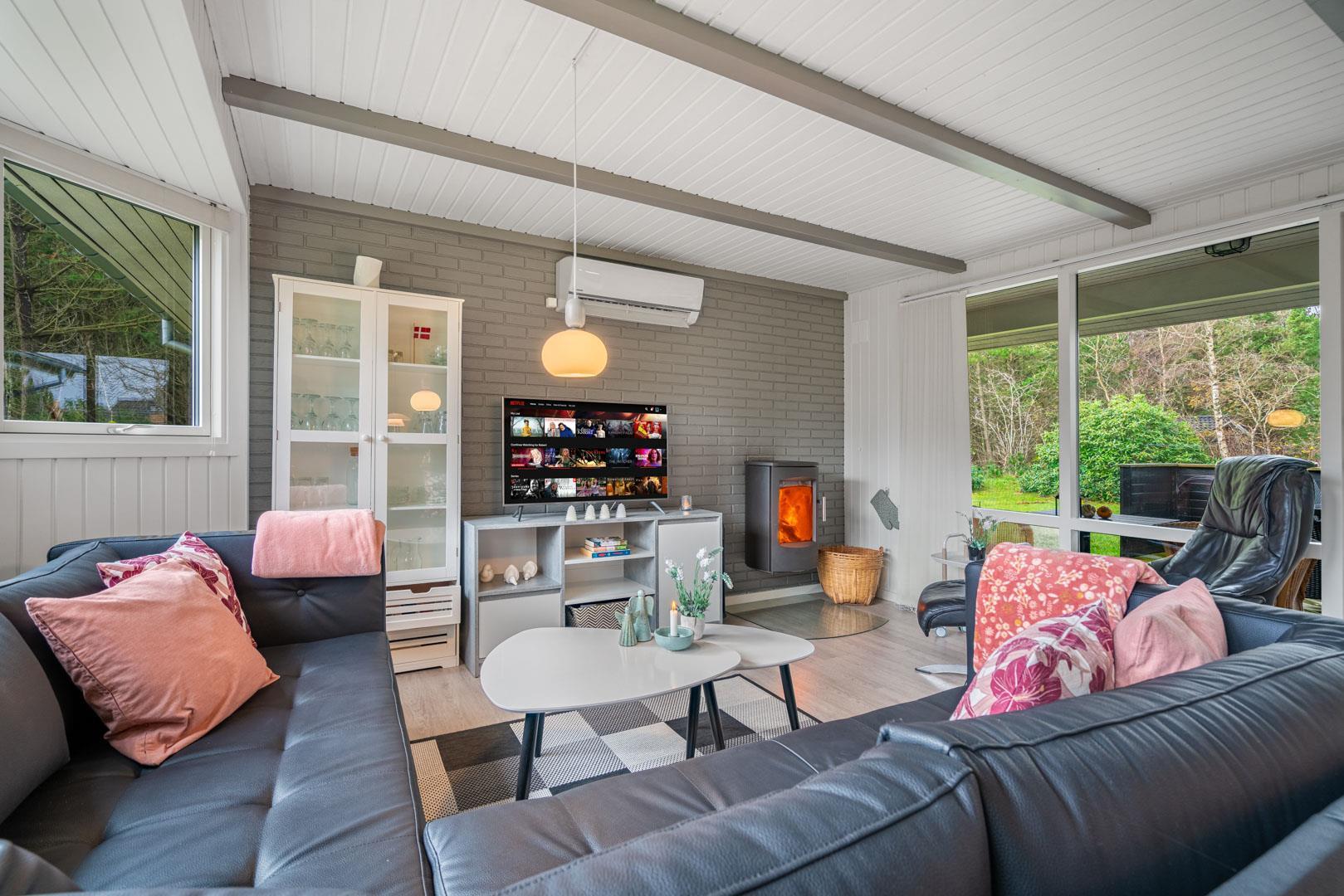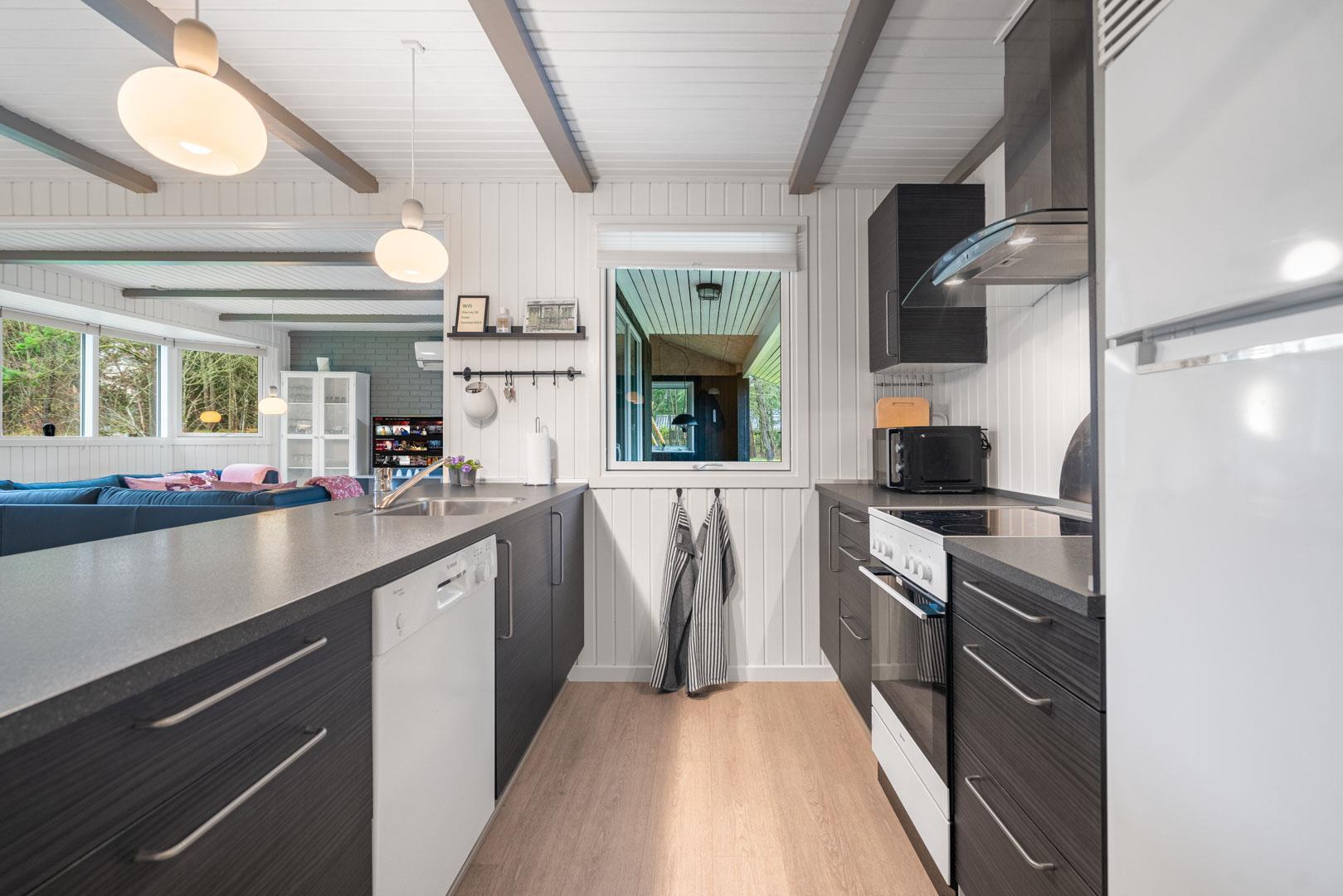 Huset byder på et nyere, flot badeværelse med badekar, hvor du kan forkæle dig selv efter en dag med aktiviteter. Det veludstyrede køkken er ideelt til at tilberede lækre måltider, og den åbne forbindelse til stuen skaber et lyst og indbydende rum. Stuen er smagfuldt indrettet med komfortable møbler og en brændeovn, der sikrer hygge og varme på de kølige aftener.