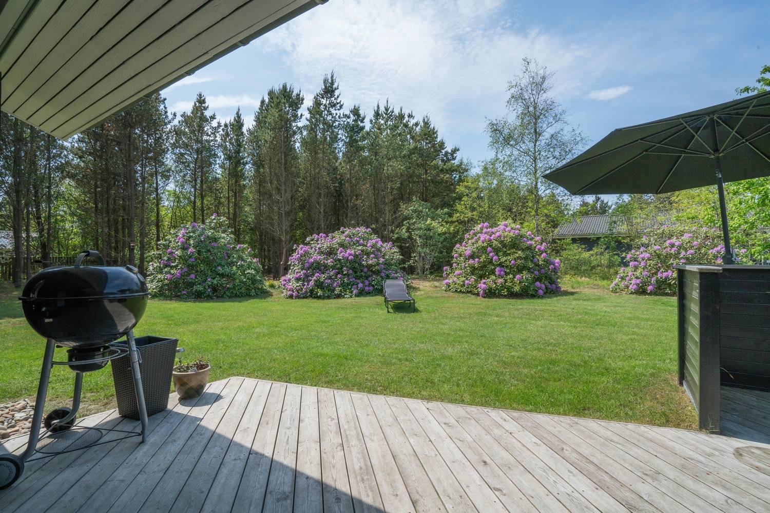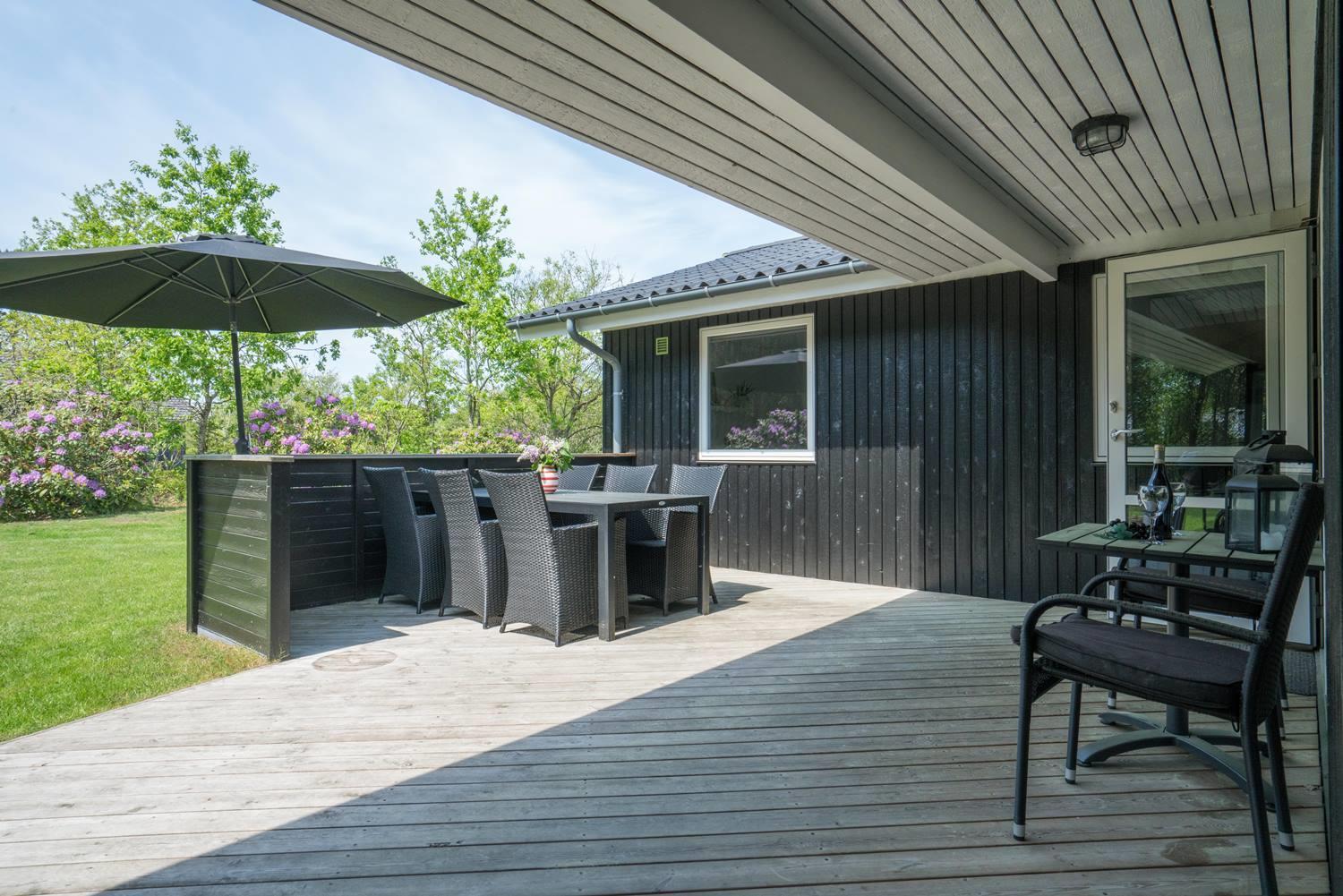 Fra stuen er der direkte udgang til en pragtfuld træterrasse, som er delvist overdækket og helt ugeneret. Her kan du nyde solen, slappe af med en god bog eller tage på grillaftener med familien i private omgivelser.