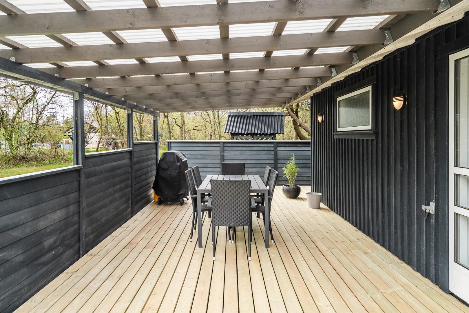 Stor grund med lækker delvis overdækket træterrasse, som forlænger de dejlige sommeraftener.
