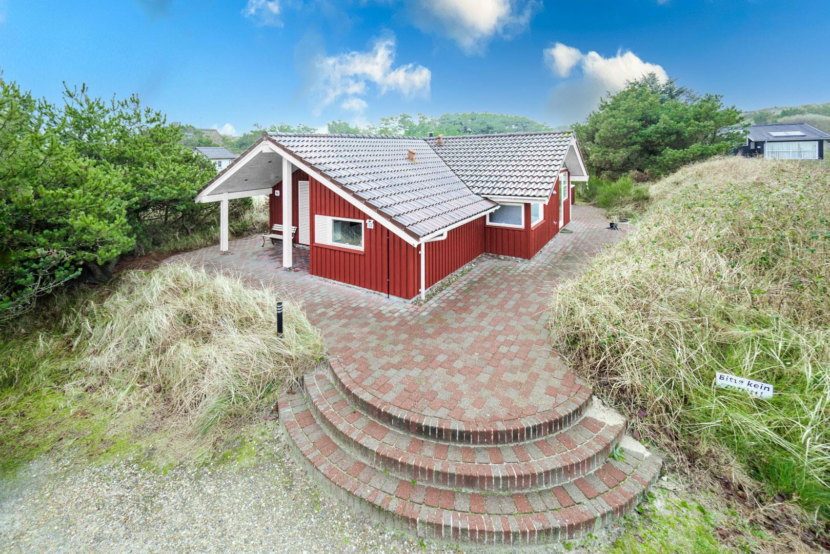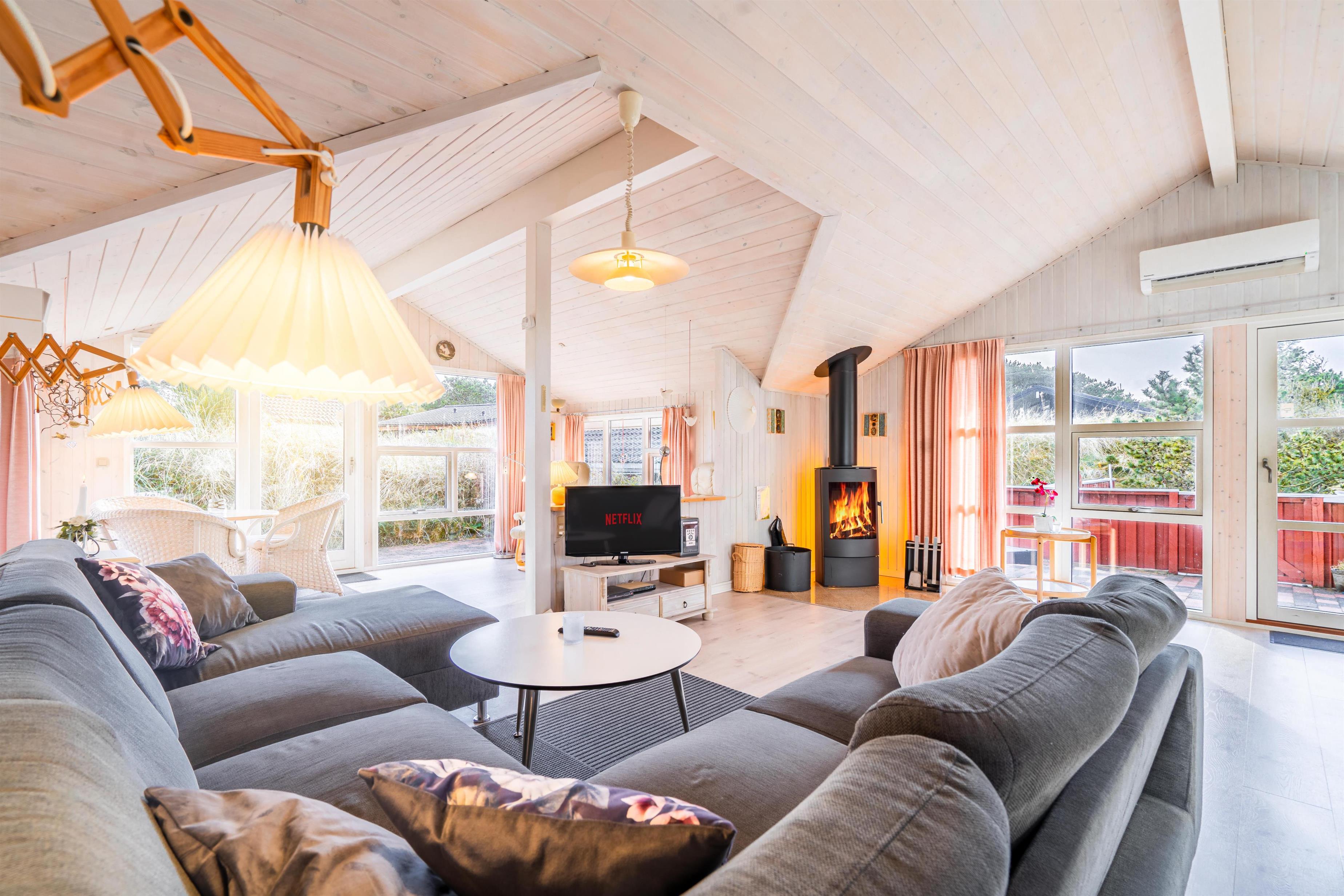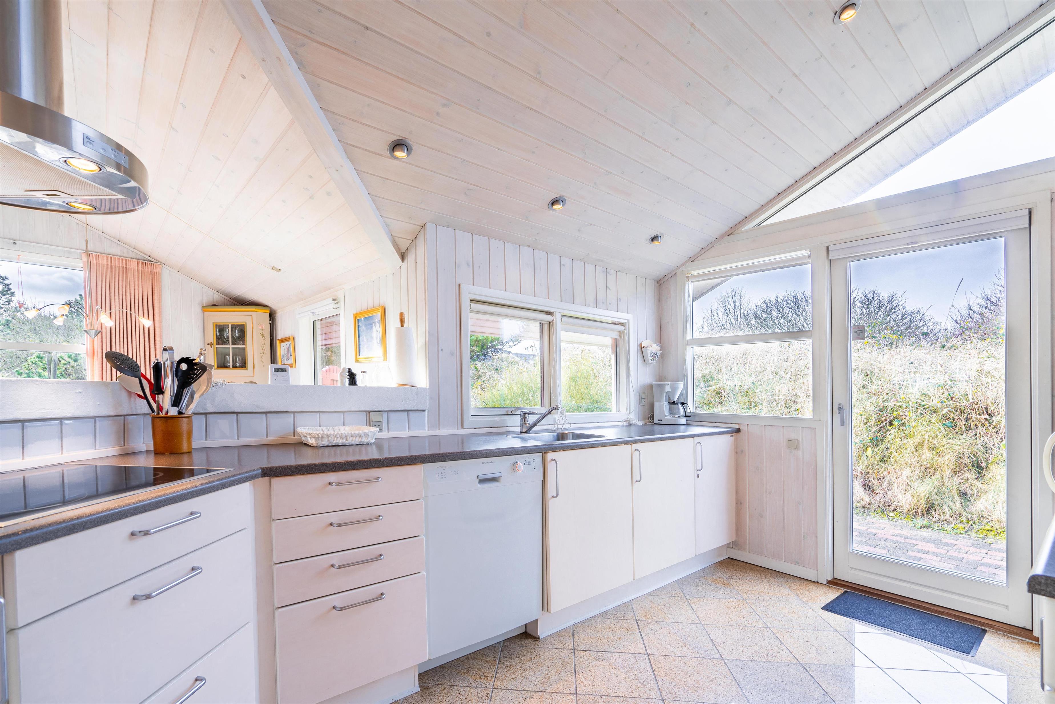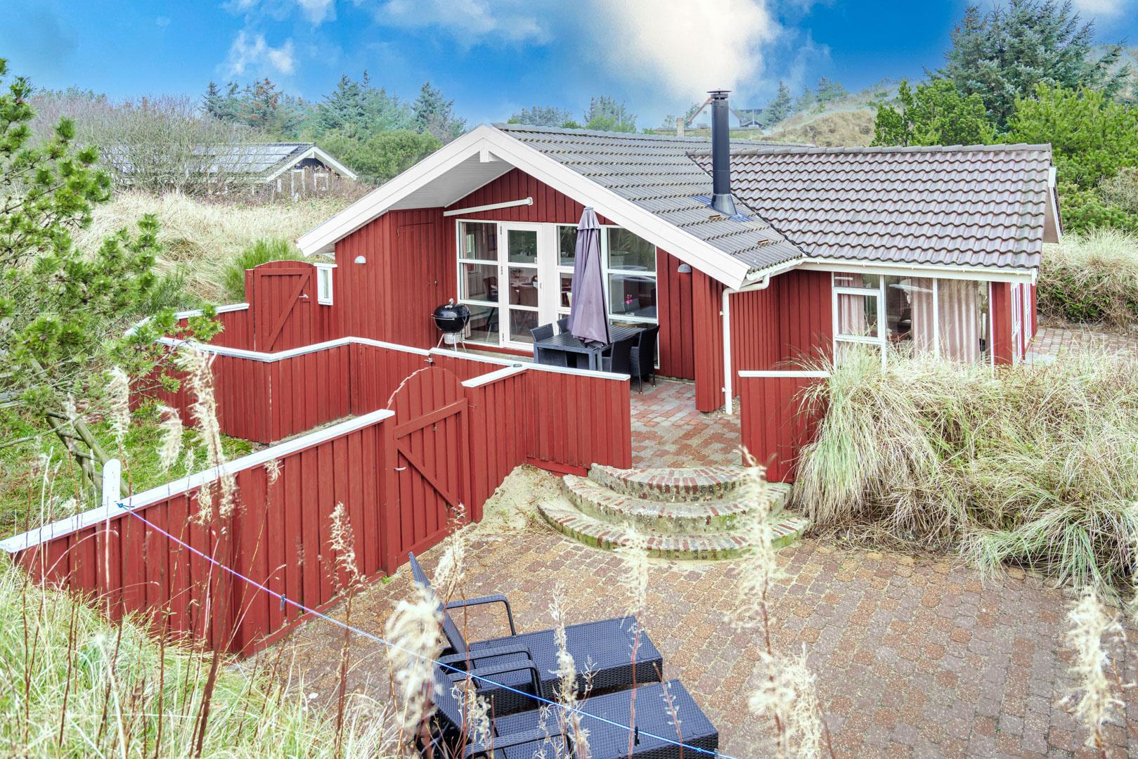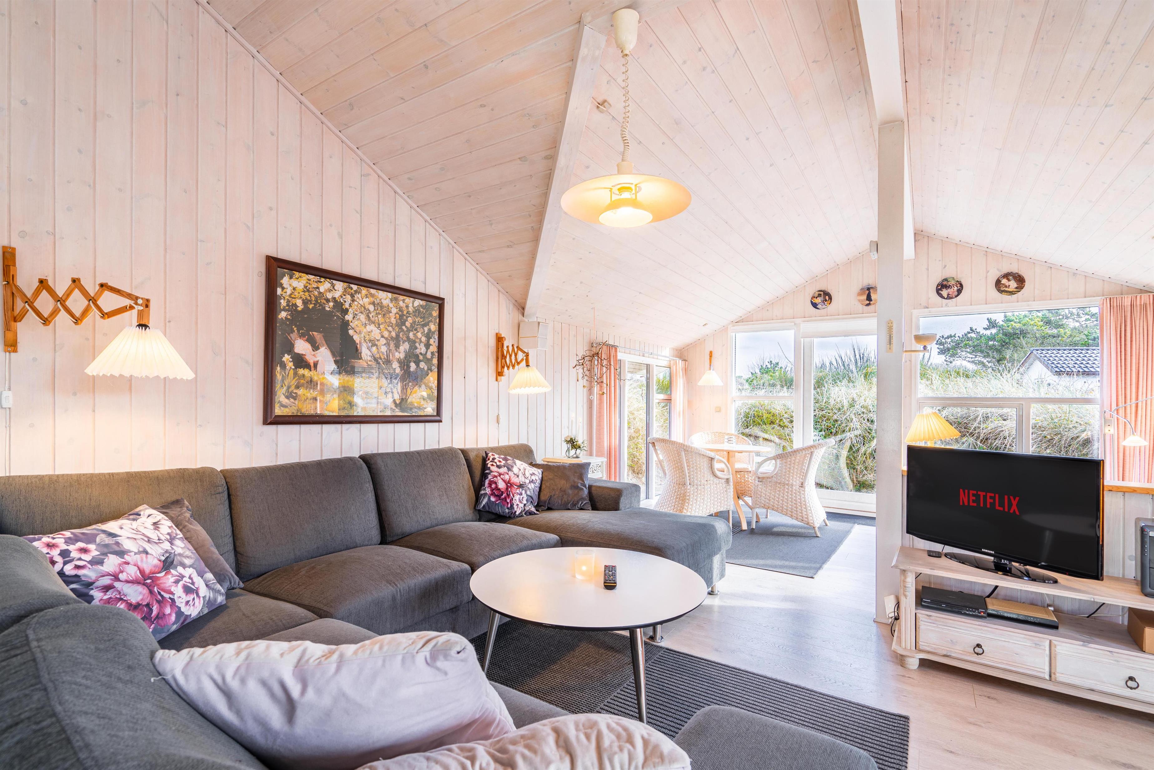 På en kuperet klitgrund ligger dette dejlige og personlige indrettede feriehus med udestue. Huset fremstår meget velholdt og i super stand og er indrettet med pæne og bekvemme møbler. Flot badeværelse med spa og sauna.Fra stuen, udestuen og køkken er der udgang til det store terrasse areal der er omkring hele huset, her er der altid mulighed for at finde en lækrog, hvor den skønne natur og solen kan nydes. I 2015 er der kommet trægulve overalt.