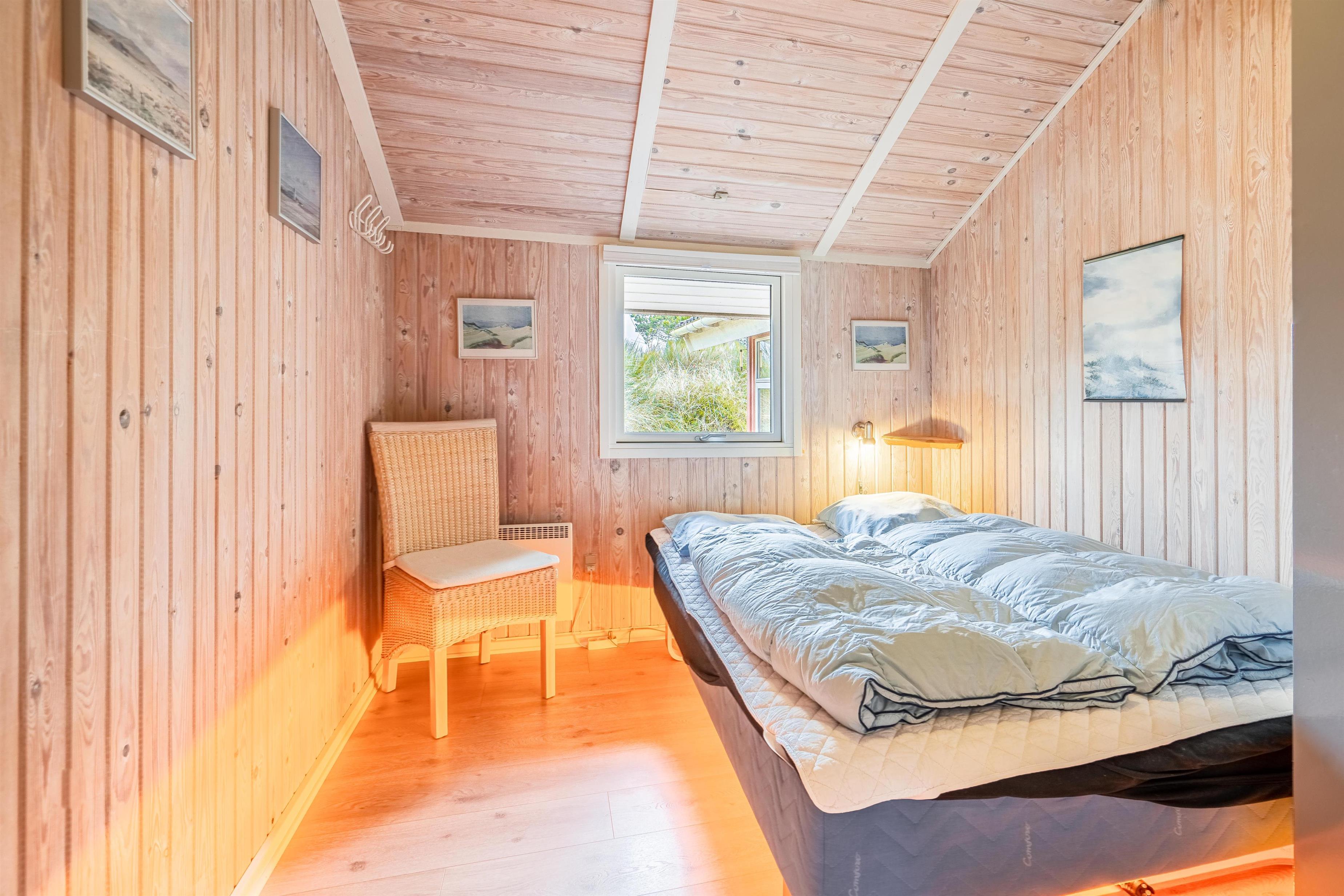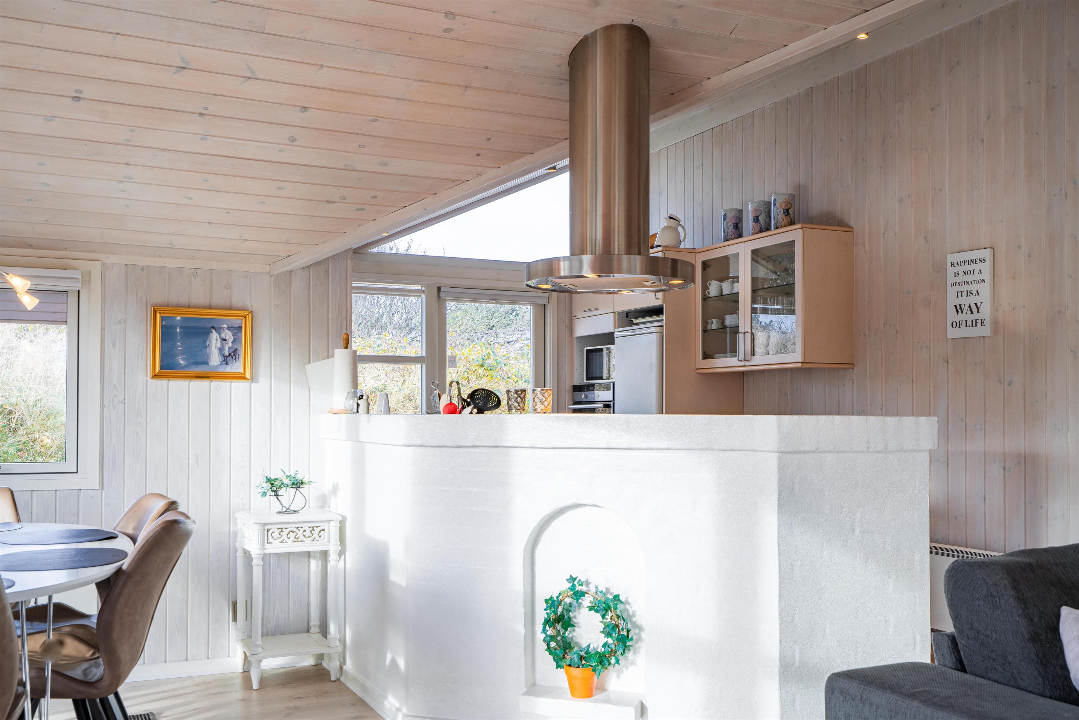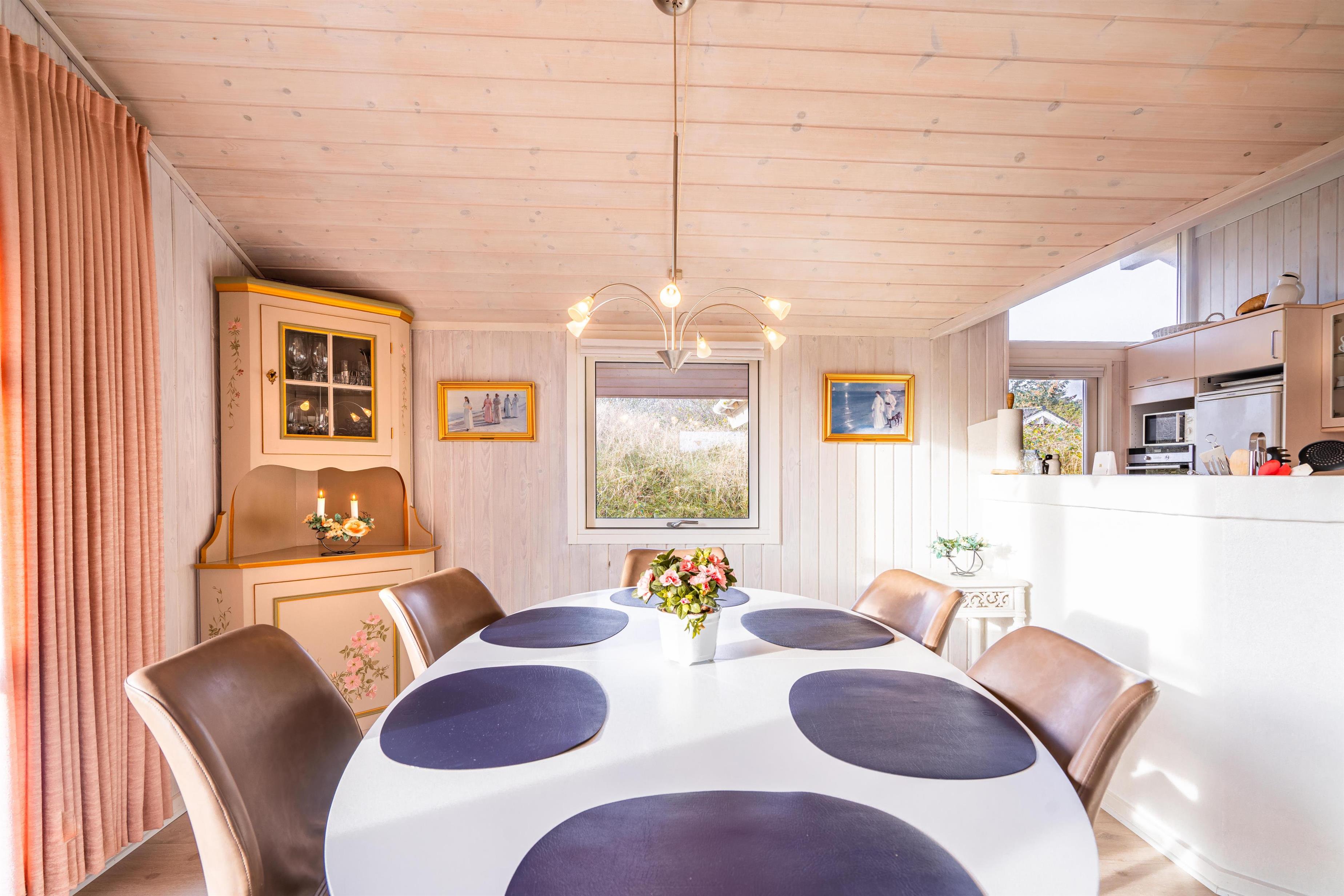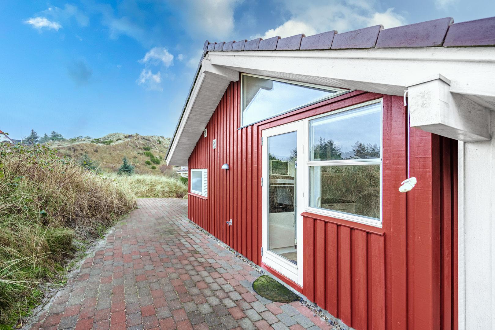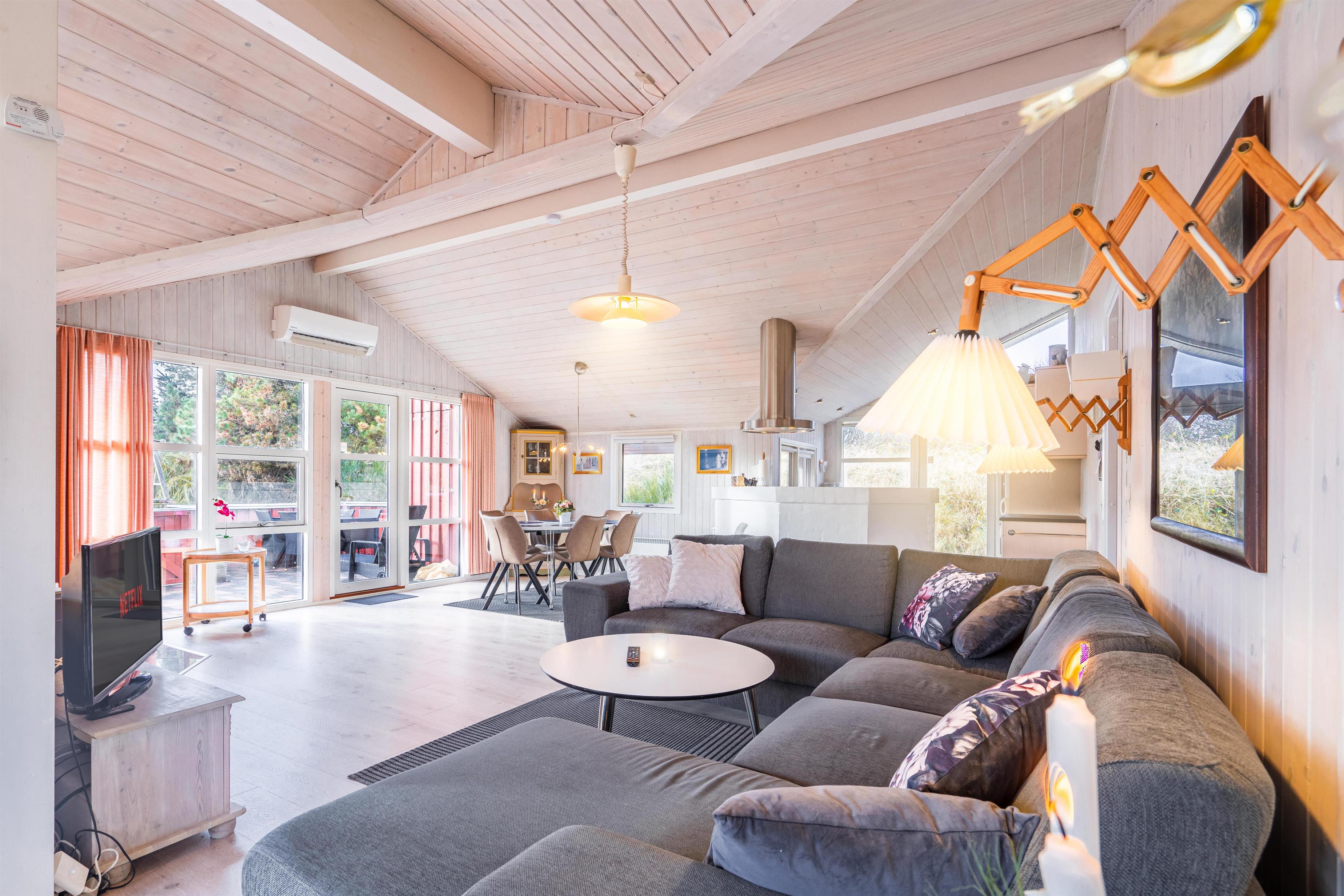 På en kuperet klitgrund ligger dette dejlige og personlige indrettede feriehus med udestue. Huset fremstår meget velholdt og i super stand og er indrettet med pæne og bekvemme møbler. Flot badeværelse med spa og sauna.Fra stuen, udestuen og køkken er der udgang til det store terrasse areal der er omkring hele huset, her er der altid mulighed for at finde en lækrog, hvor den skønne natur og solen kan nydes. I 2015 er der kommet trægulve overalt.